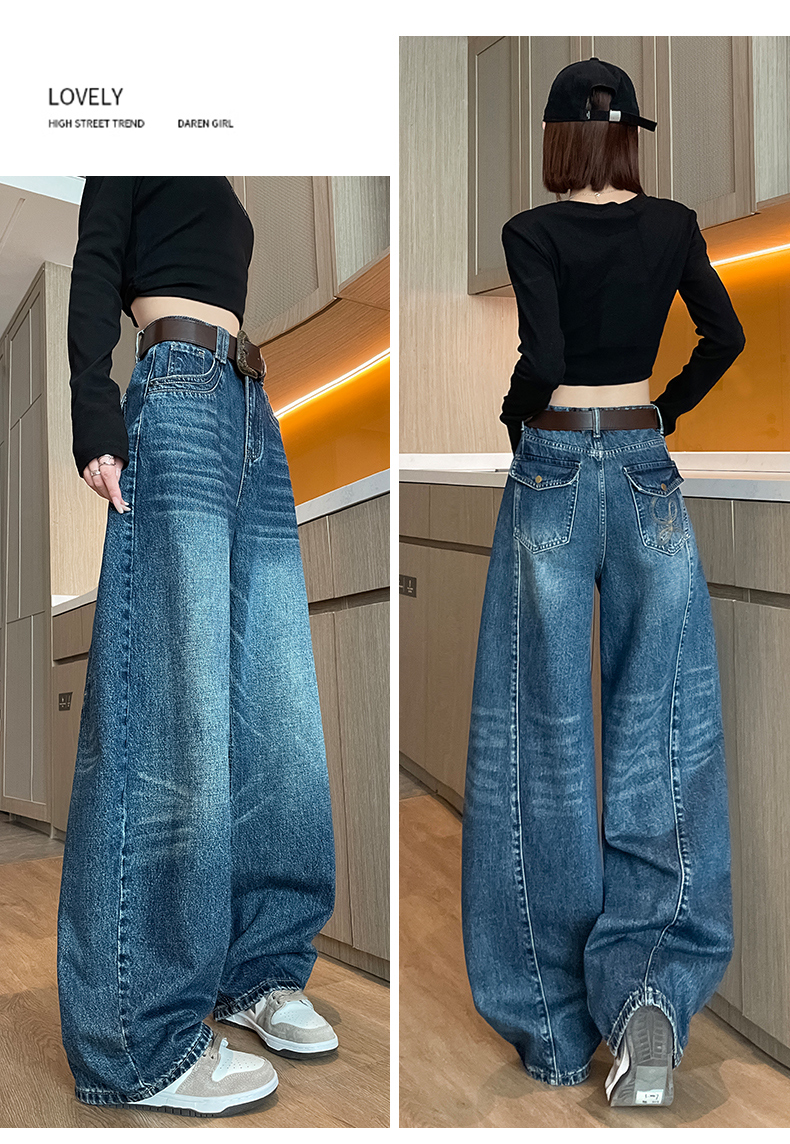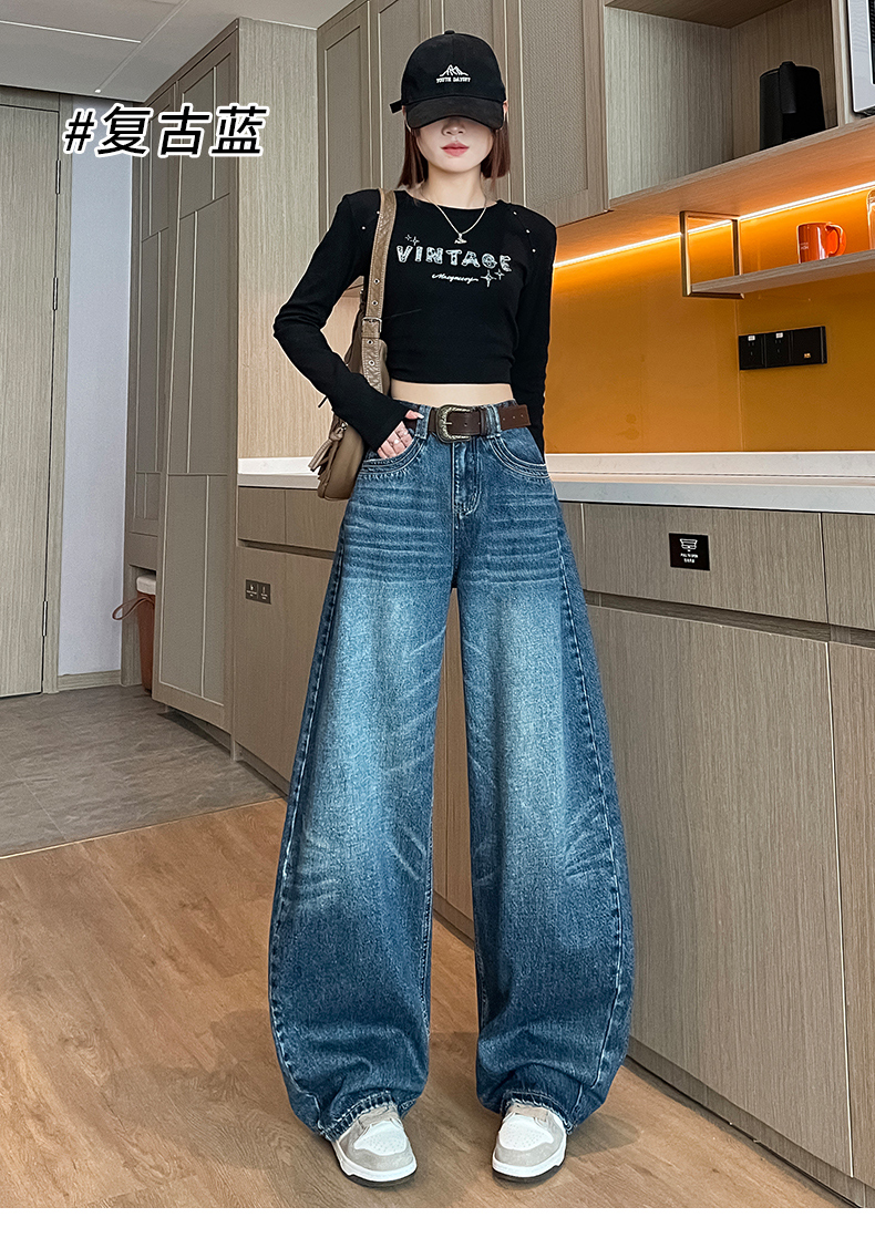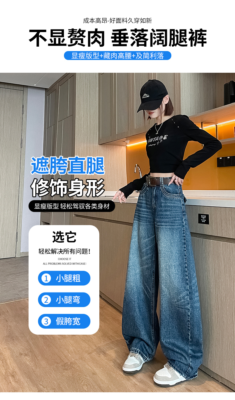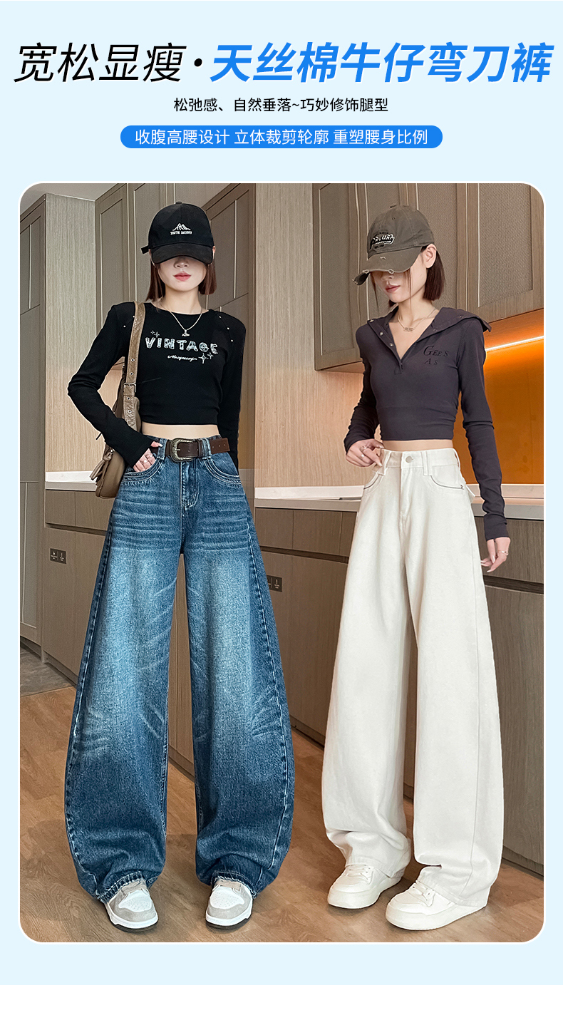 실사 단 닝 블루 모통이 칼 넓은 다리 청바지 여성 봄 2026 새로운 하이웨이스트 슬림해 보이는 다용도 루즈핏 바닥 청소 바지