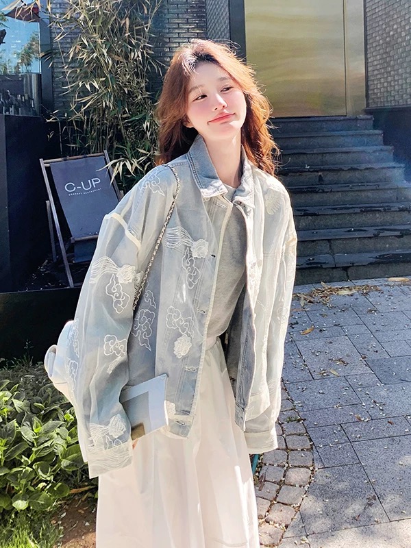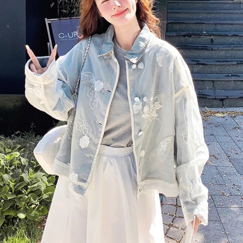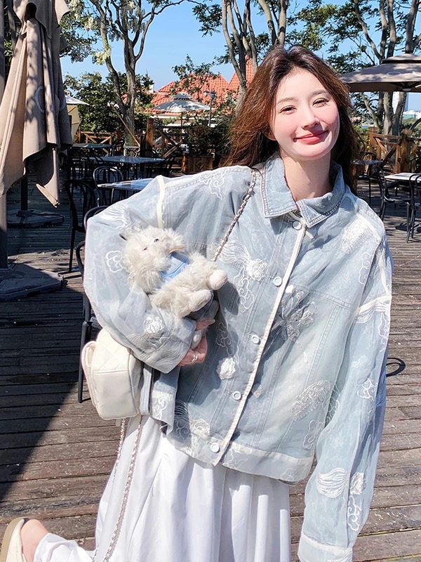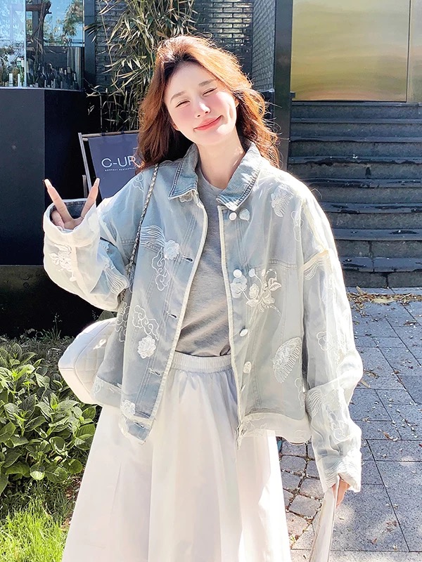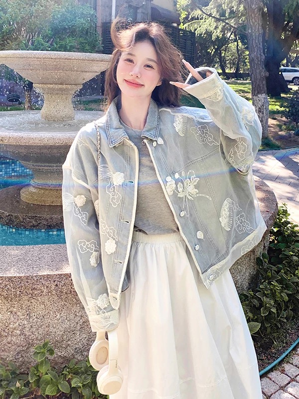 꿀 실크 어린이 양 2026 새로운 작은 대중 미니멀리즘 고급 레트로 워싱 데님 하이웨이스트 허리 수축 긴팔 재킷 맨위