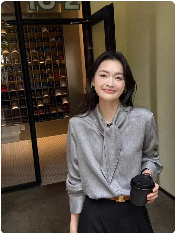 lickysenior 주간 실크 양모 얇은 부드러운 여성 셔츠 봄 여름 긴팔 고급 센스 빛 럭셔리 연령 감소 외국 가스 셔츠