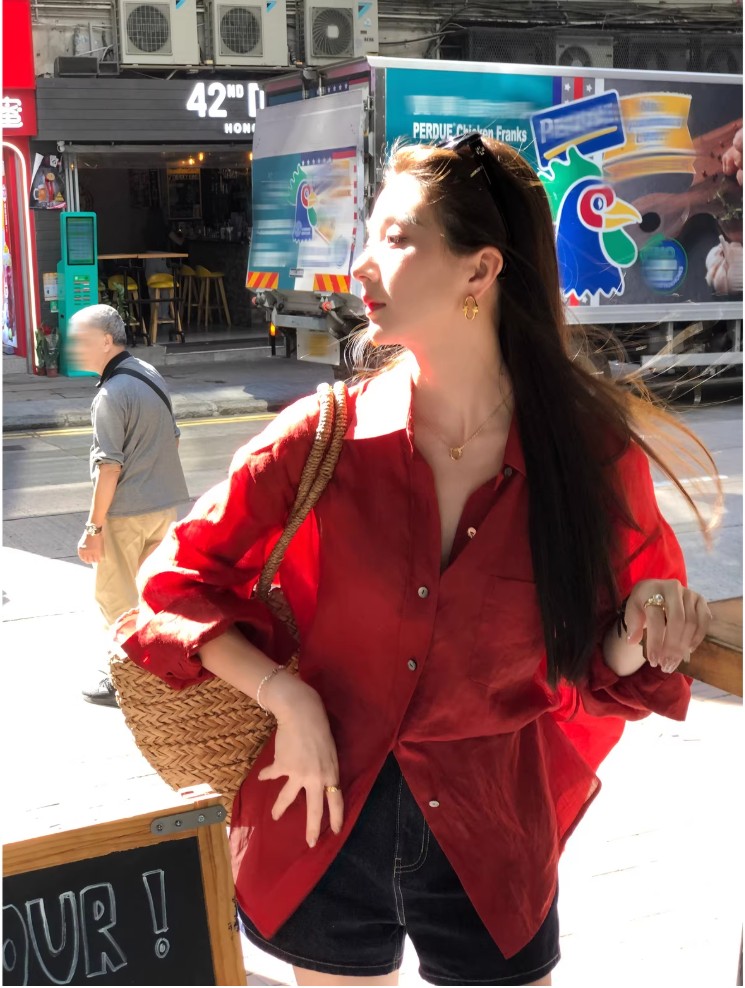 여름 시 전체 라미 주름 질감 센스 빨간색 셔츠 레트로 폴로 칼라 느슨함 바람 루즈핏 가을 어깨 소매 맨위