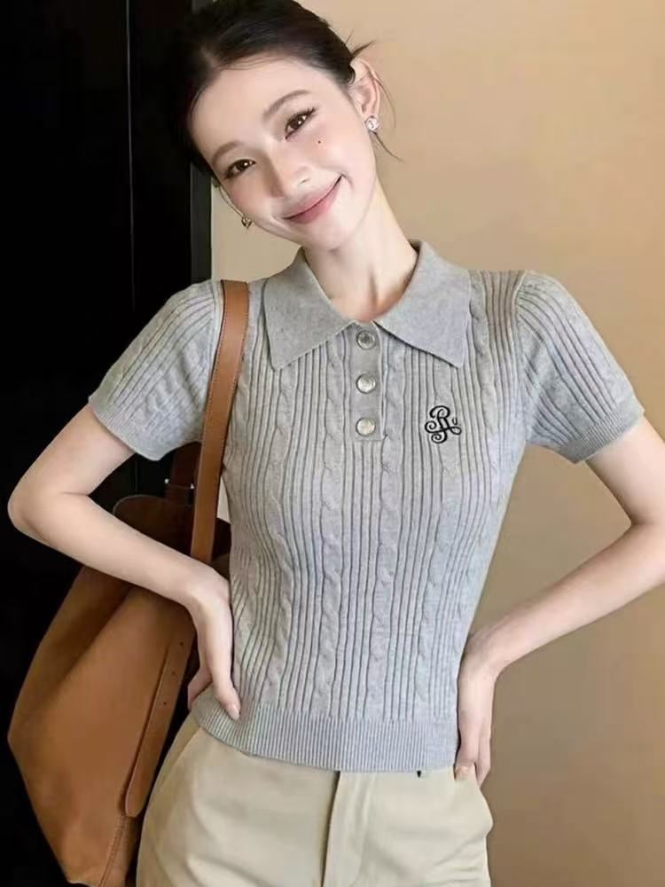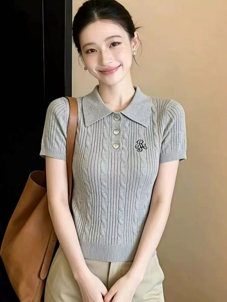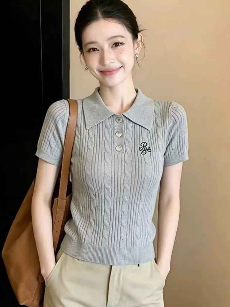 홀로우 아웃 얇은 스타일 POLO 칼라 니트 스웨터 니트 반팔 여성 의류 2026 새로운 여름 몸매 가꾸기 폴로 칼라 쇼트 스타일 맨위