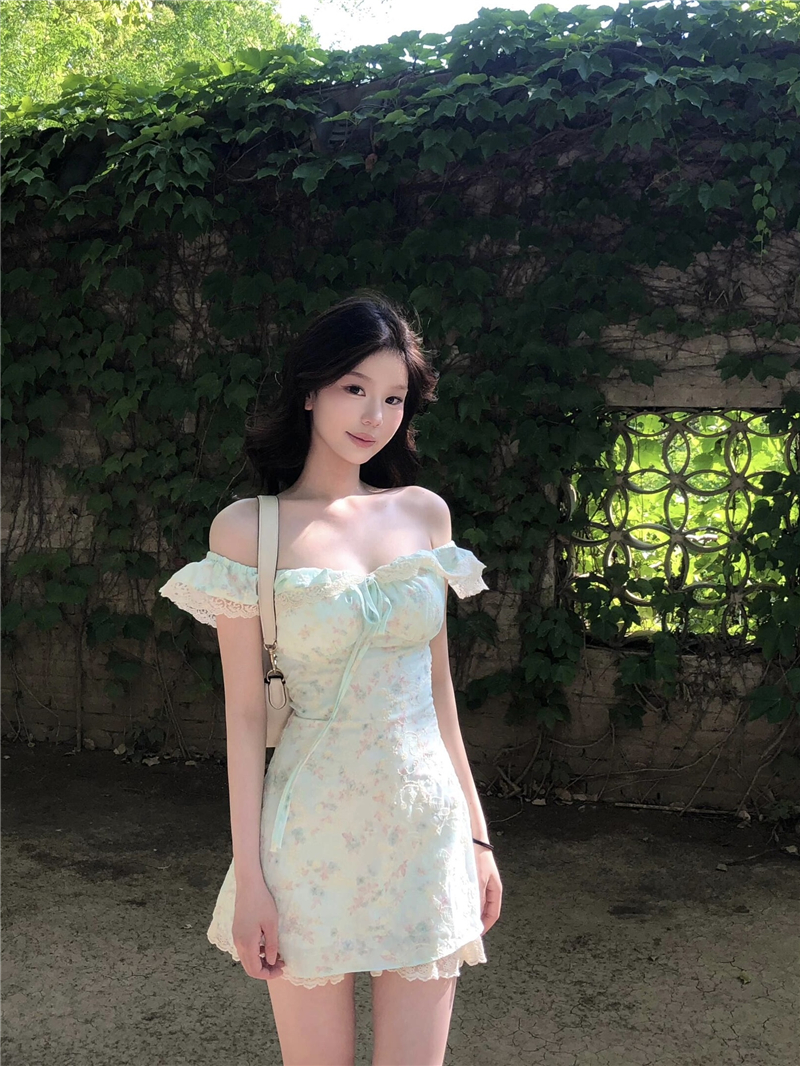 달콤함 박하 녹색 작은 날다 소매 허리 수축 퍼프 슬립 꽃무늬 여성 드레스 여름