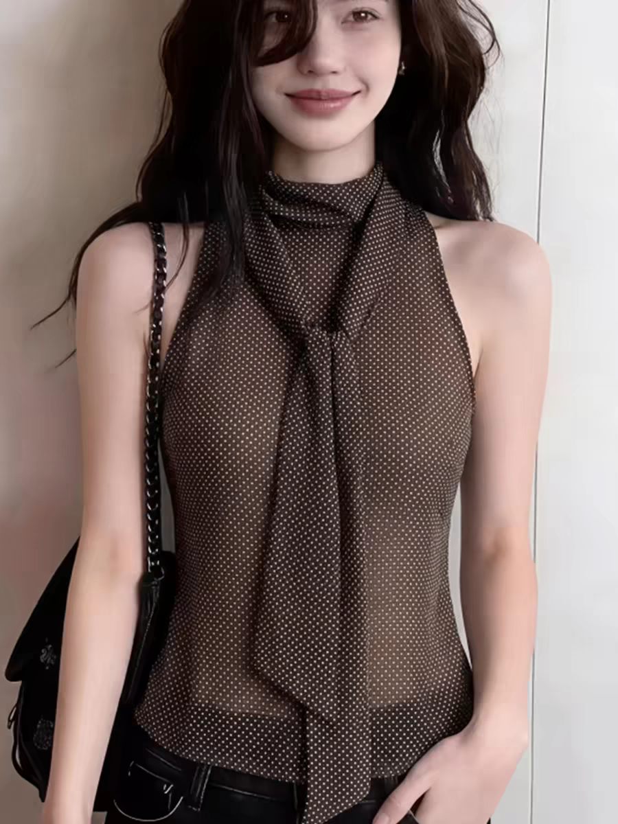 프랑스식 브라운 도트 무늬 레이스업 민소매 어깨 슬립 여성 여름 디자인 센스 몸매 가꾸기 외출용 아름다운 조끼 맨위
