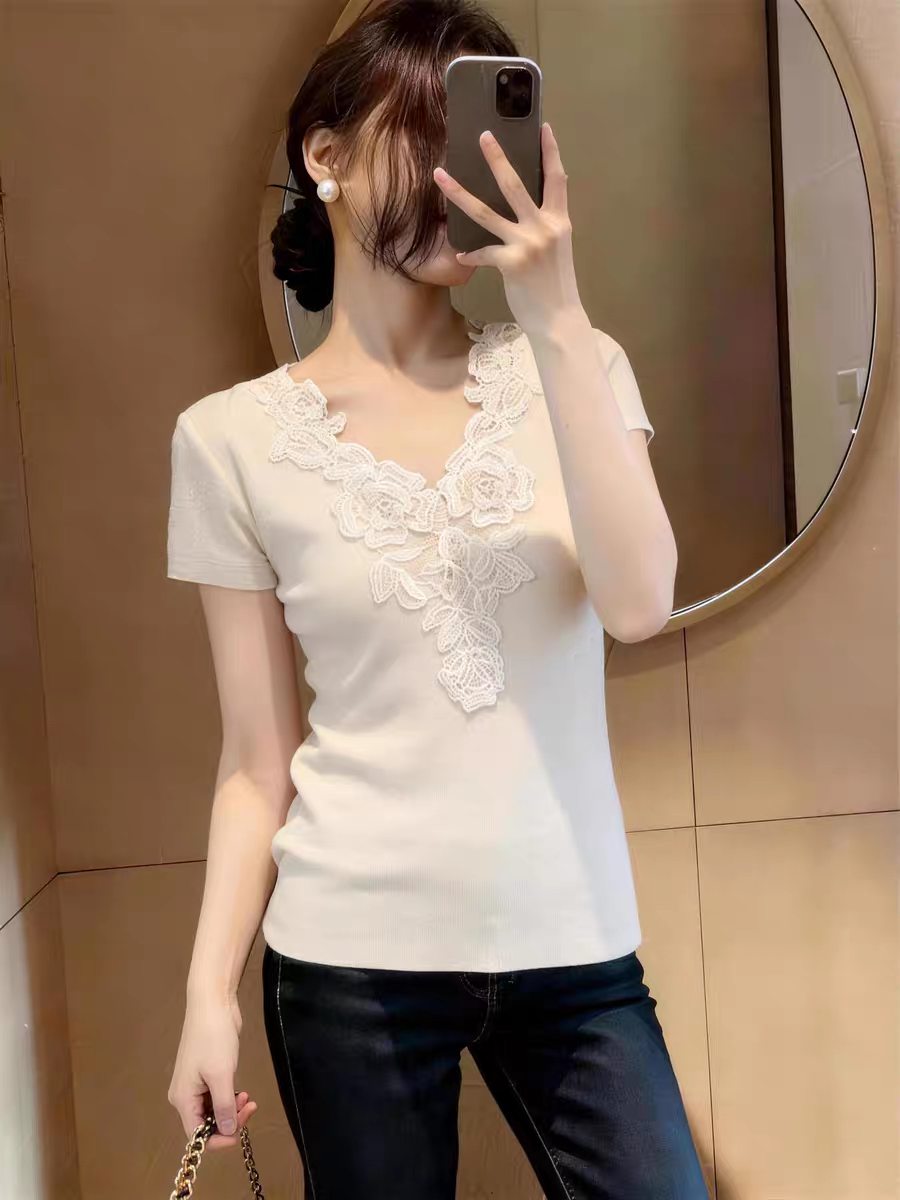 프랑스식 빛 럭셔리 고급 디자인 센스 도트 무늬 반팔 여성 셔츠 고유 한 슈퍼 잘 생긴 몸매 가꾸기 슬림해 보이는 짧은 맨위 여름