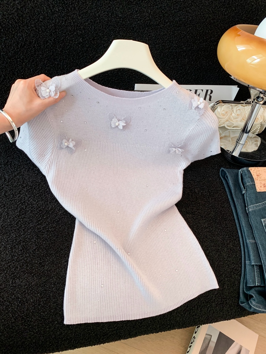 실사 2026 여름 새로운 니트 티셔츠 고온 핫픽스 3 차원 나비 몸매 가꾸기 맨위 빛 럭셔리 고급 센스