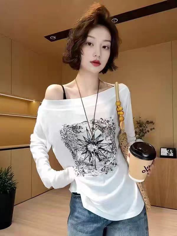 열세 개 아메리칸 레트로 핫걸 프린트 반팔 티셔츠 여성 여름 한국 스타일 슬림해 보이는 몸매 가꾸기 비스듬한 칼라 오프숄더 맨위