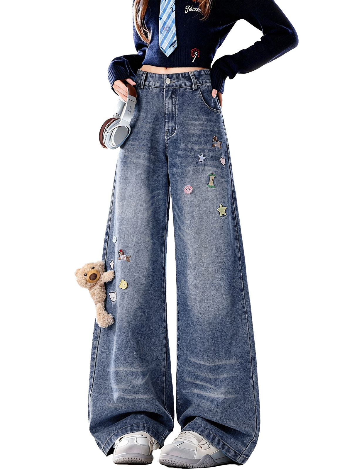 아메리칸 귀여운 작은 곰 펜던트 자수 청바지 여성 봄 가을 새로운 작은 대중 단추 디자인 센스 넓은 다리 길이 바지