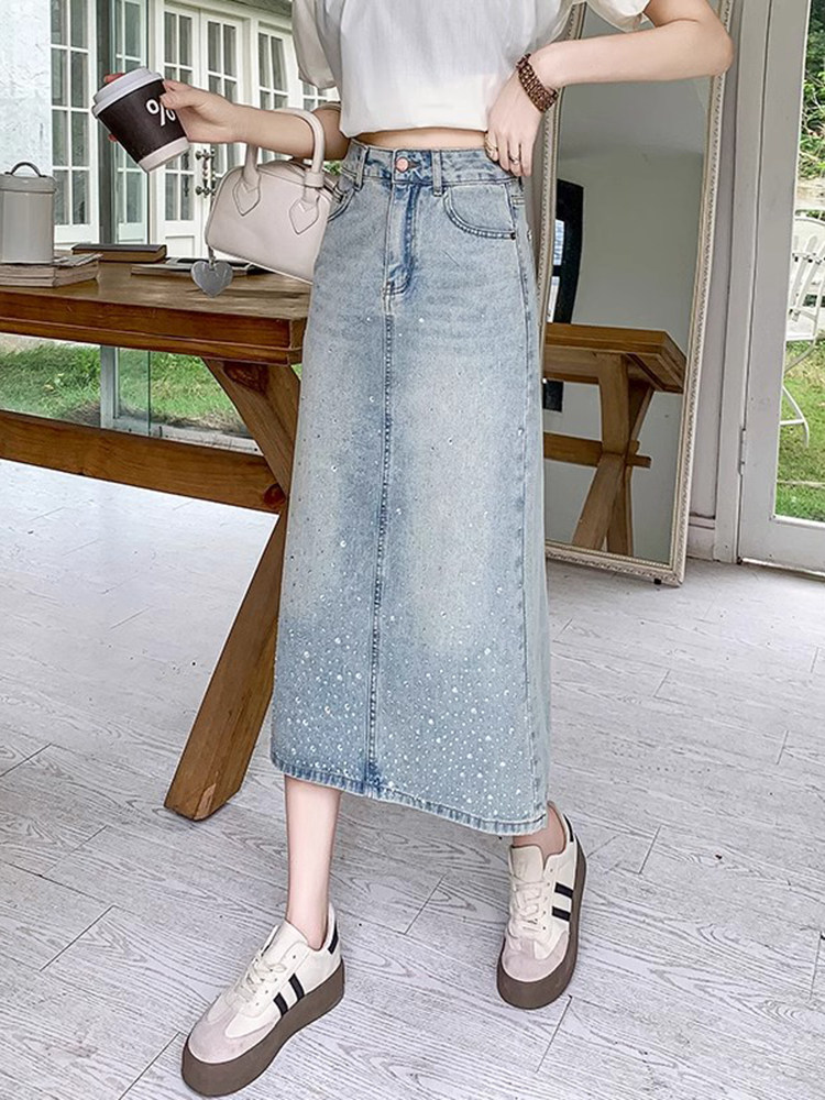 고급 센스 핫픽스 데님 반신 스커트 여성 2026 여름 새로운 하이웨이스트 슬림해 보이는 중간 길이 한 마디 트임 치마