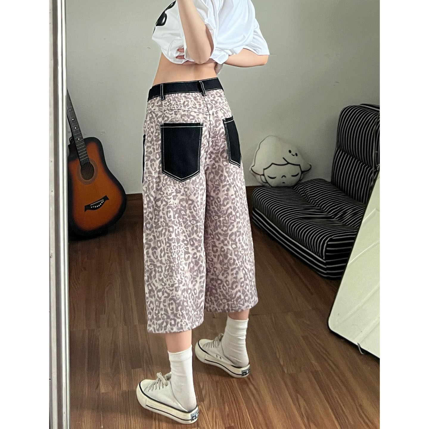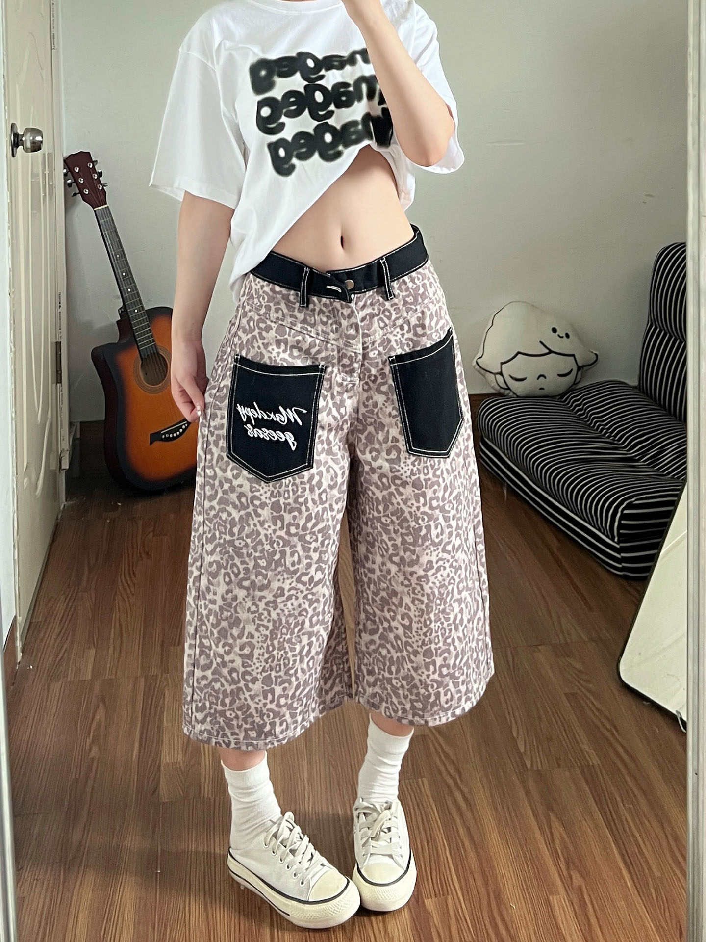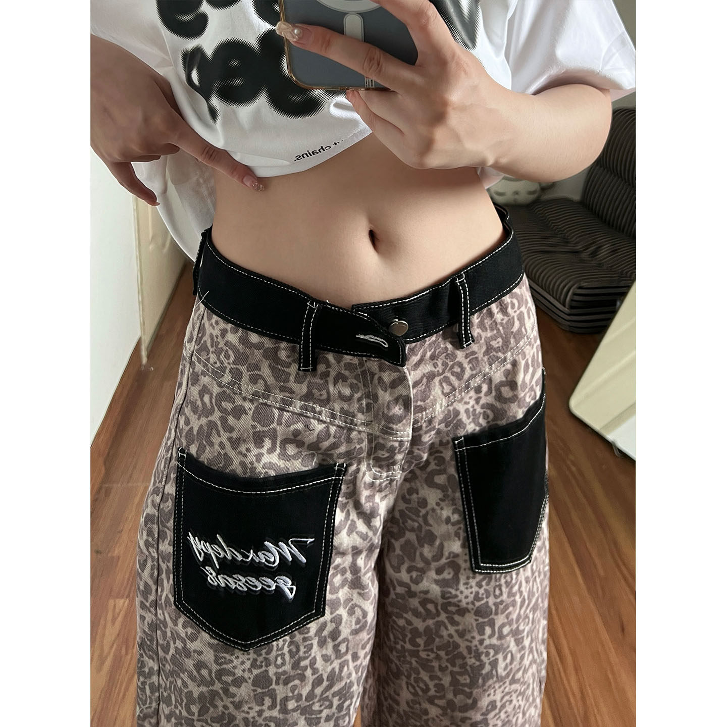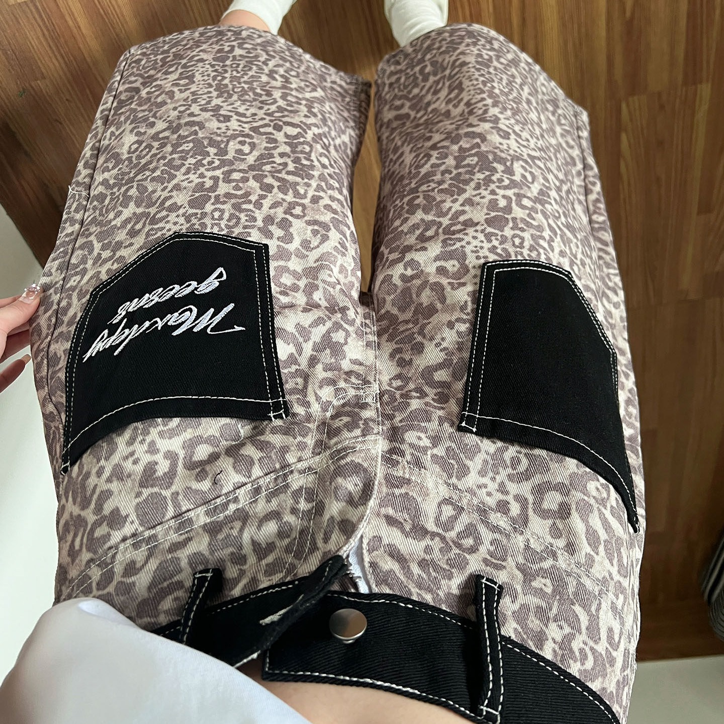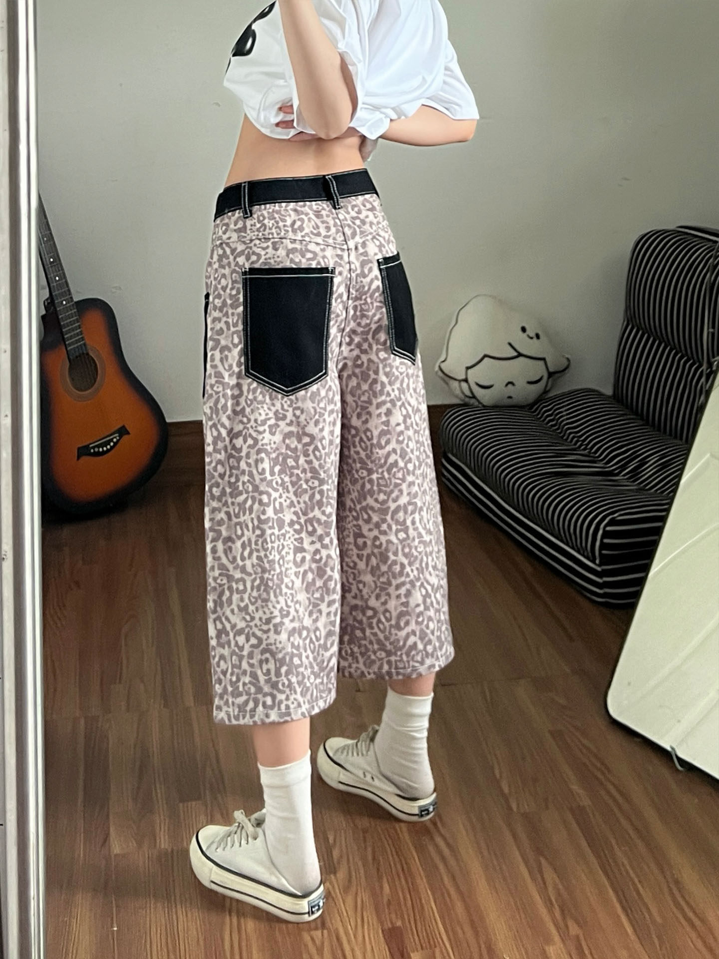 아메리칸 레트로 레오파드 무늬 패치워크 청바지 여성 봄 새로운 디자인 센스 루즈핏 스트레이트 와이드 레그 팬츠 모통이 칼 바지