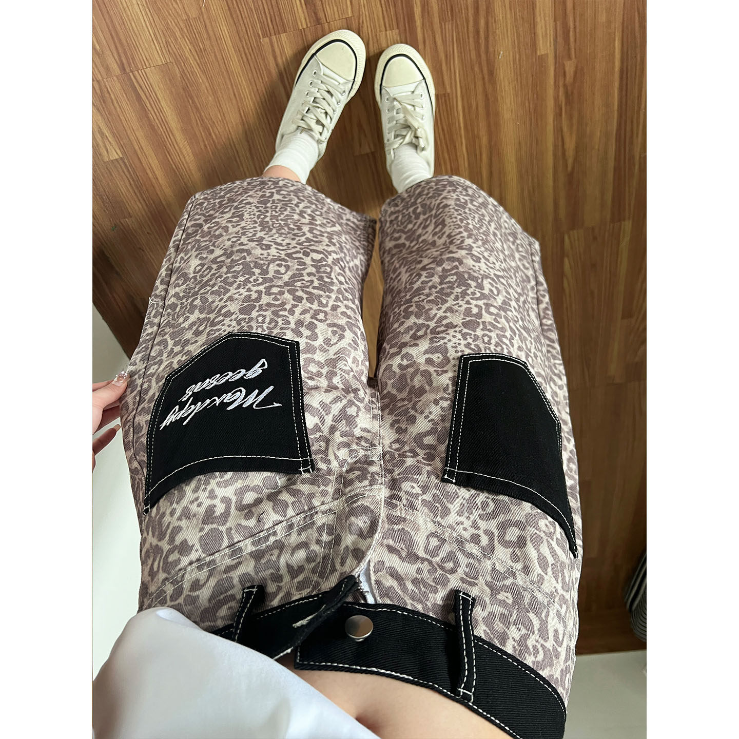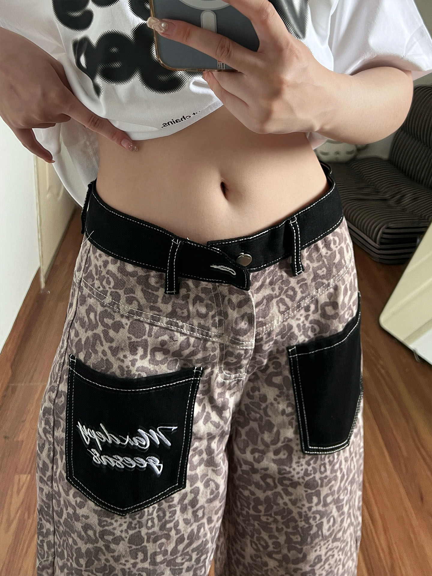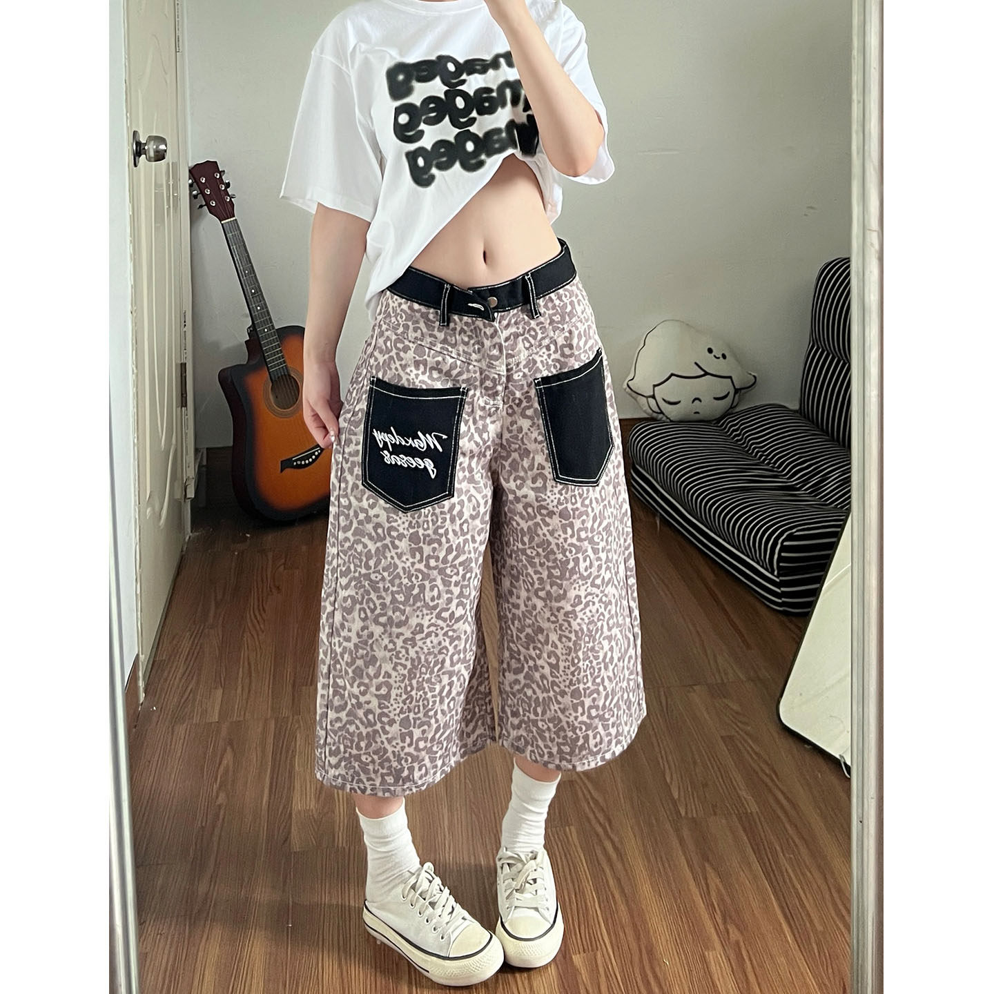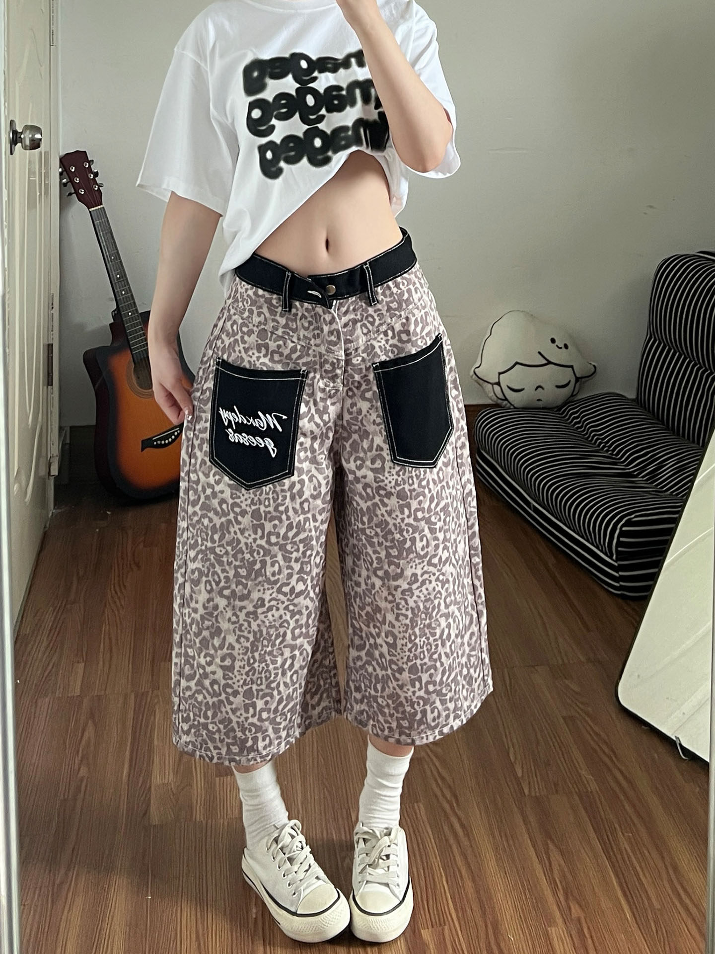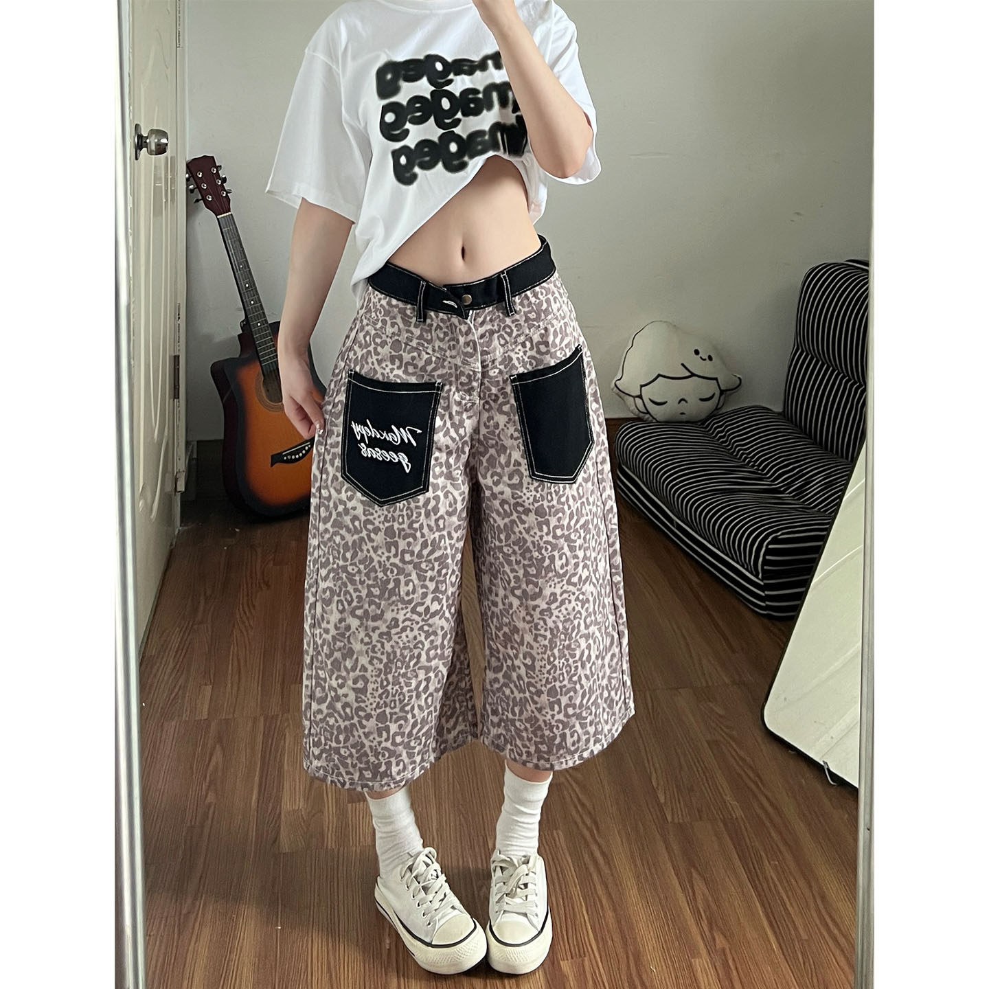 아메리칸 레트로 레오파드 무늬 패치워크 청바지 여성 봄 새로운 디자인 센스 루즈핏 스트레이트 와이드 레그 팬츠 모통이 칼 바지
