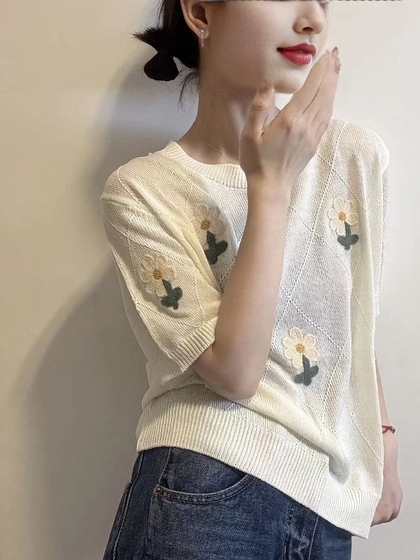 한 부서 주황색 꽃 자수 라운드 넥 니트 스웨터 여자 2026 여름 새로운 자이언트 잘 생긴 반팔 연령 감소 맨위