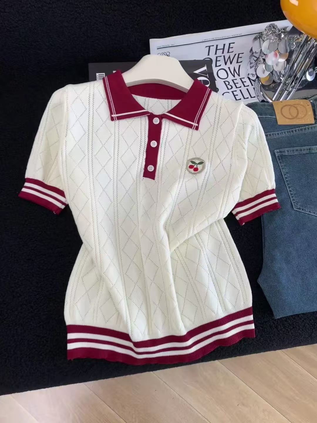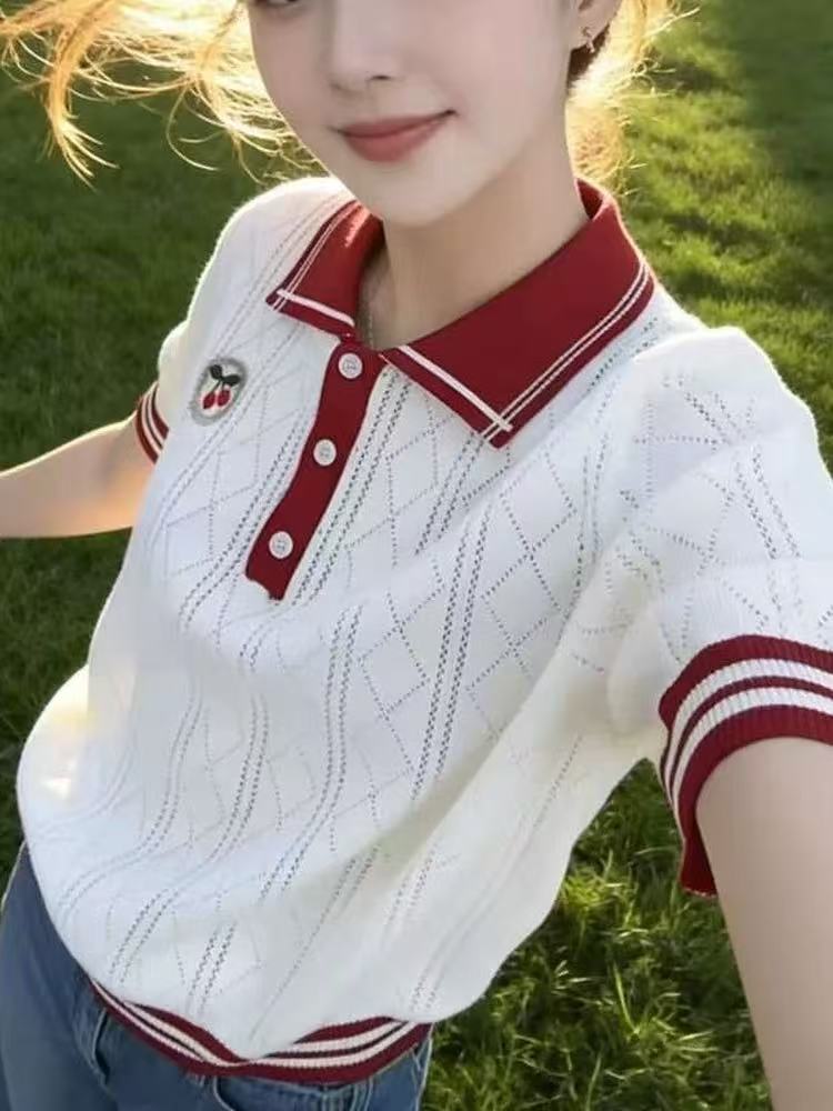 홀로우 아웃 얇은 스타일 POLO 칼라 니트 스웨터 니트 반팔 여성 의류 2026 새로운 여름 몸매 가꾸기 폴로 칼라 쇼트 스타일 맨위