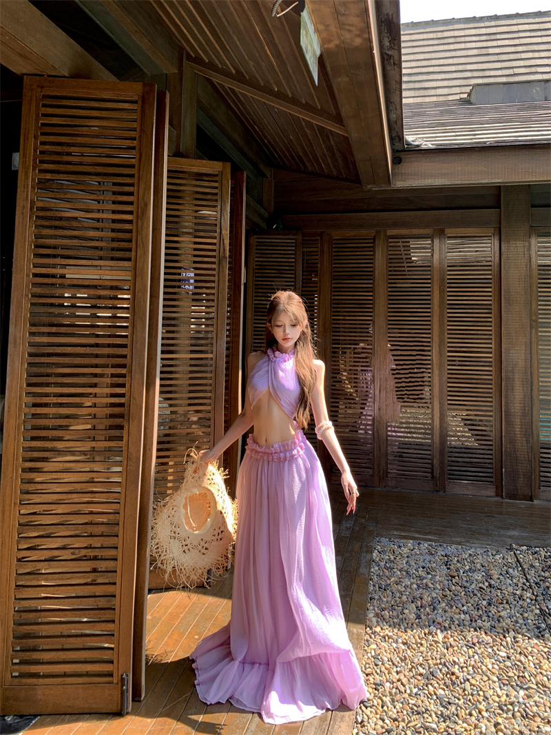 실사 휴가 착용 가져 가라. 세트 여성 2026 이른 봄 새로운 섹시함 행침 목 맨위 쉬폰 반신 롱 스커트