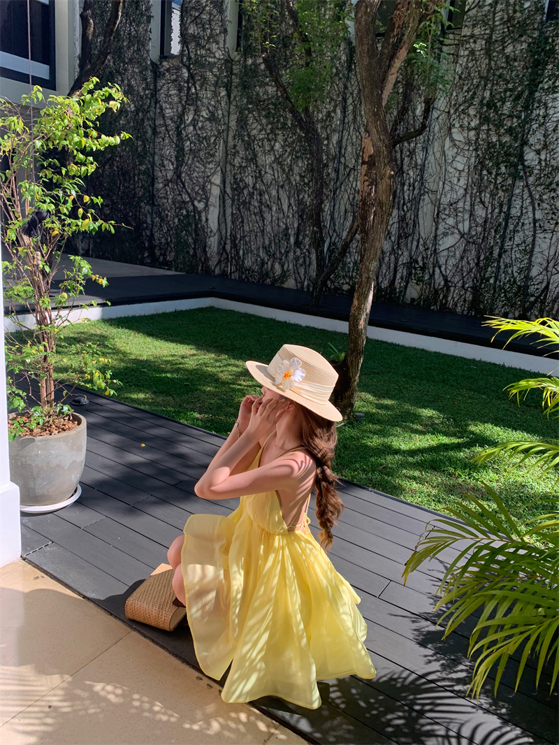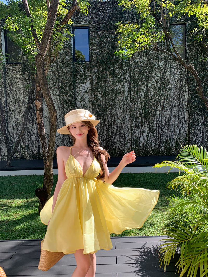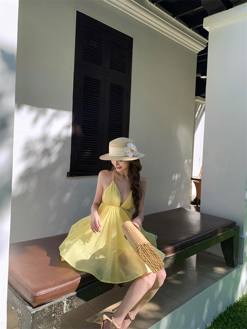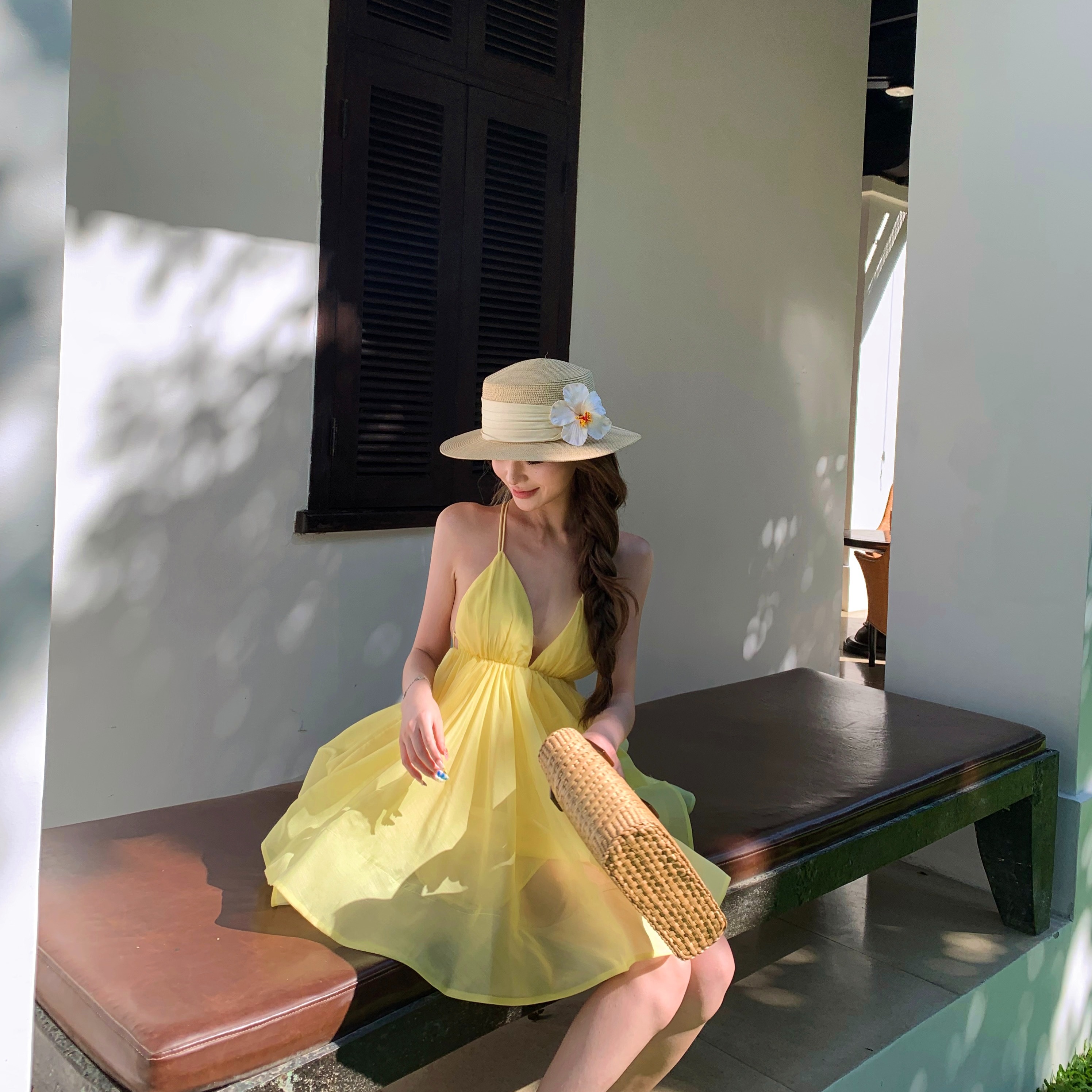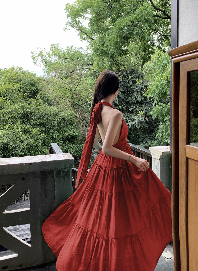 실사 프랑스식 민소매 레트로 V넥 행침 목 빨간색 점프 슈트 치마 계절 아름다운 해변가 휴가 허리 수축 한 마디 롱 스커트