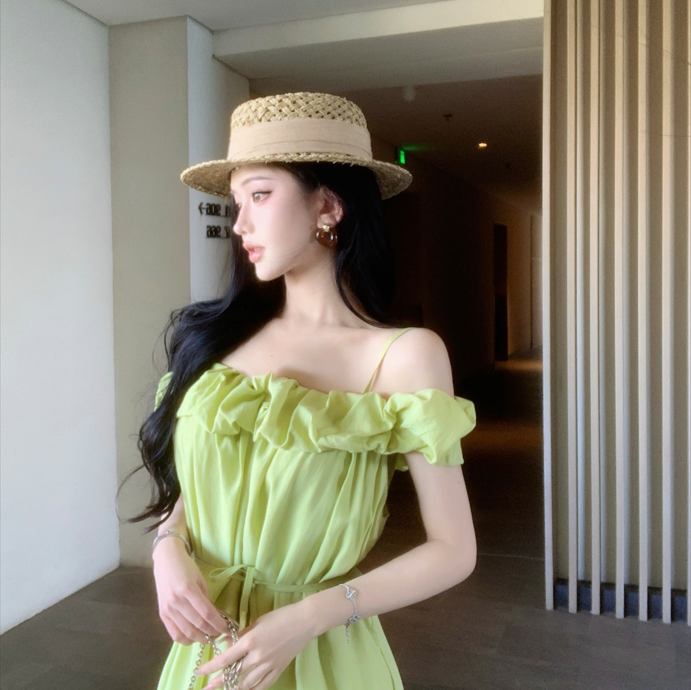 실사 프랑스식 오프숄더 슬립 튜브탑 여성 드레스 봄 고급 센스 해변가 휴가 바람 조끼 롱 스커트