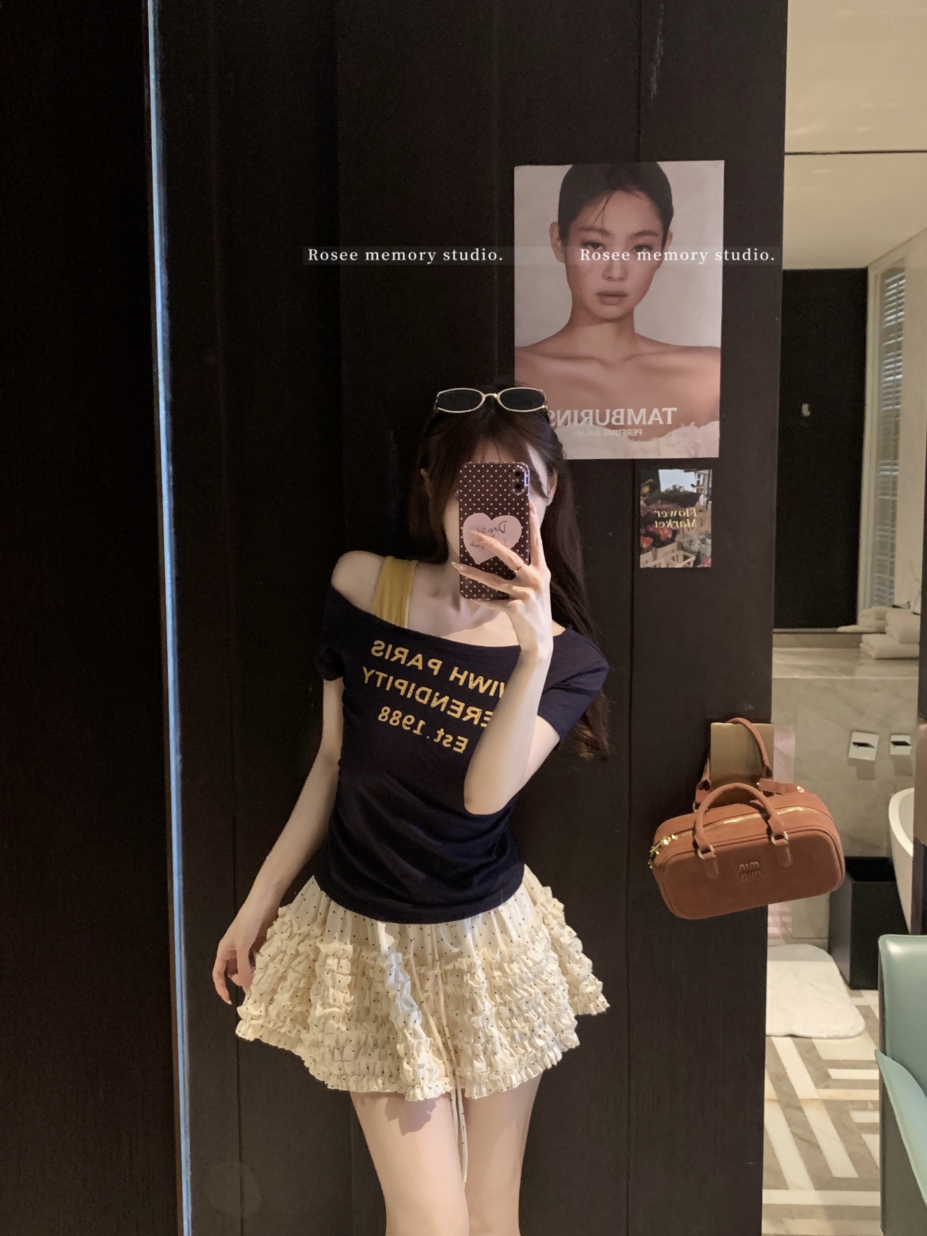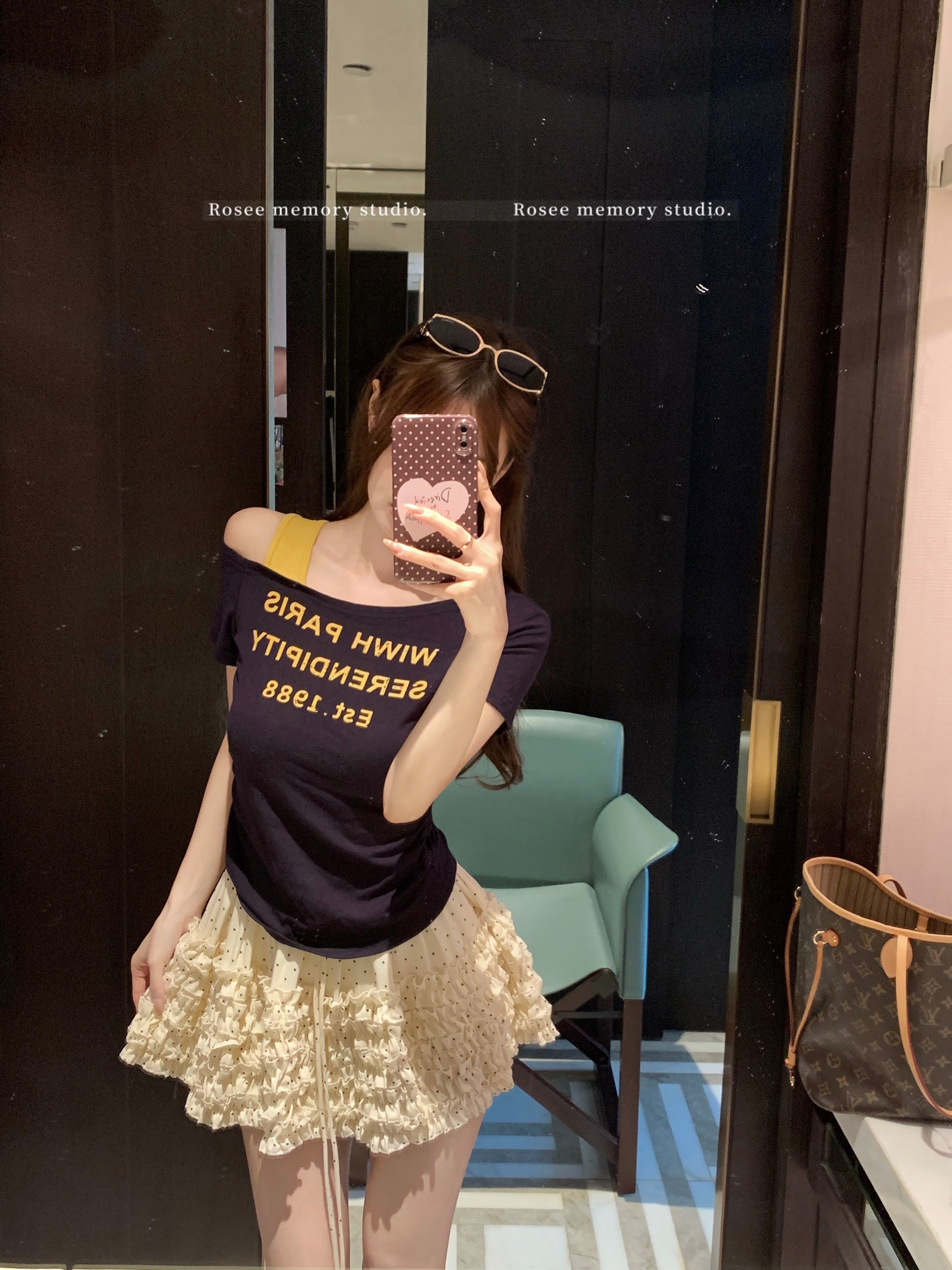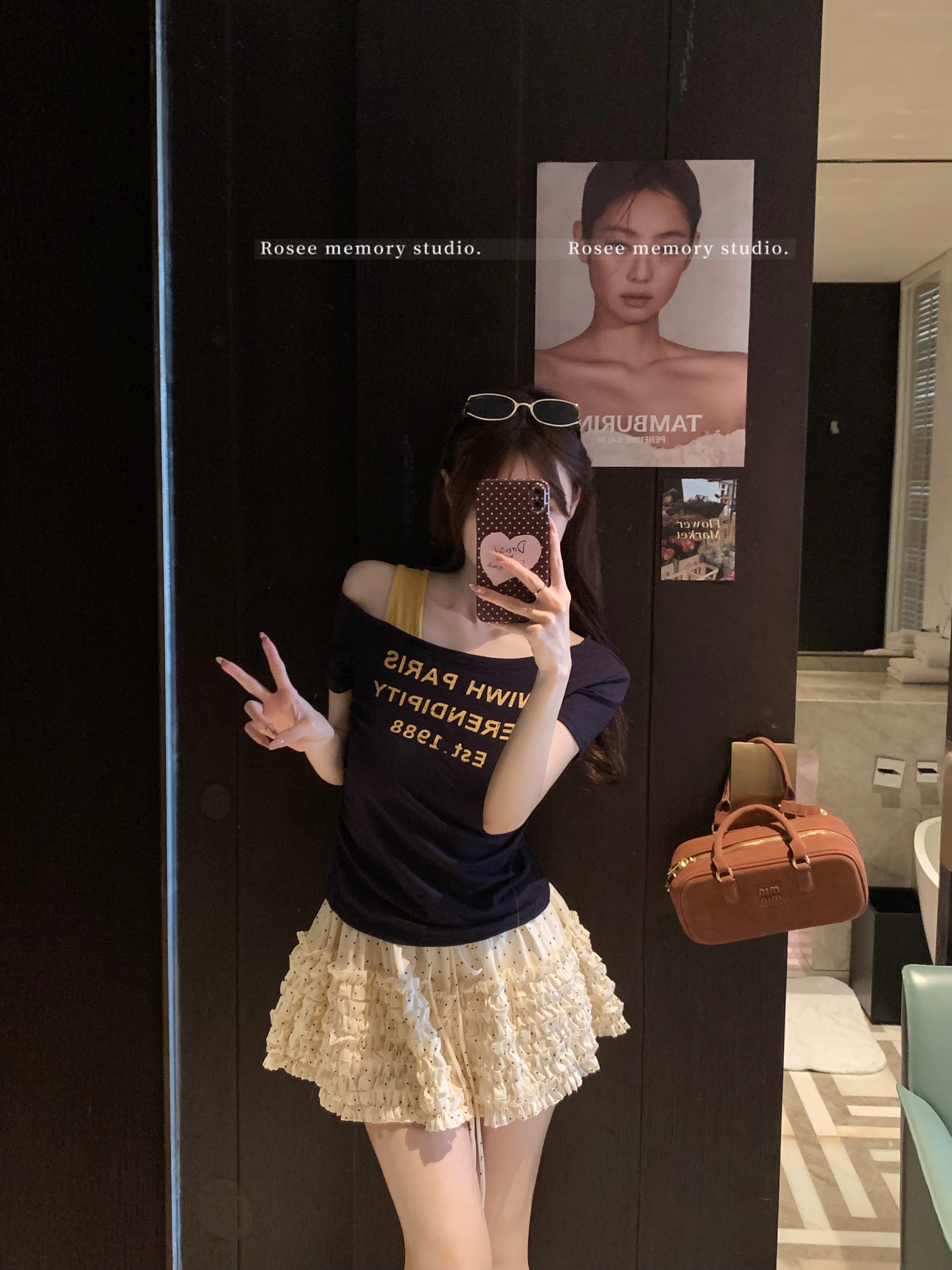 실사 여름 새로운 개성 핫걸 알파벳 핫픽스 스트랩 비스듬한 어깨 디자인 반팔 티셔츠 여성