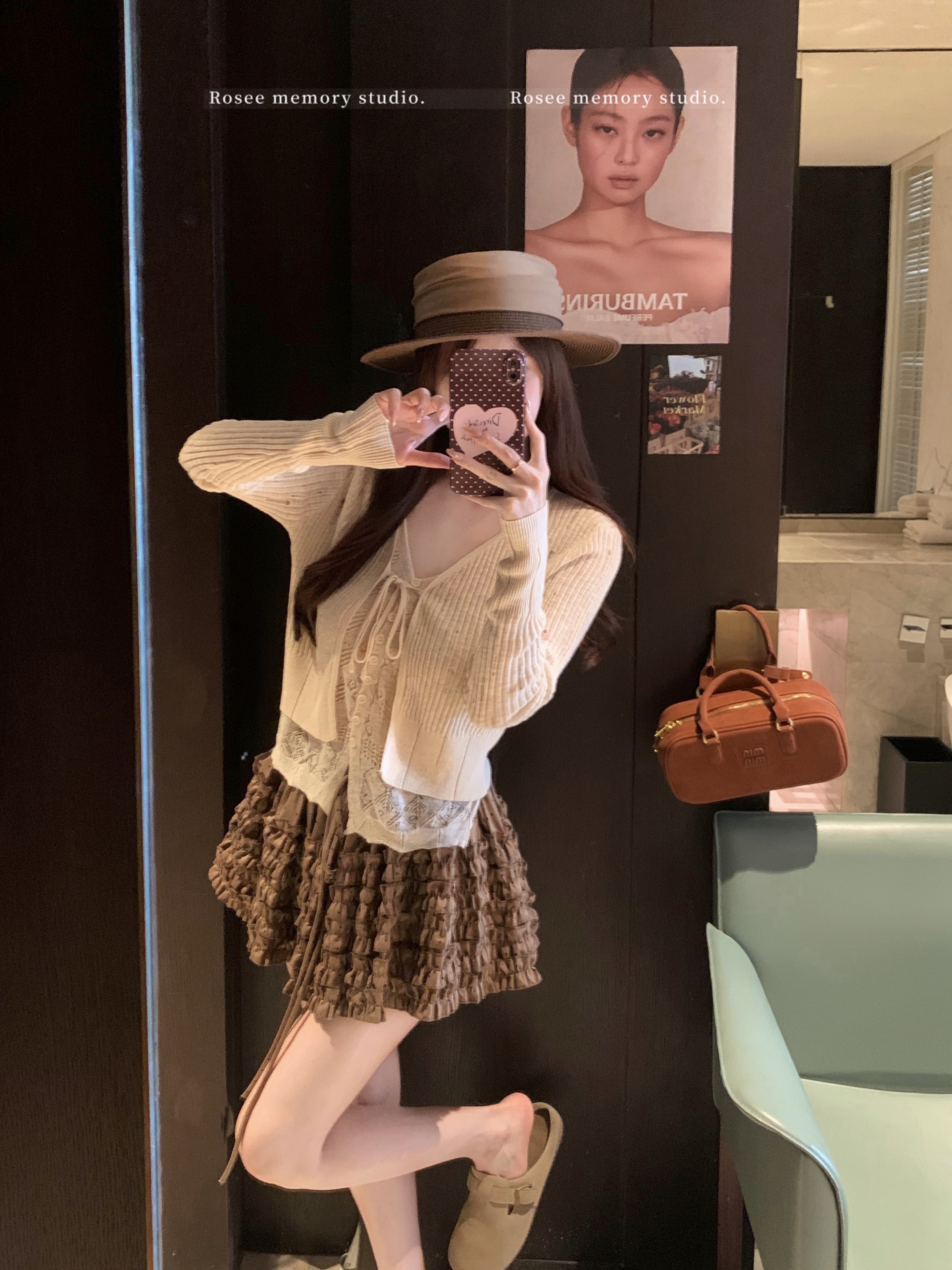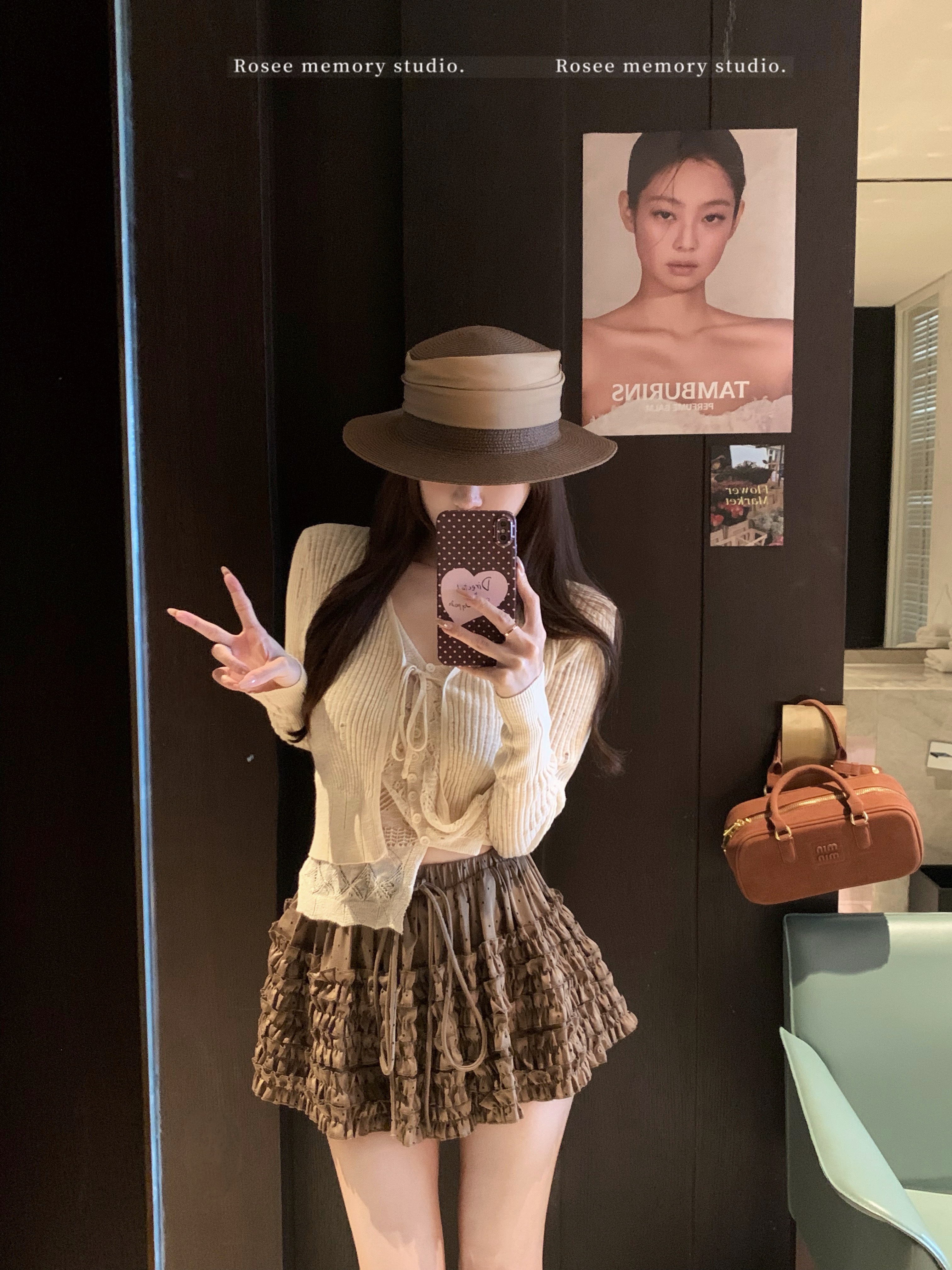 실사 달콤함 홀로우 아웃 패치워크 색상 니트 오픈 가디건 여성 한 부서 레이스 황색 맨위 페이크 레이어드 스웨터 코트