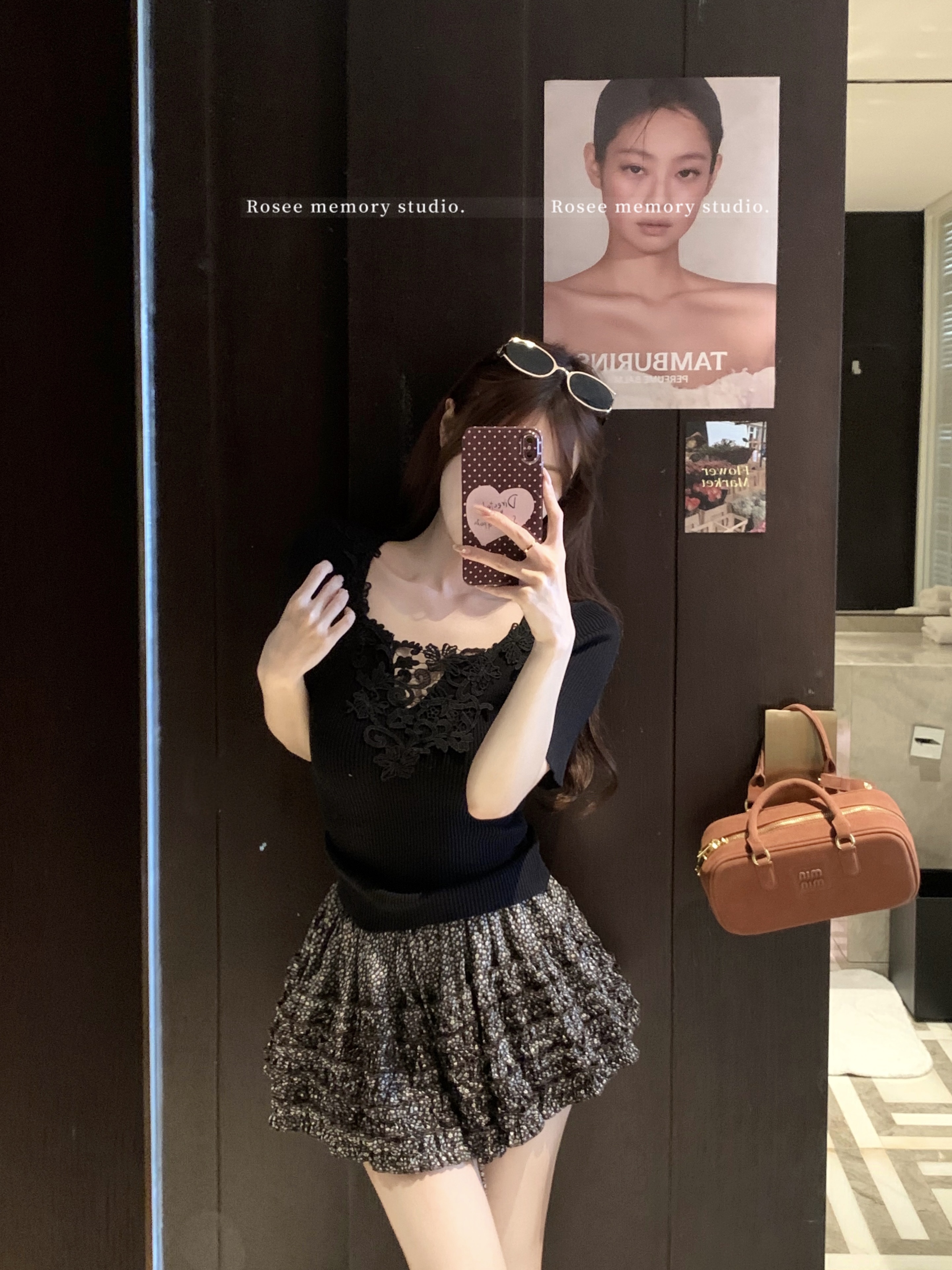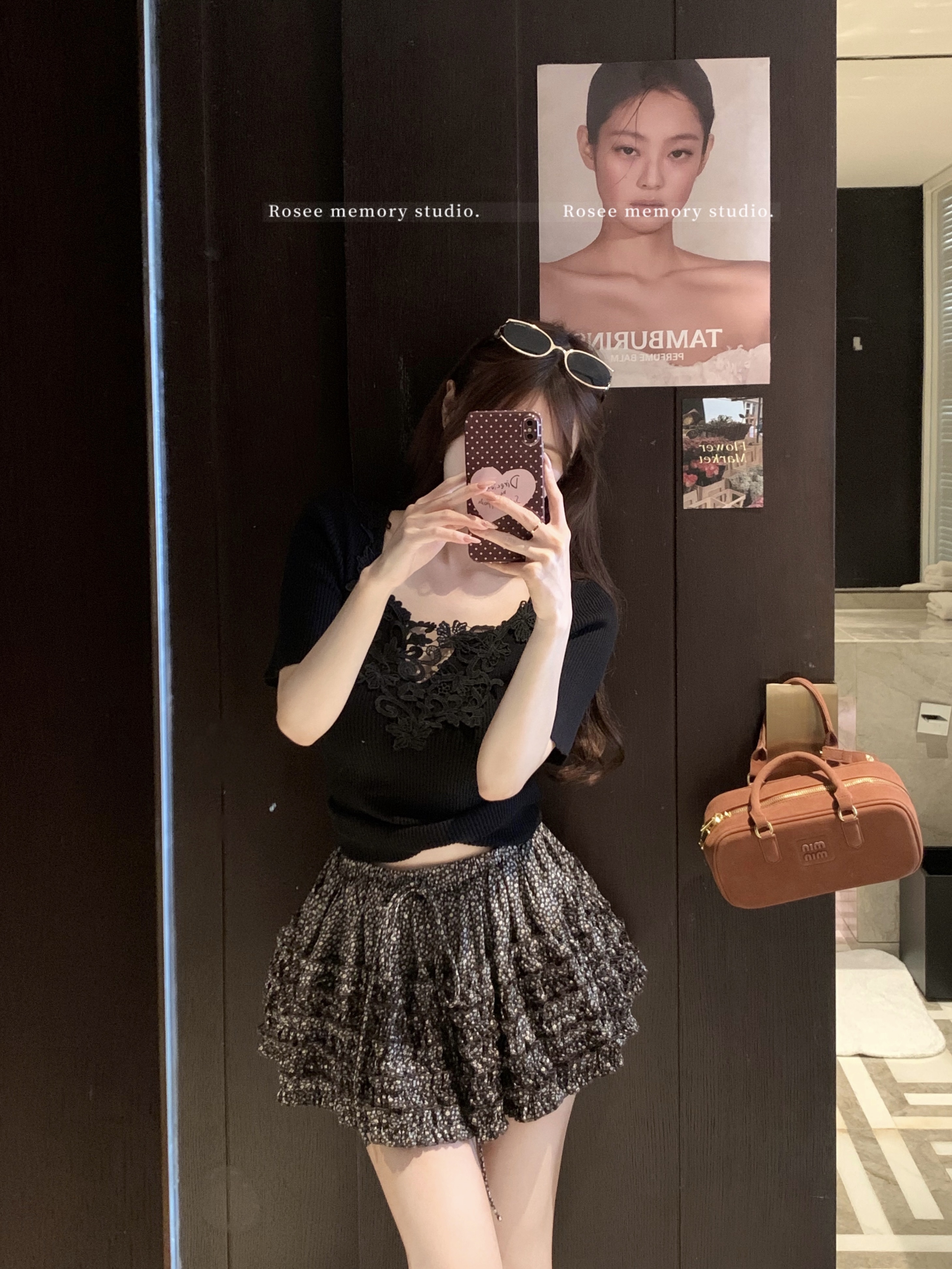 실사 레이스 체크무늬 반팔 여성 셔츠 여름 패치워크 하이웨이스트 루즈핏 한 마디 중간 길이 치마 세트