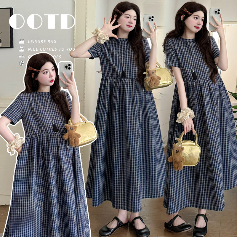 외국 가스 임신 기간 착용 가져 가라. 중간 길이 치마 2026 여름 루즈핏 슬림해 보이는 빅 사이즈 체크무늬 출산 착용 드레스 매운맛 엄마