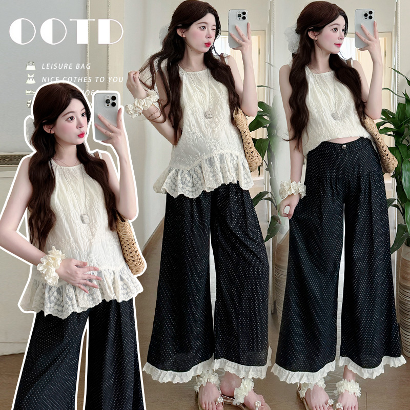 여름 인터넷 유명인 섹션 임신 기간 착용 가져 가라. 세트 2026 빅 사이즈 루즈핏 슬림해 보이는 도트 무늬 8 점 바지 출산 착용 투피스 세트