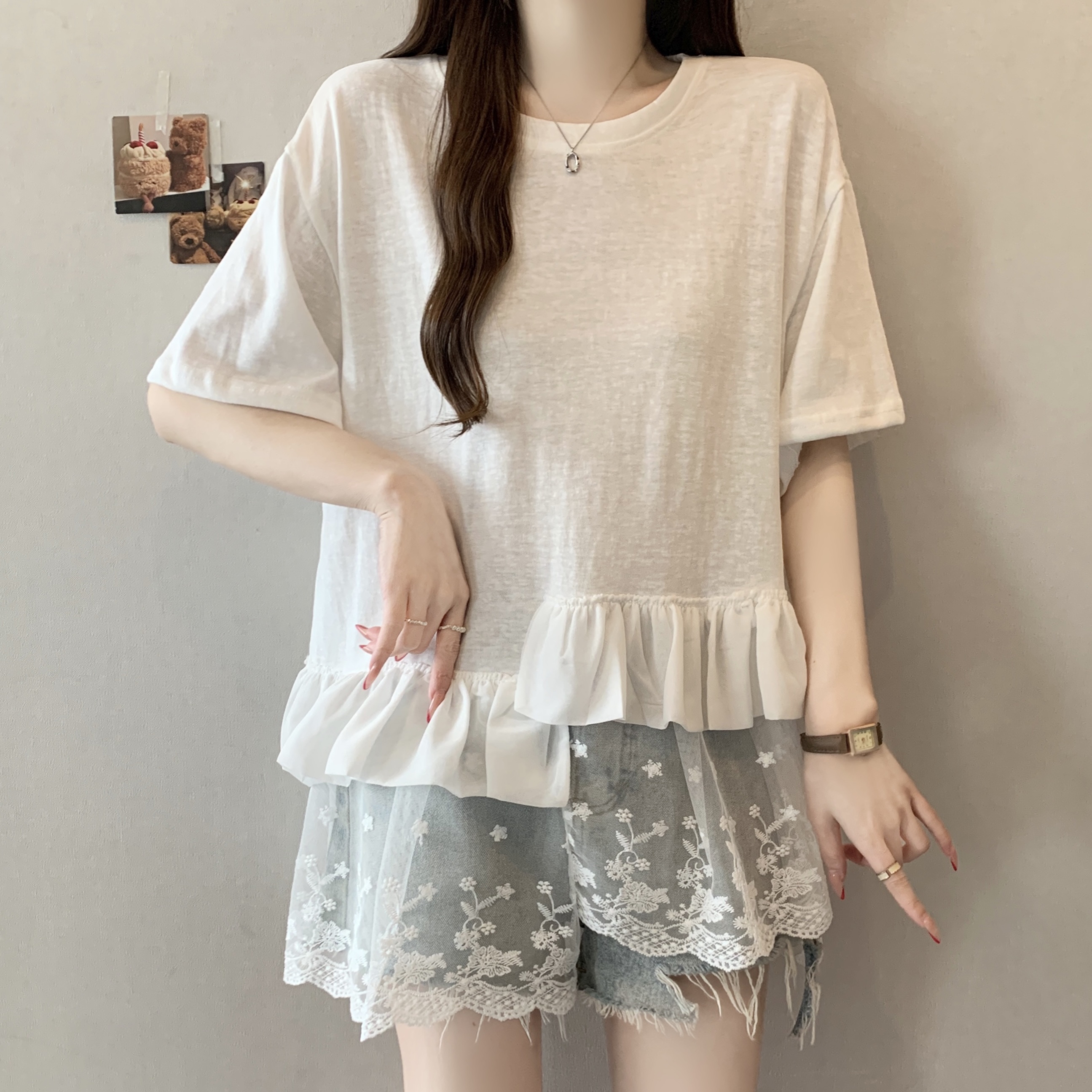 실사 2818# 빅 사이즈 마이크로 지방 캐주얼 작은 대중 화이트 패션 패치워크 레이스 레이스 티셔츠 루즈핏 외국 가스 맨위