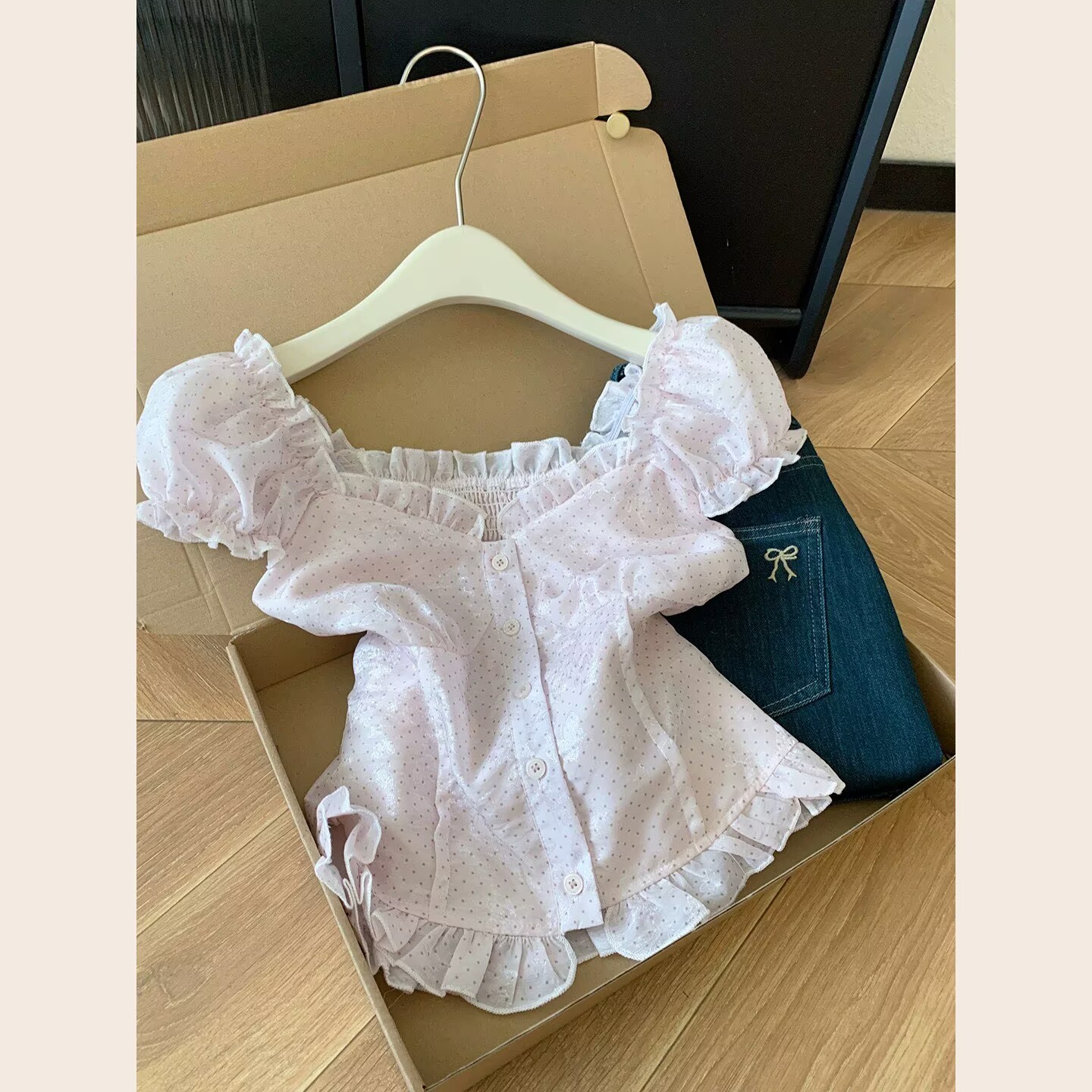 프랑스식 부드러운 연령 감소 프릴 도트 무늬 작은 셔츠 여성 여름 디자인 센스 고유 한 아름다운 허리 수축 슬림해 보이는 셔츠 맨위