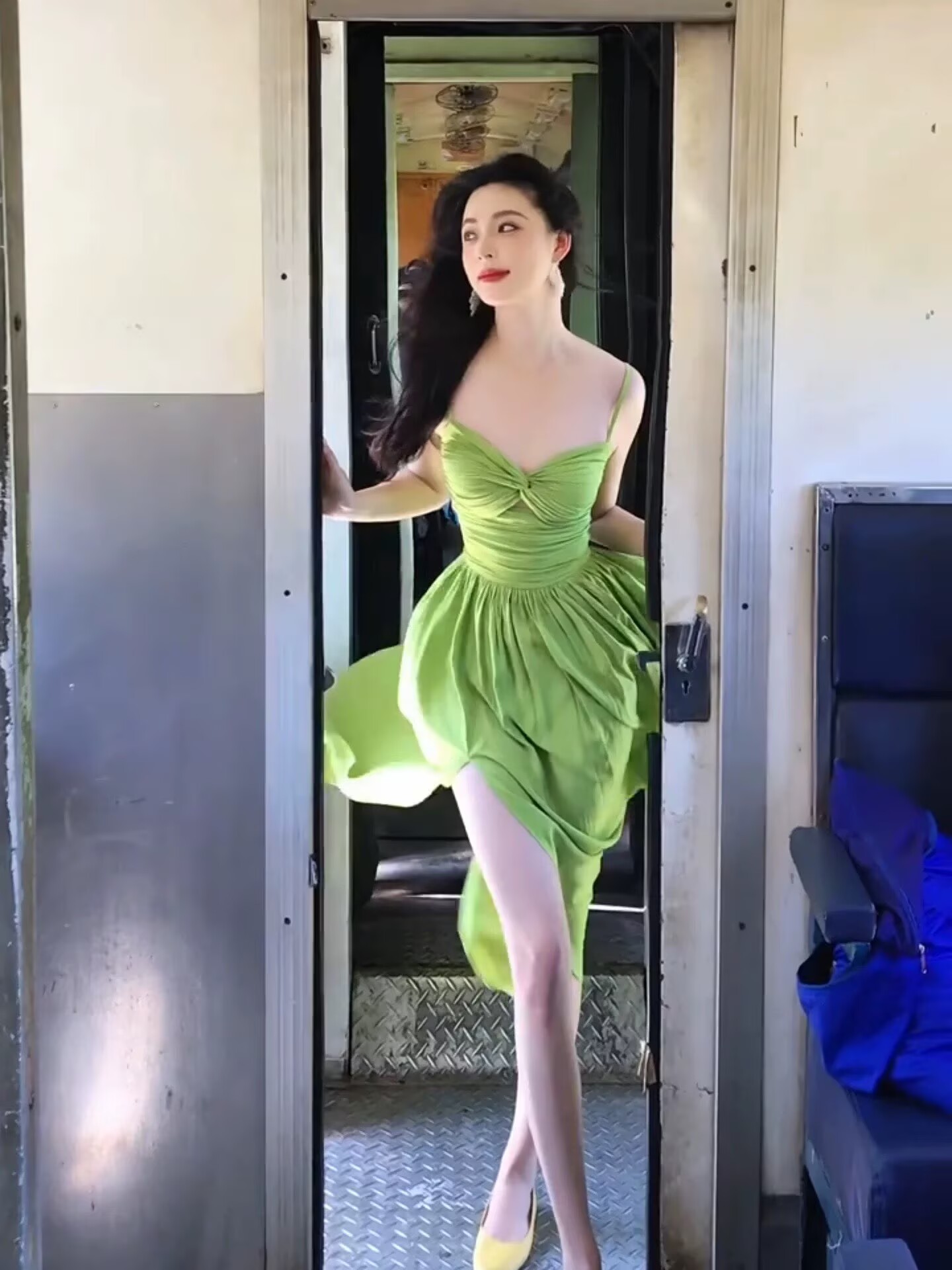 프랑스식 녹색 백리스 스트랩 슬립 여성 드레스 여름 해변가 휴가 섹시함 핫걸 허리 수축 아름다운 롱 스커트