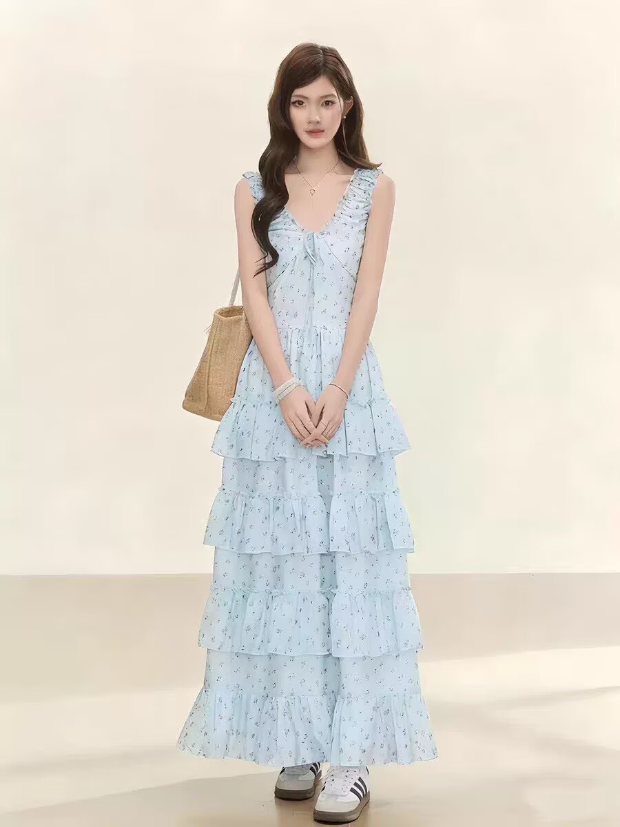 프랑스식 V넥 고급 센스 꽃무늬 여성 드레스 2026 년 여름 새로운 해변가 휴가 바람 케이크 드레스 롱 스커트