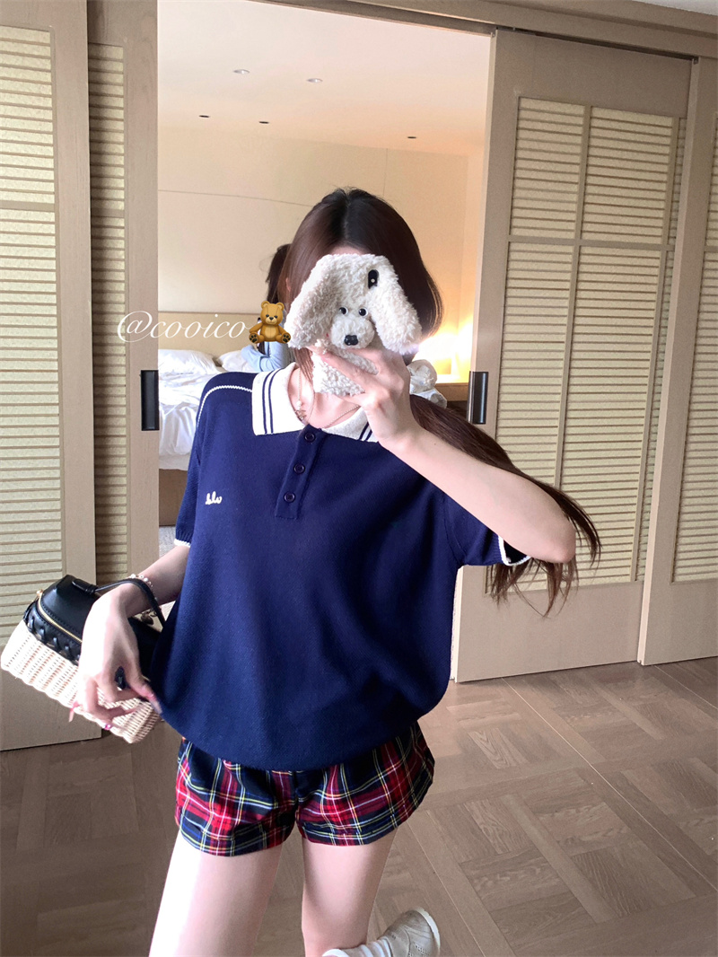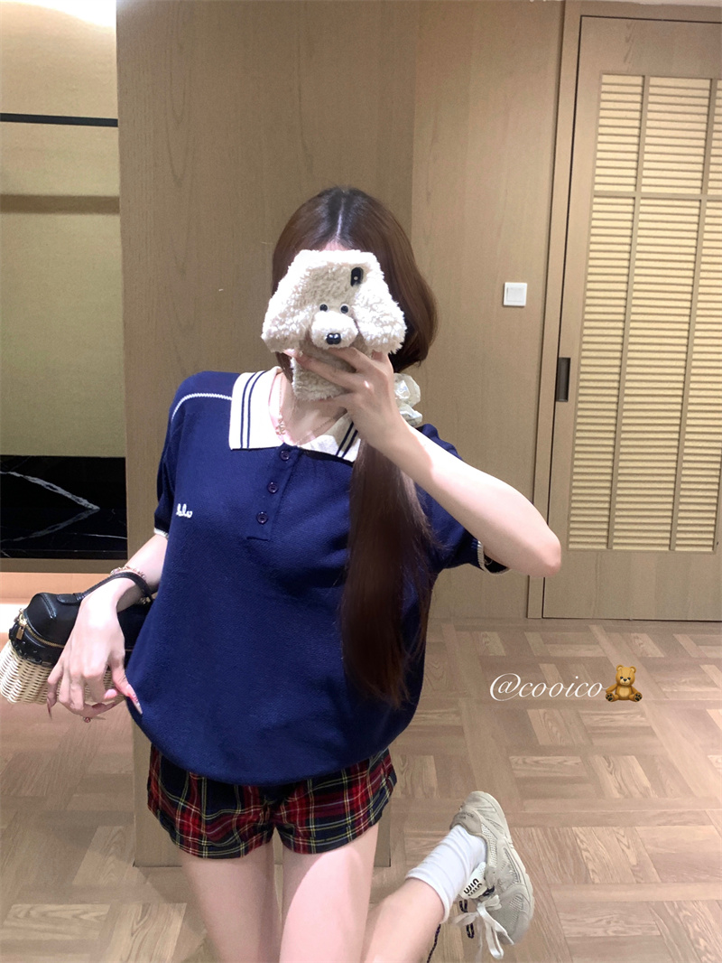 실사 정가 동백 나무 여름 새로운 파란색 라운드 넥 몸매 가꾸기 니트 스웨터 반팔 티셔츠 여성 셔츠