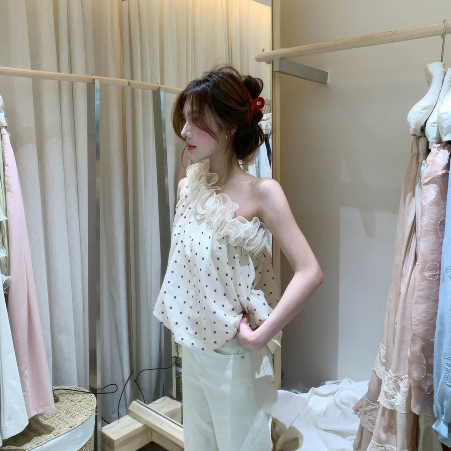 프랑스식 순수한 욕망 레이스 비스듬한 어깨 도트 무늬 작은 셔츠 여성 여름 디자인 센스 외국 가스 연령 감소 고유 한 Chic 아름다운 맨위