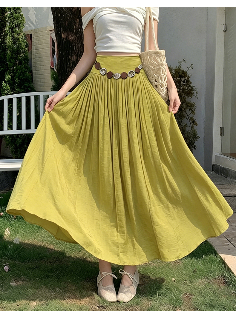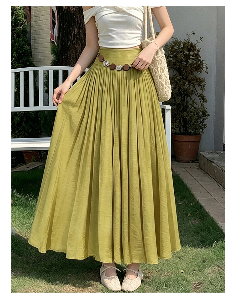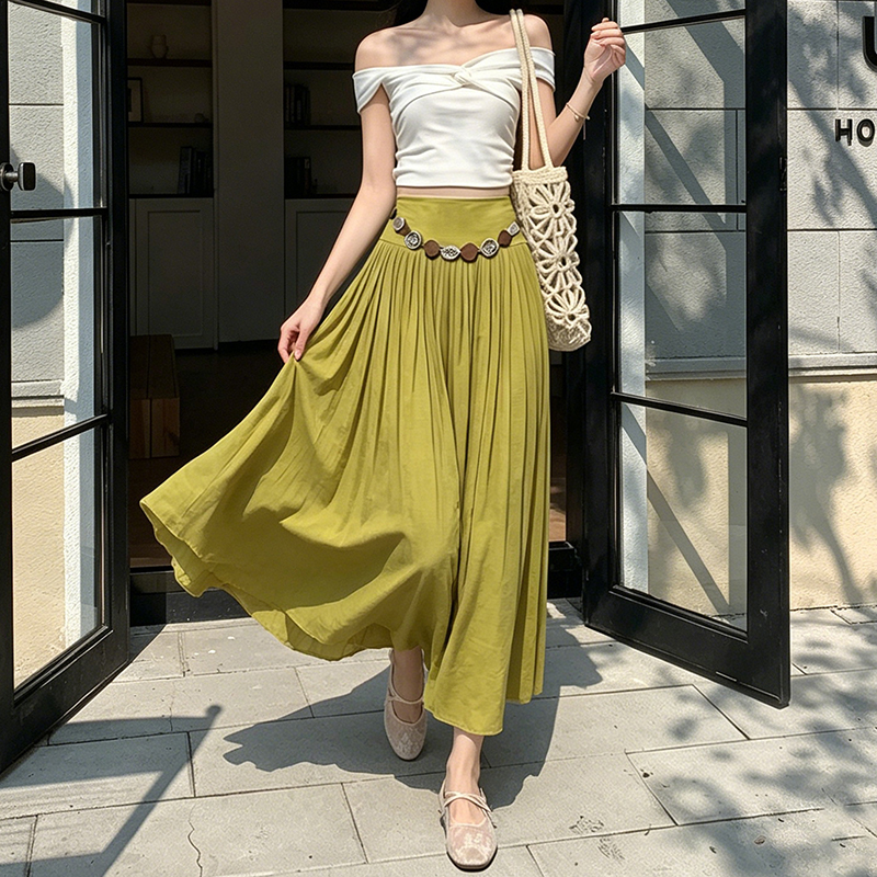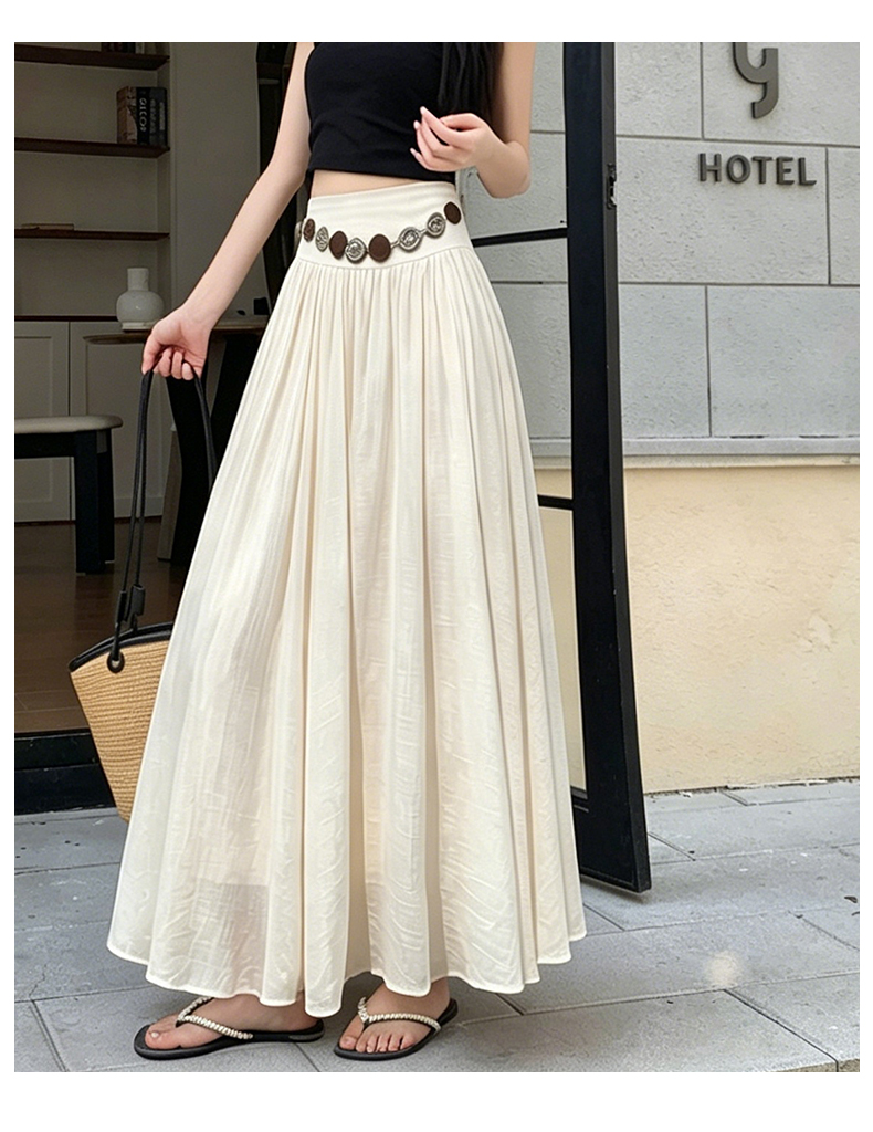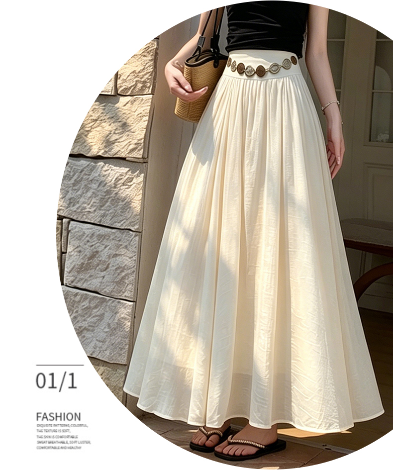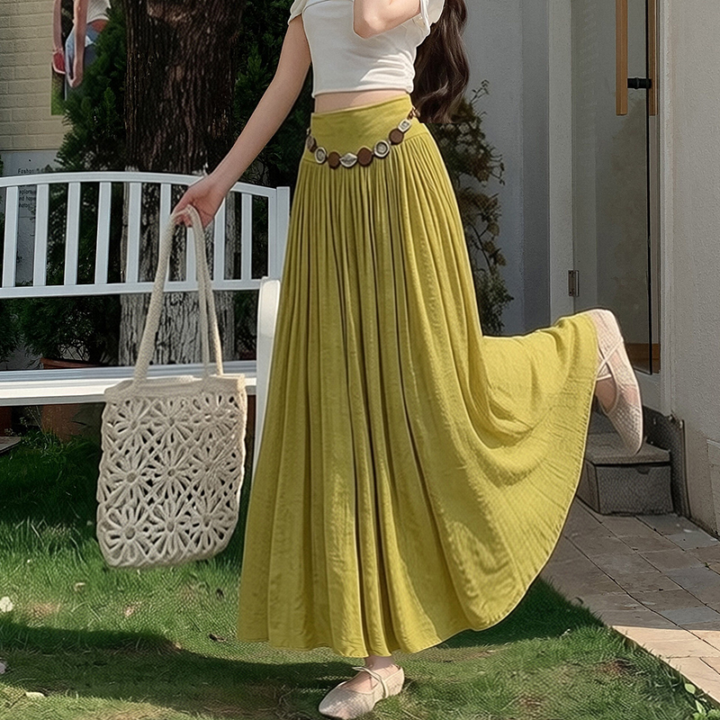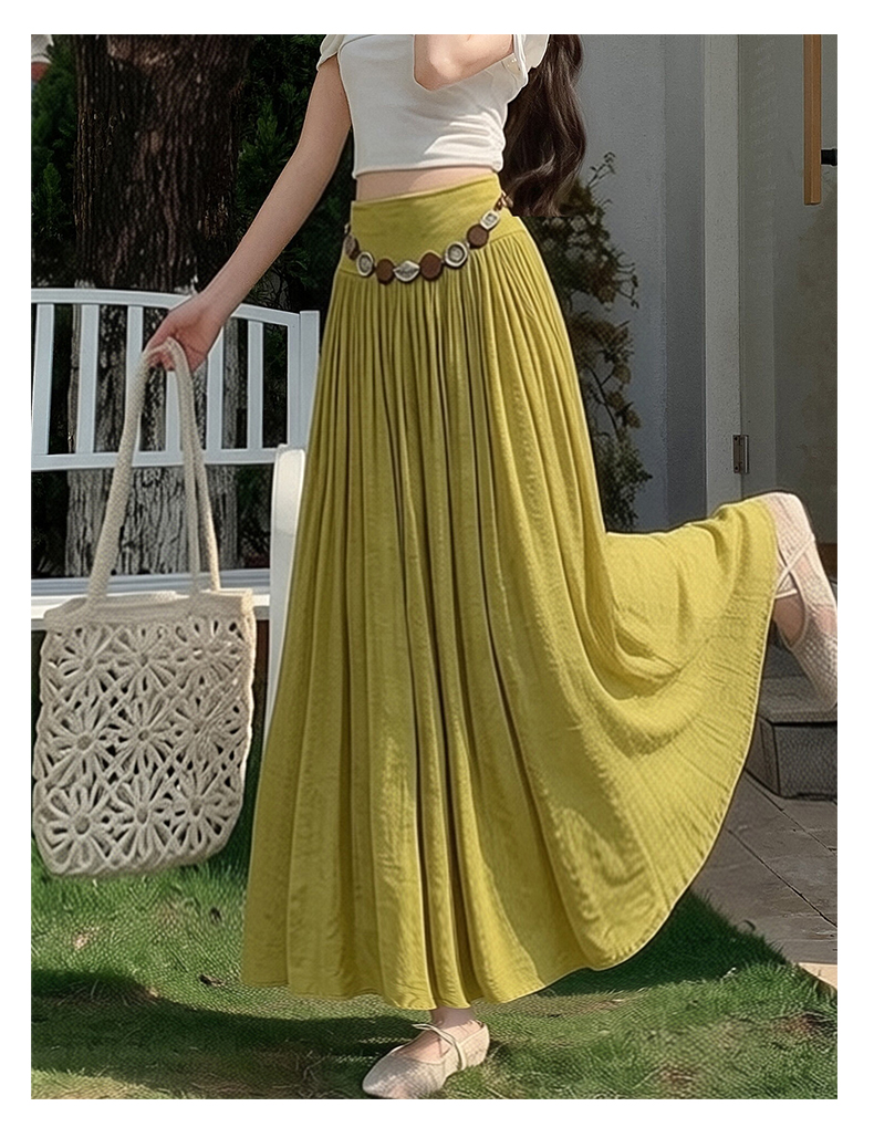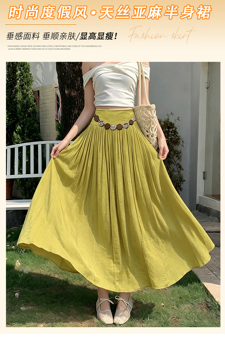 실사 2026 봄 여름 새로운 아마 치마 색상 시스템 슈퍼 아름다움 감기 센스 주간 실크 주름 마 허리 수축 질감 반신 롱 스커트