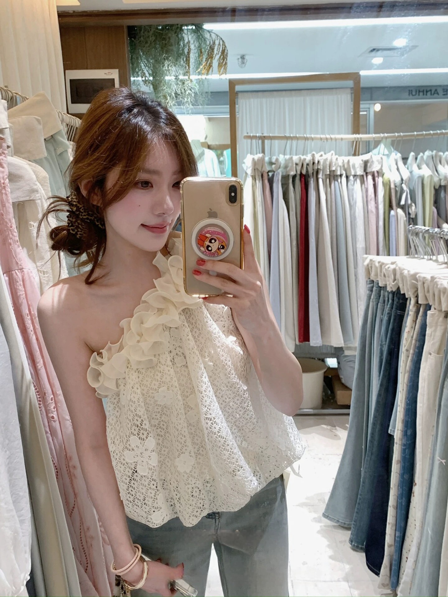 프랑스식 순수한 욕망 레이스 비스듬한 어깨 도트 무늬 작은 셔츠 여성 여름 디자인 센스 외국 가스 연령 감소 고유 한 Chic 아름다운 맨위