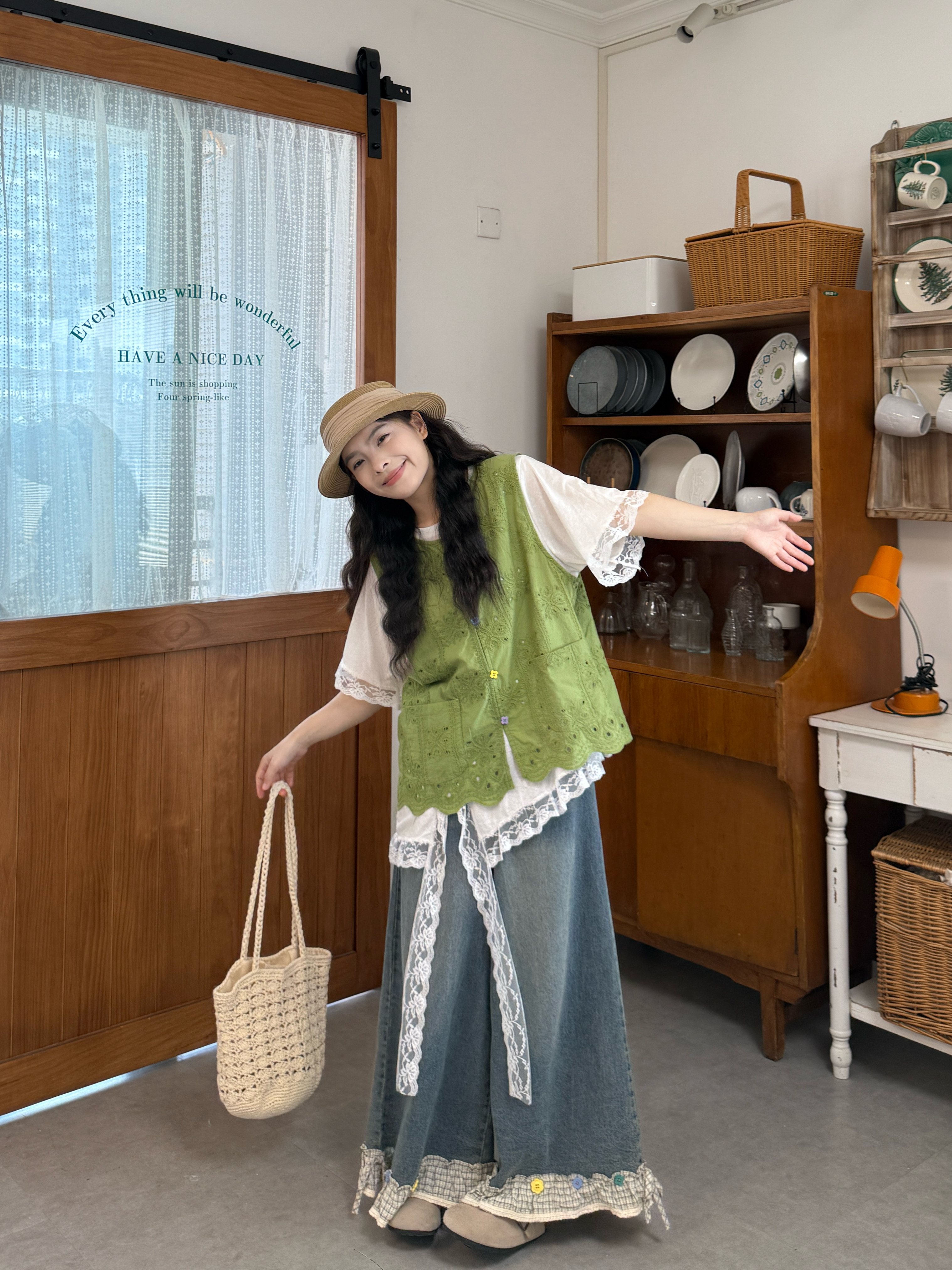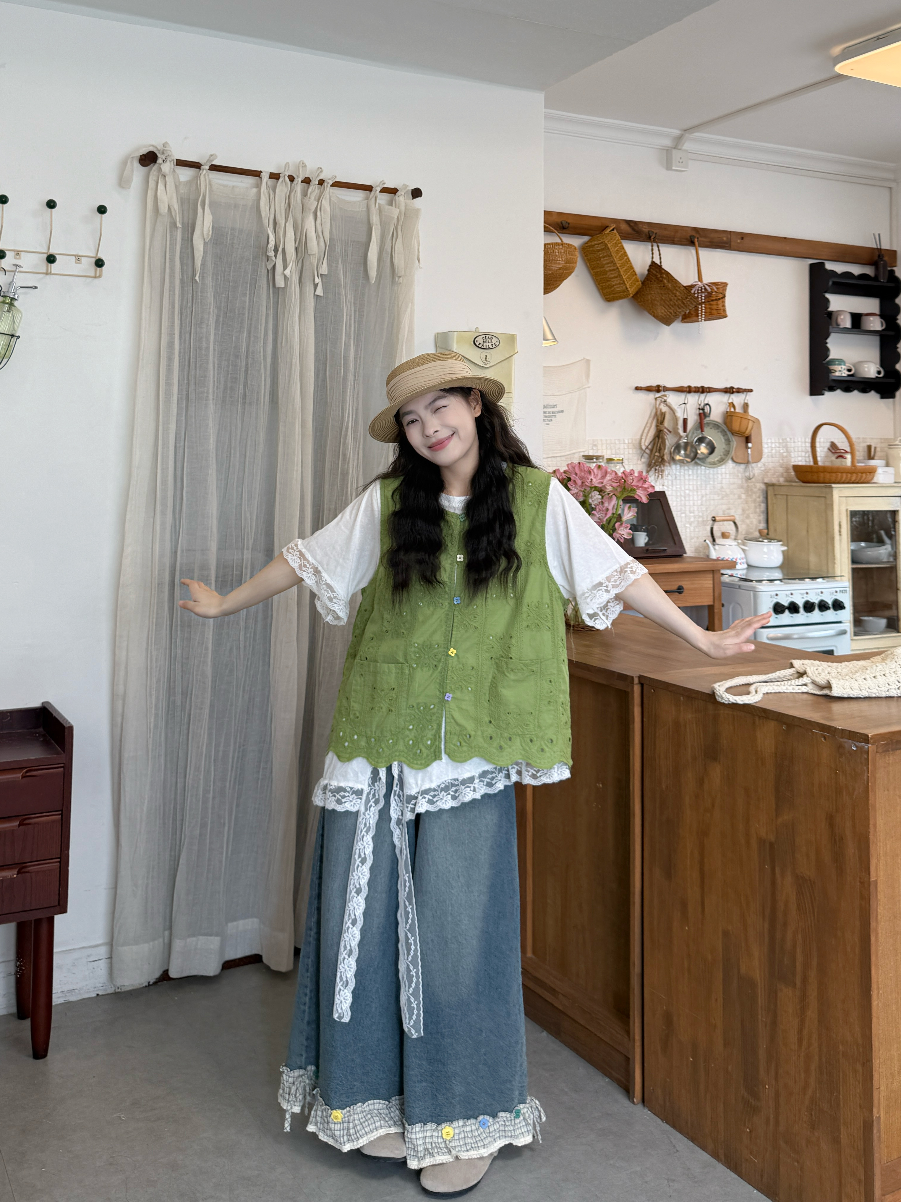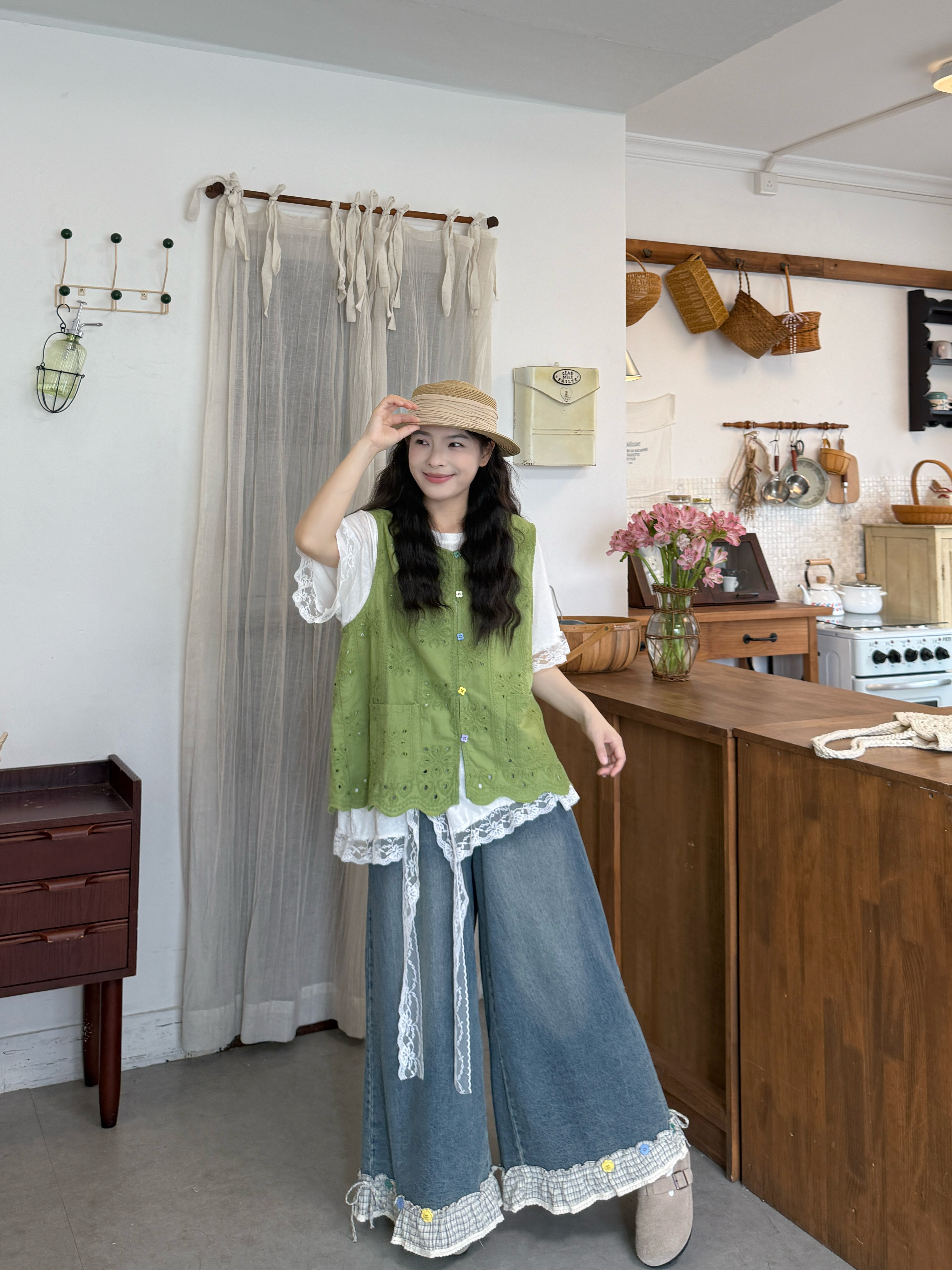 실사 자수 홀로우 아웃 베스트 반팔 만나는 티셔츠 레이스 바지