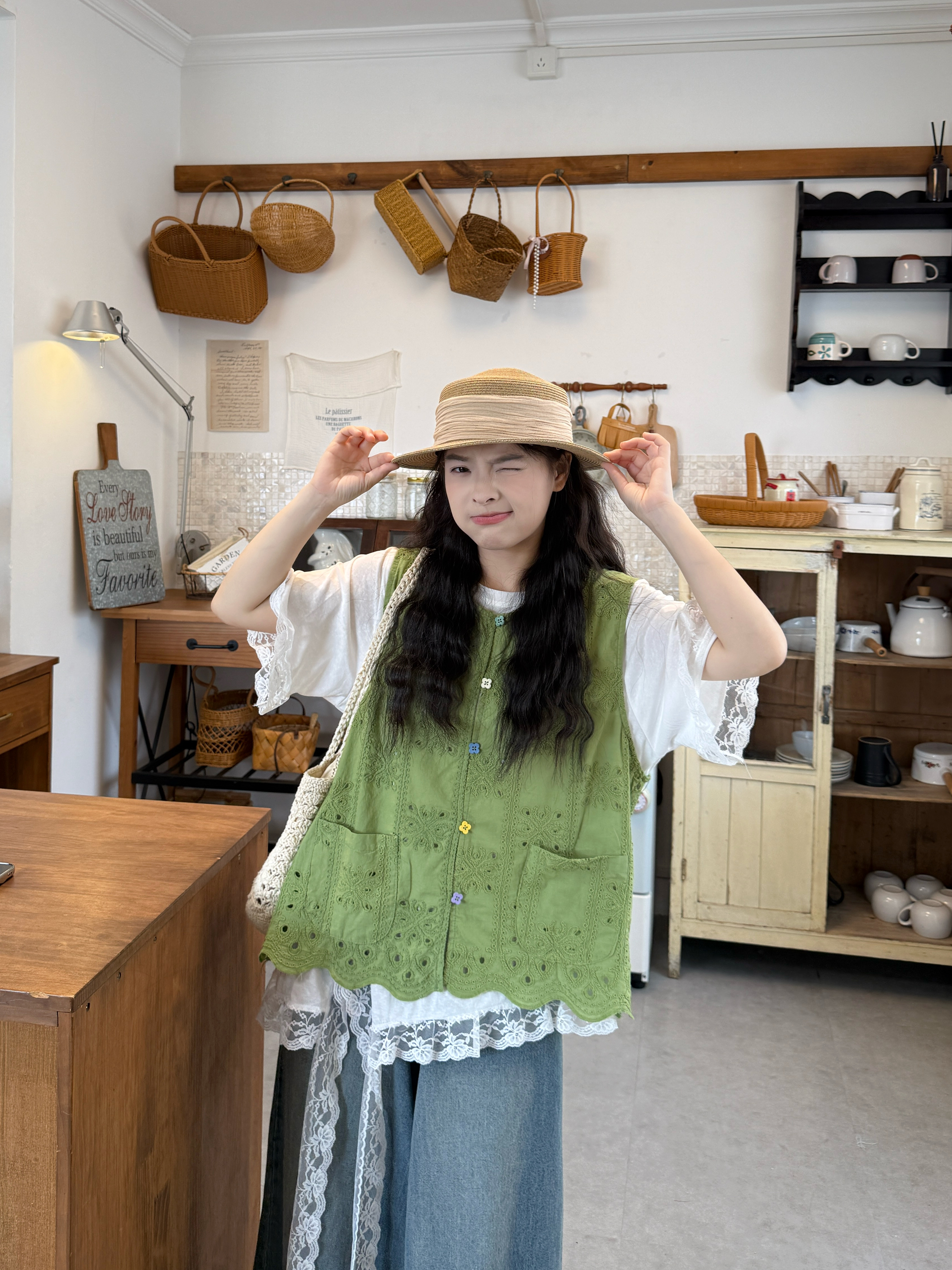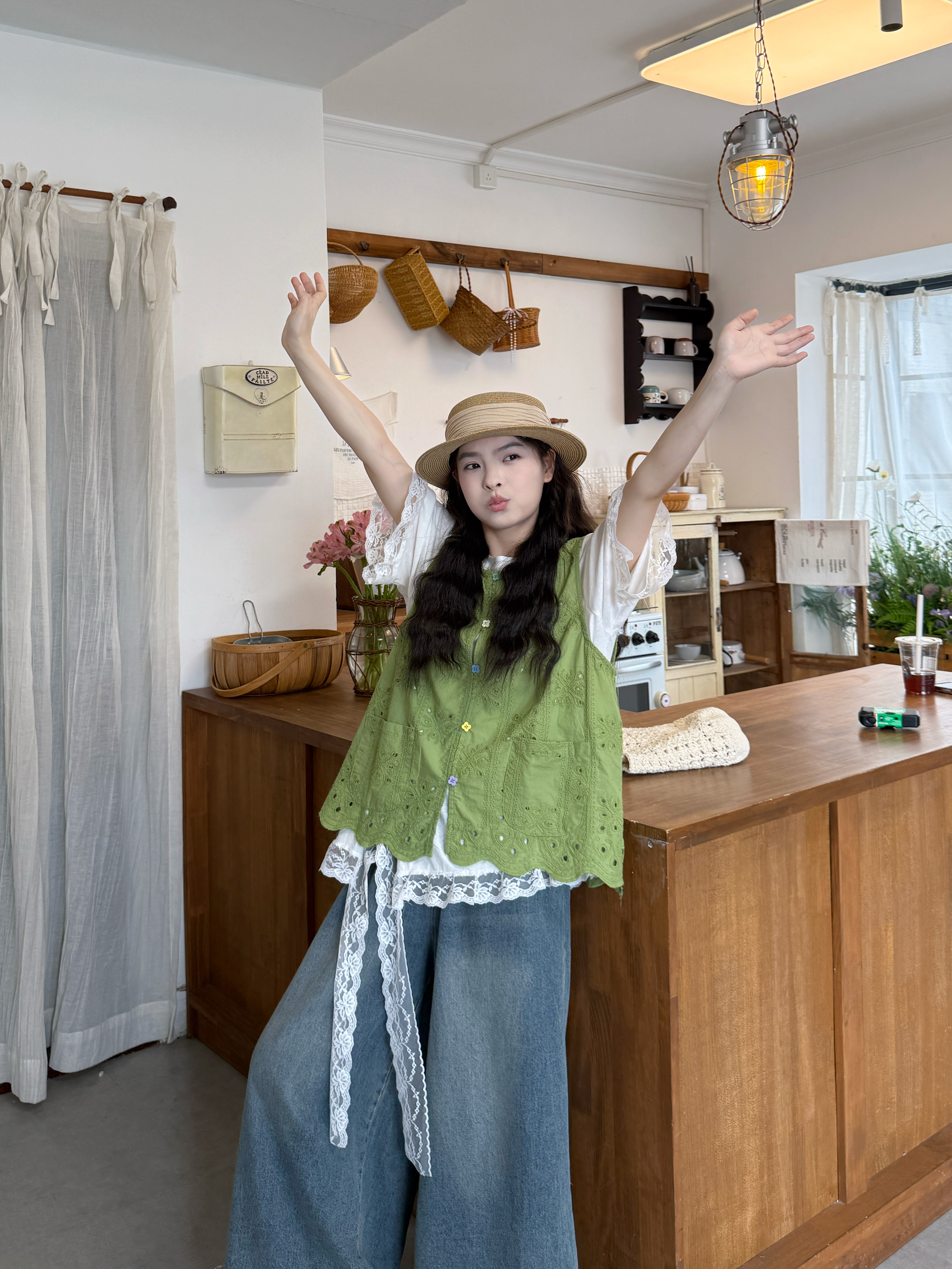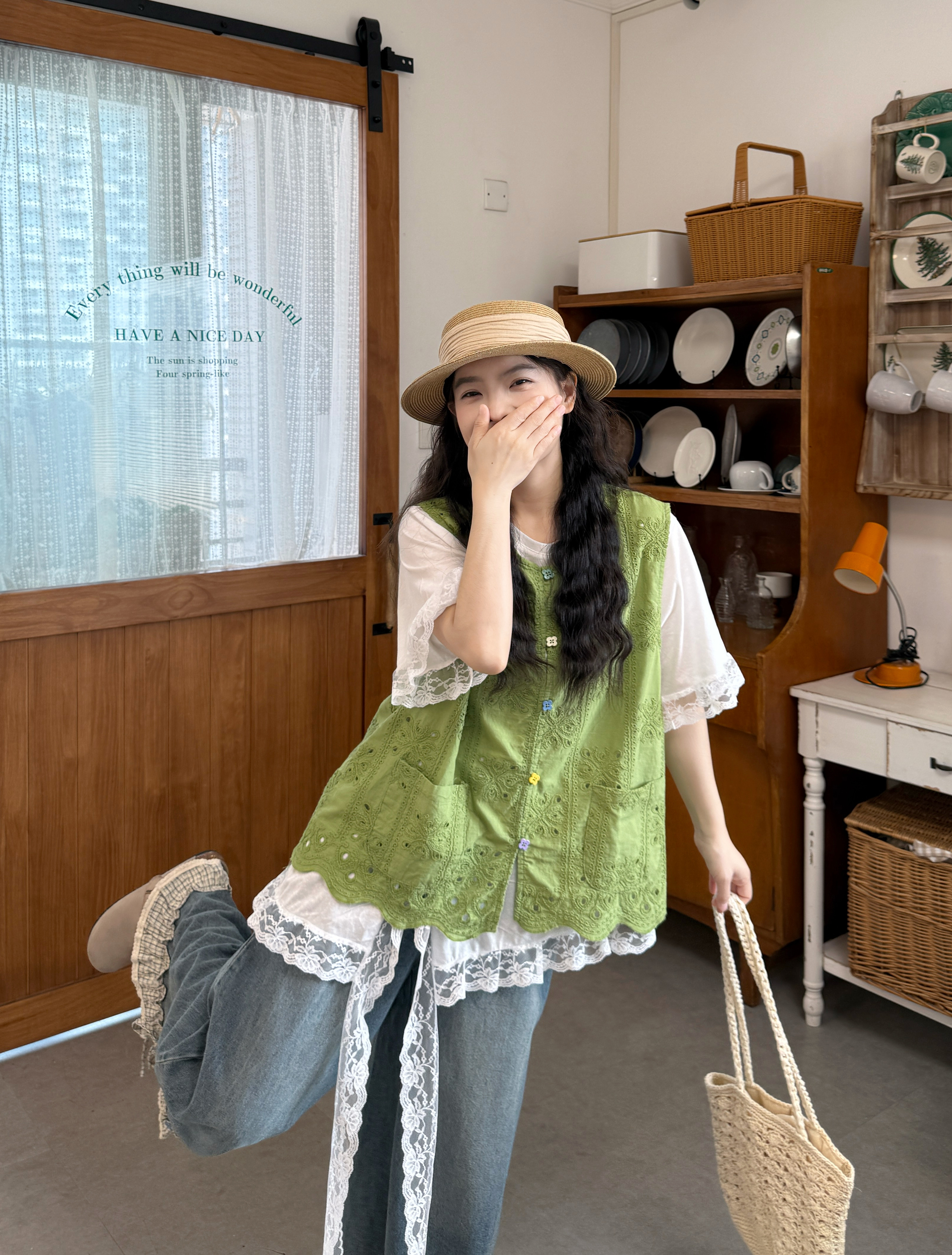 실사 자수 홀로우 아웃 베스트 반팔 만나는 티셔츠 레이스 바지