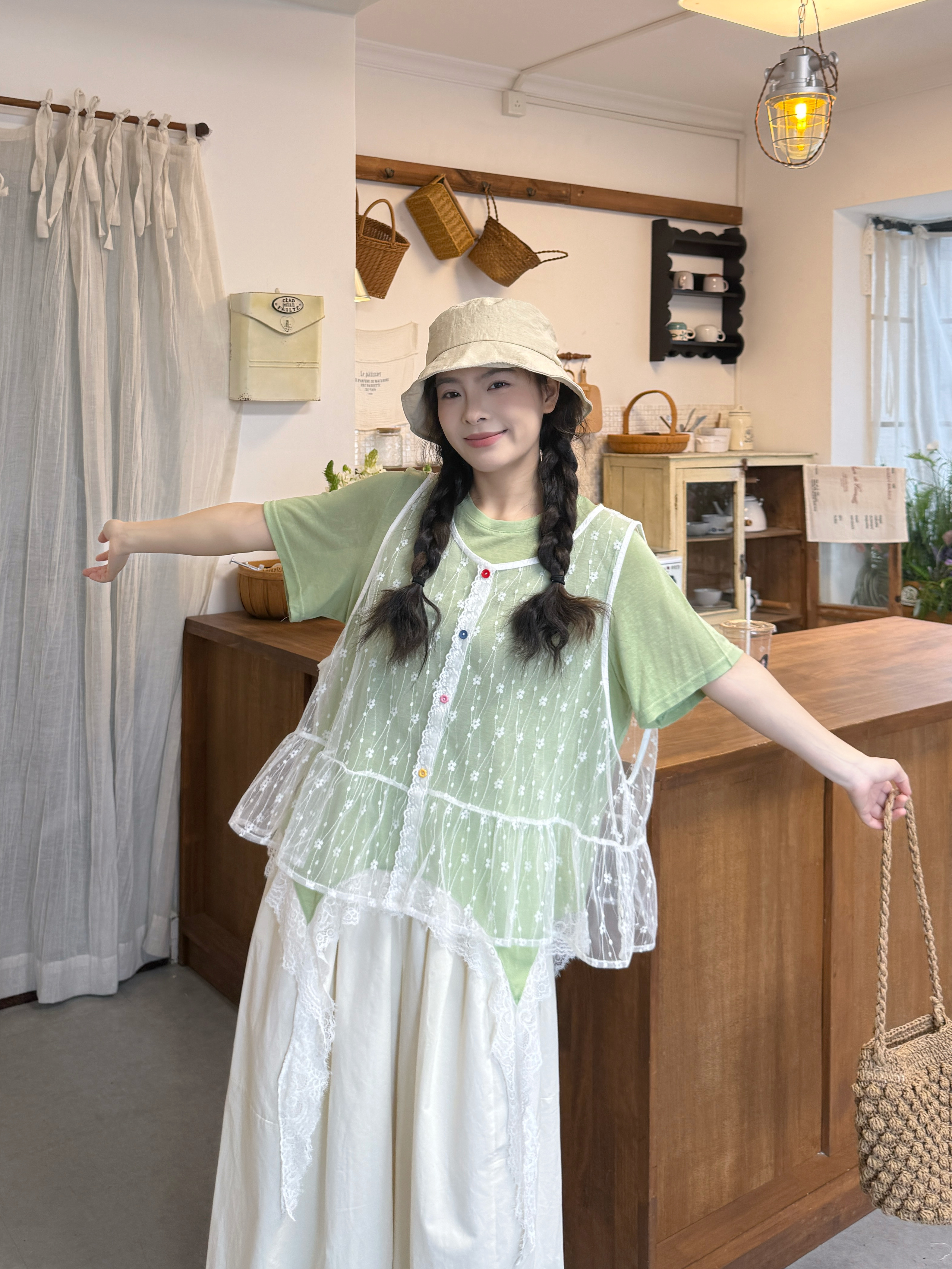 실사 달콤함 스택 착용 망사 베스트 불규칙 만나는 티셔츠 바지