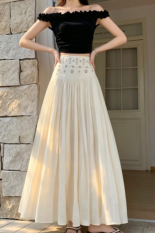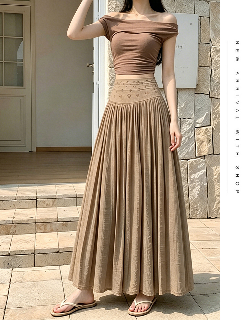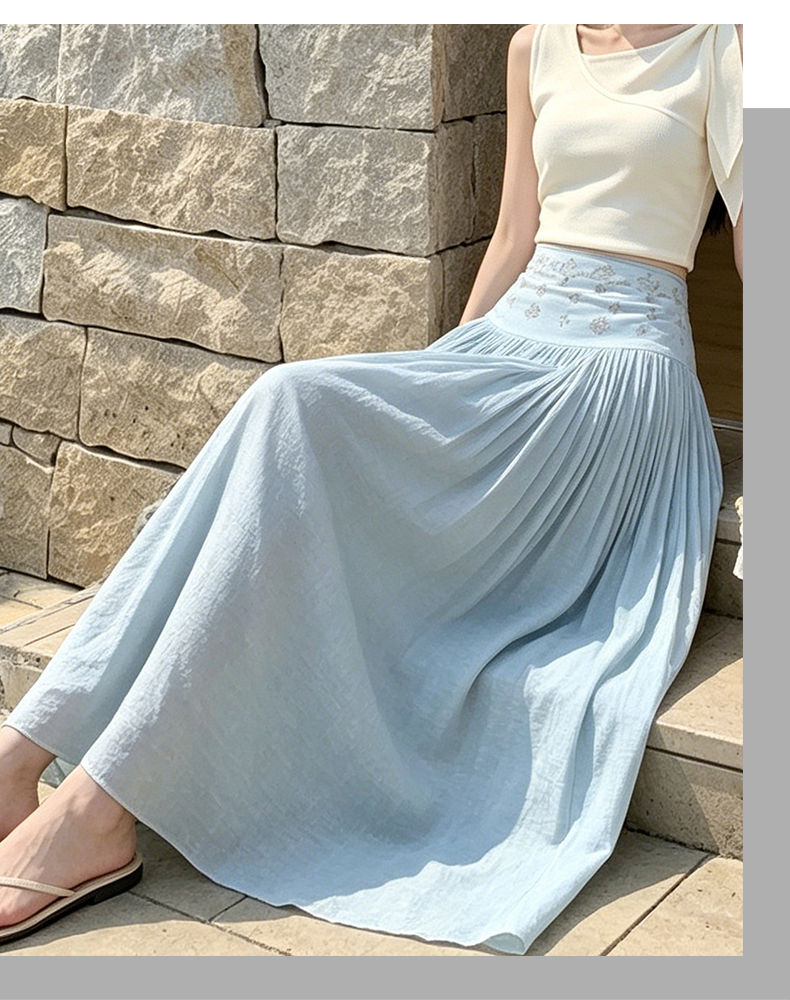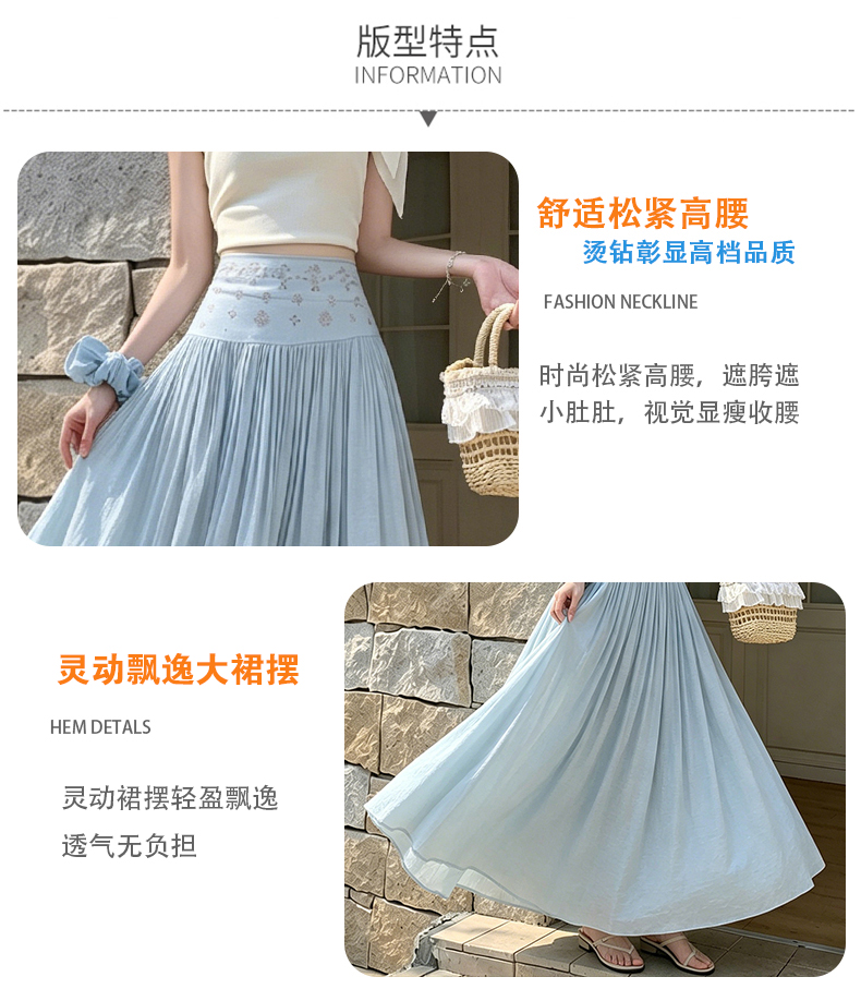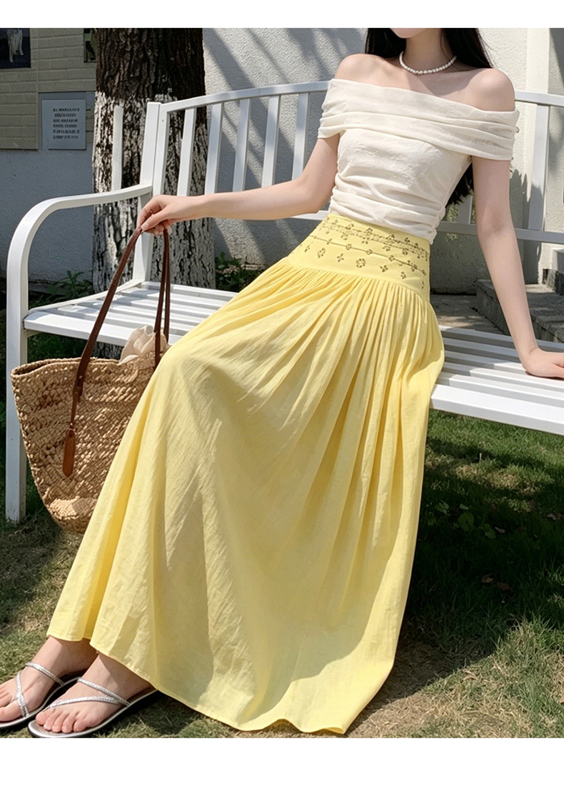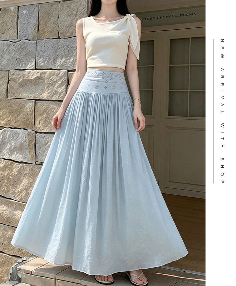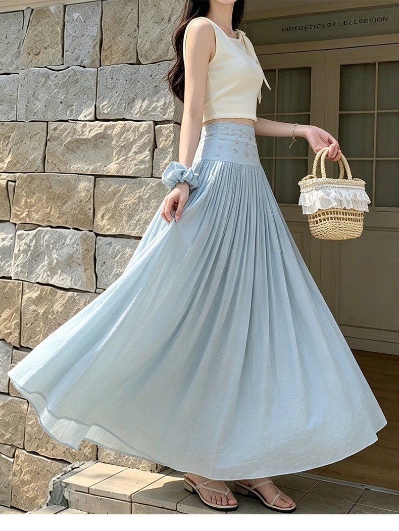 실사 자수 한 마디 반신 스커트 여름 새로운 우아한 슬림해 보이는 중간 길이 표지 넓적 다리 깃발 색상 빅 플레어 스커트 우산 치마
