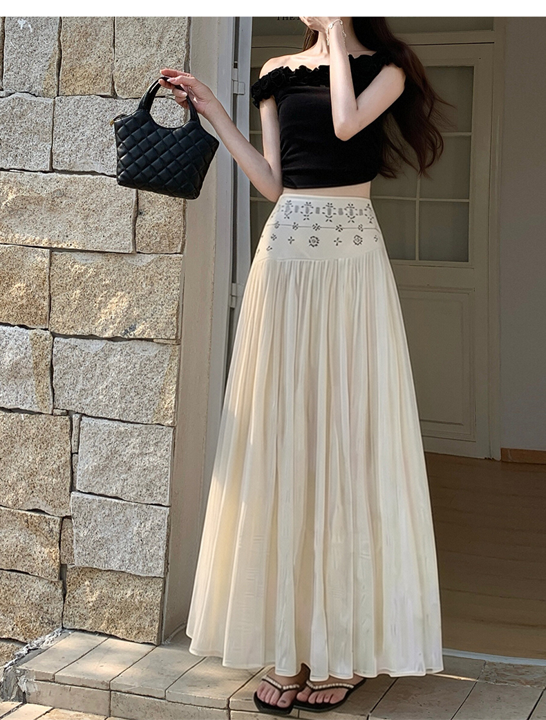 실사 깃발 실 쉬폰 반신 스커트 여성 여름 새로운 구슬 빛 A라인 스커트 무거운 작업 자수 우아한 큰 진자 망사 치마