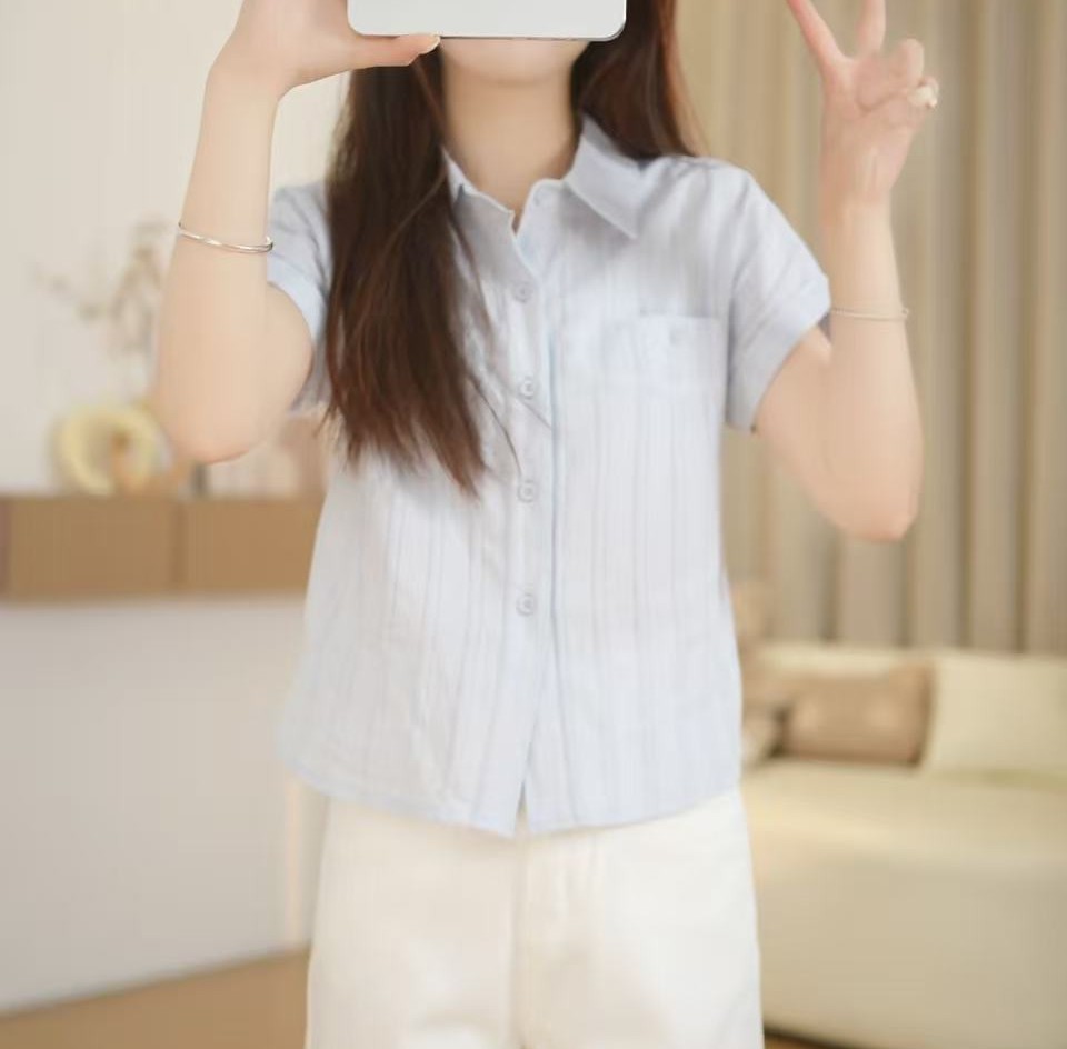 여름 2026 새로운 여성 의류 자카드 순면 여성 셔츠 외국 가스 면 100% 반팔 V넥 작은 키 맨위