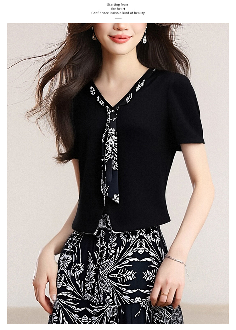 실사 페이크 레이어드 배색 V넥 반팔 2026 여름 새로운 품격 다용도 패션 슬림해 보이는 세트 여성