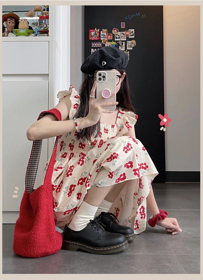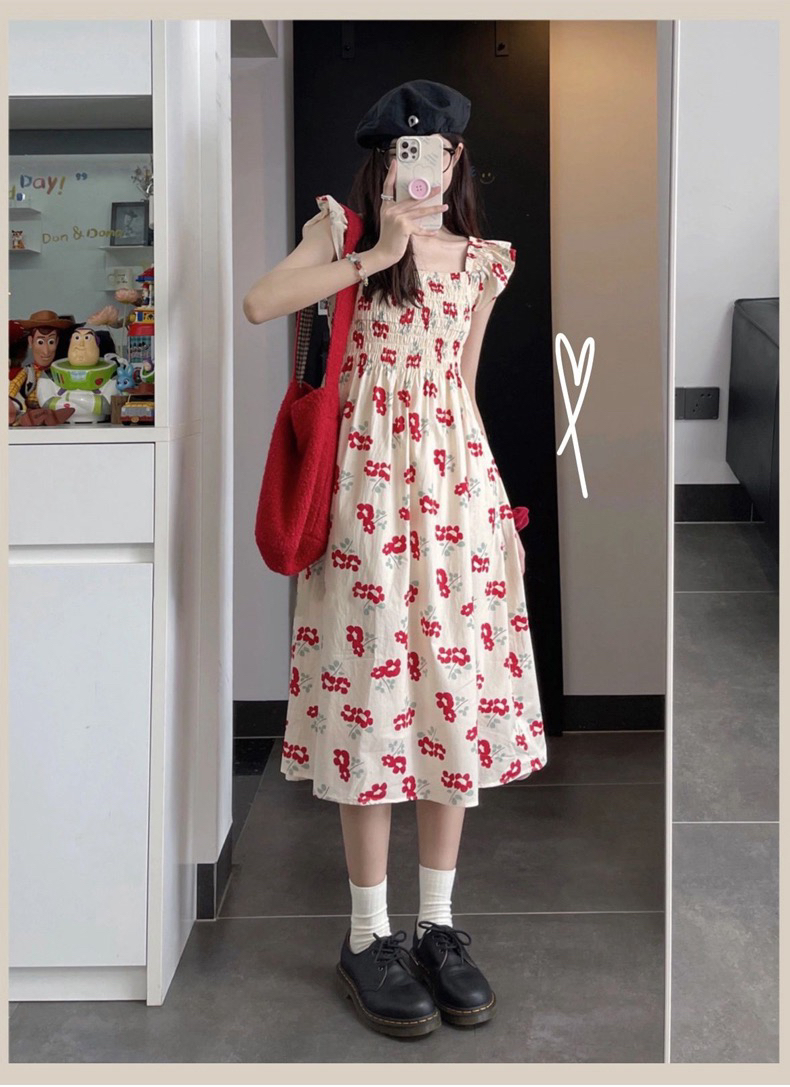 여름 작은 붉은 꽃 꽃무늬 드레스 작은 날다 소매 슬림해 보이는 디스플레이 화이트 첫사랑 소녀 센스 작은 청신 우유 부서 길다 치마