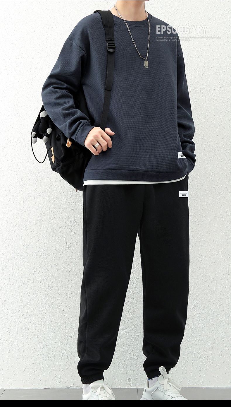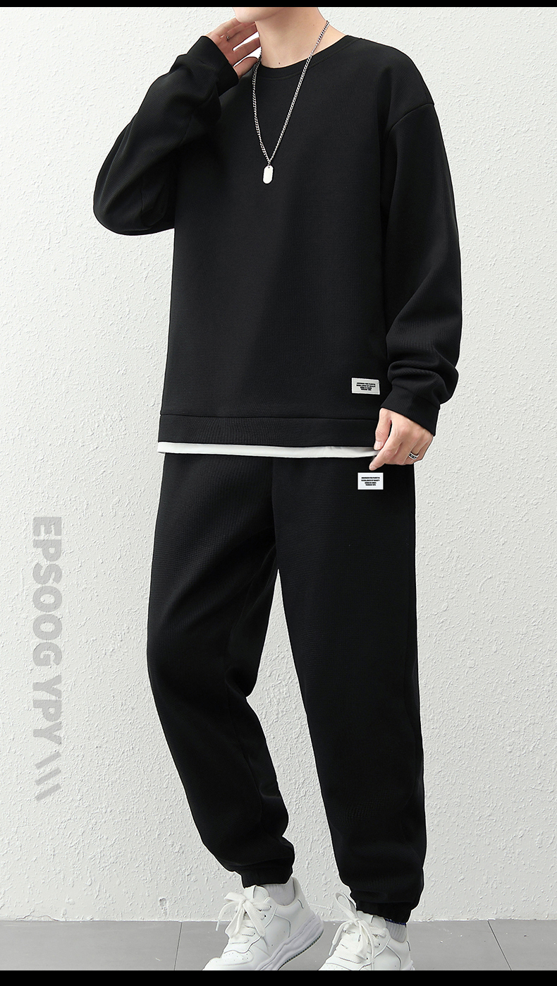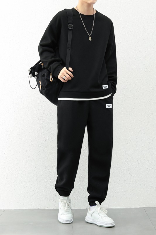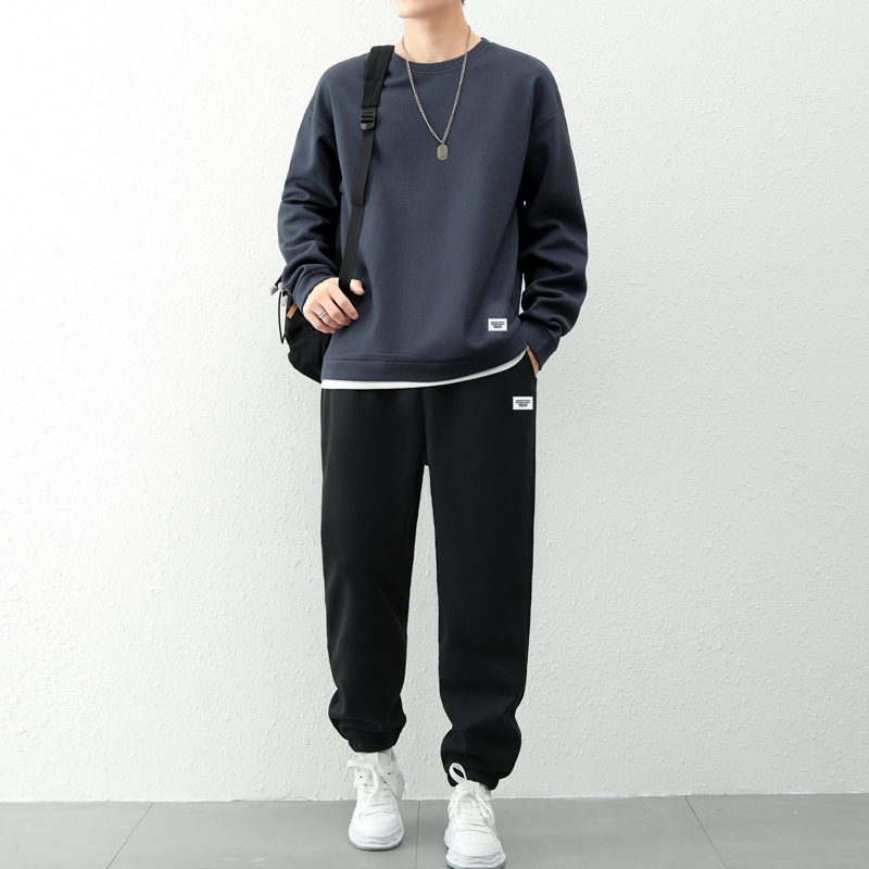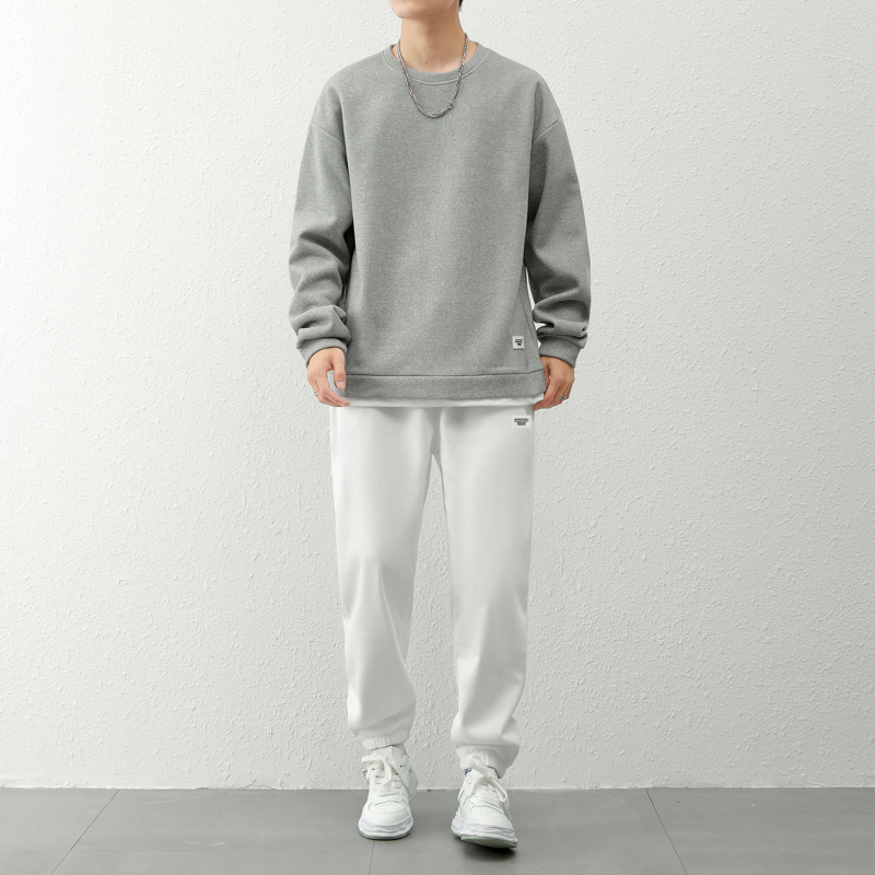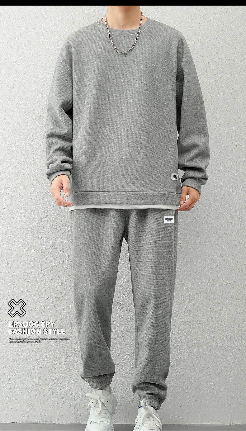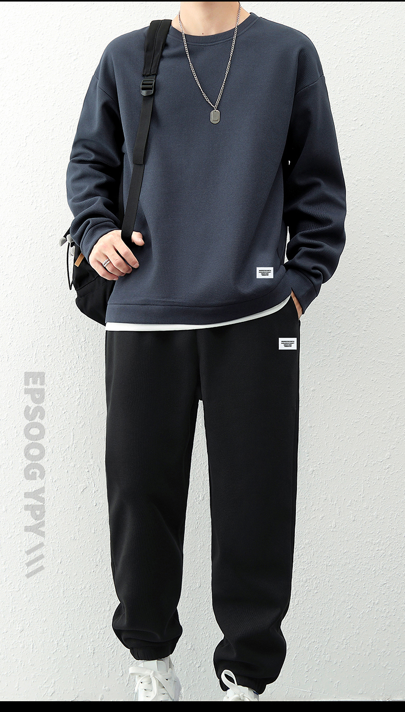 국경 간 봄 가을 겨울 일본식 미니멀리즘 캐주얼 세트 남성 조수 브랜드 루즈핏 다용도 운동 라운드 넥 긴팔 투피스 세트