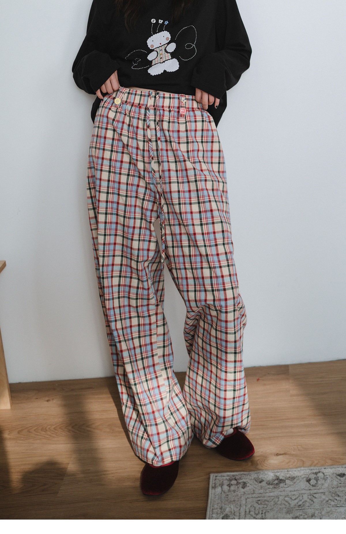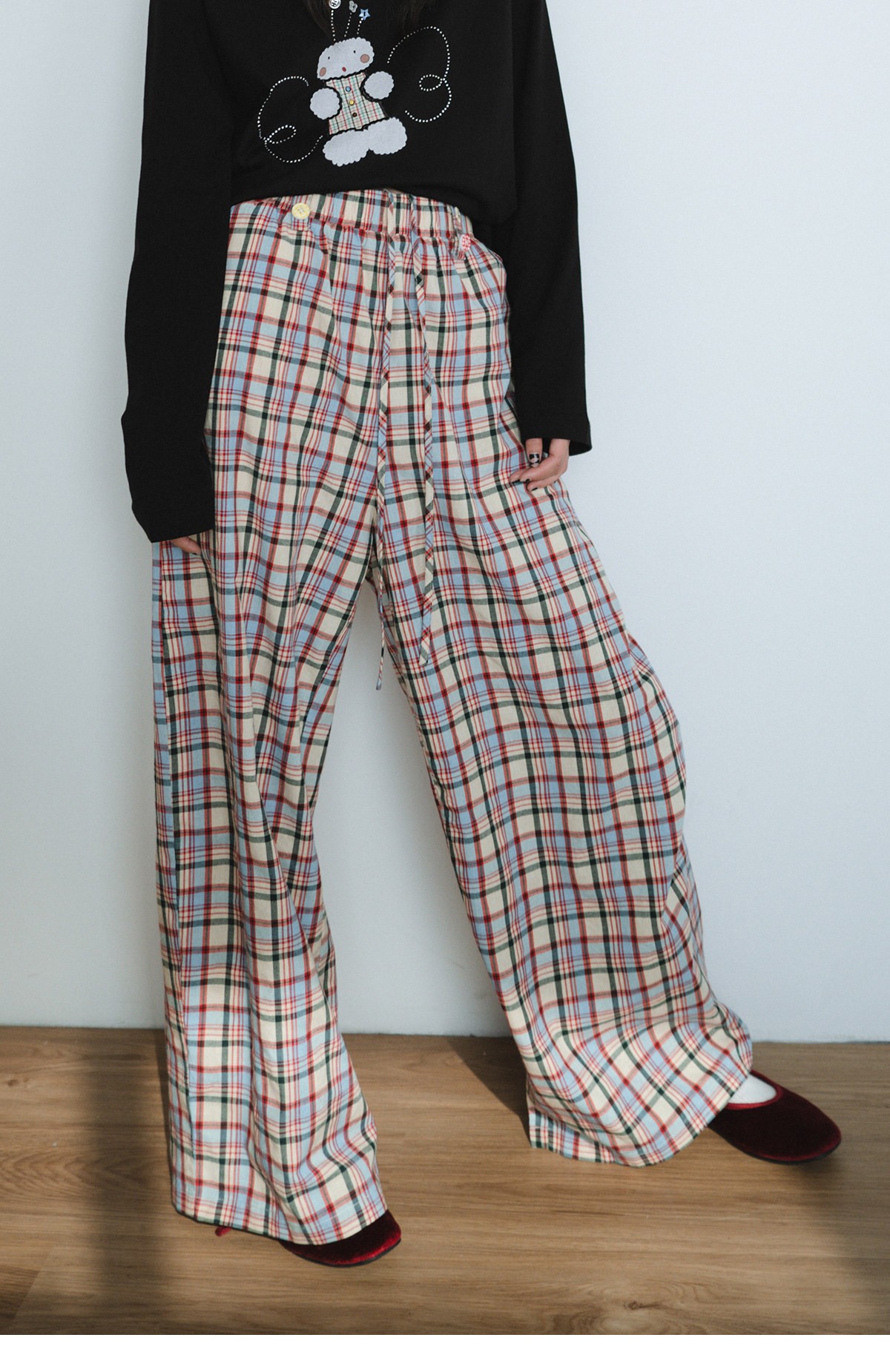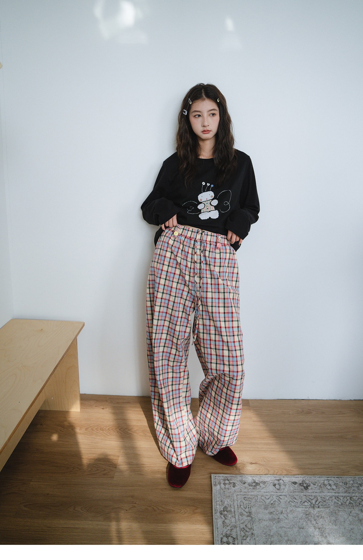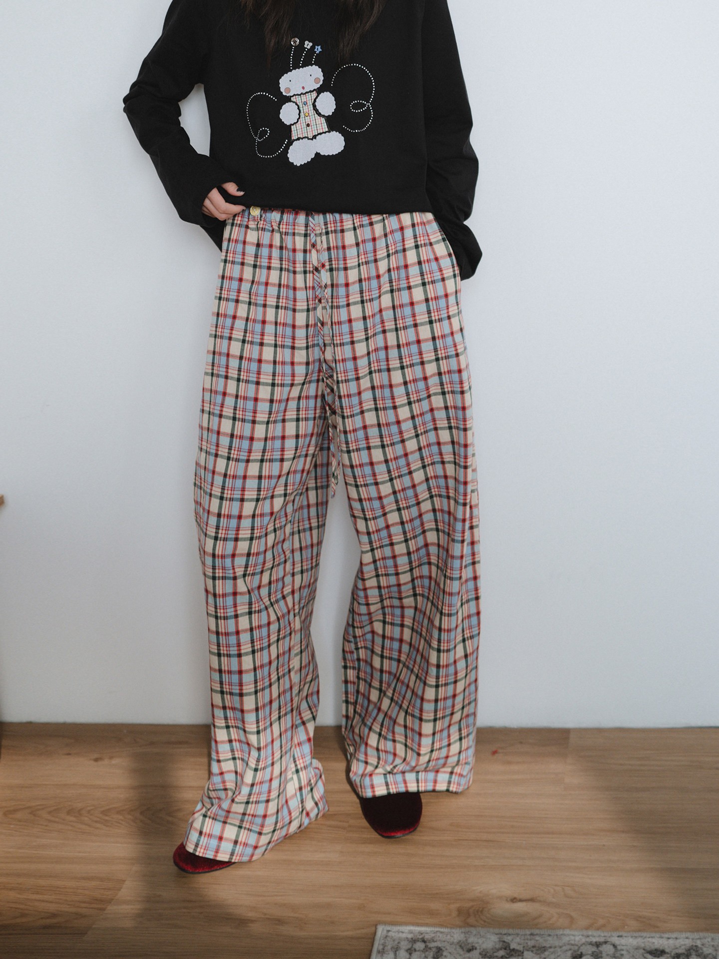 레트로 색상 그리드 하느님 바지 귀여운 단추 장식 디자인 봄 여름 루즈핏 슬림해 보이는 얇은 스타일 허리밴드 캐주얼 바지 여성