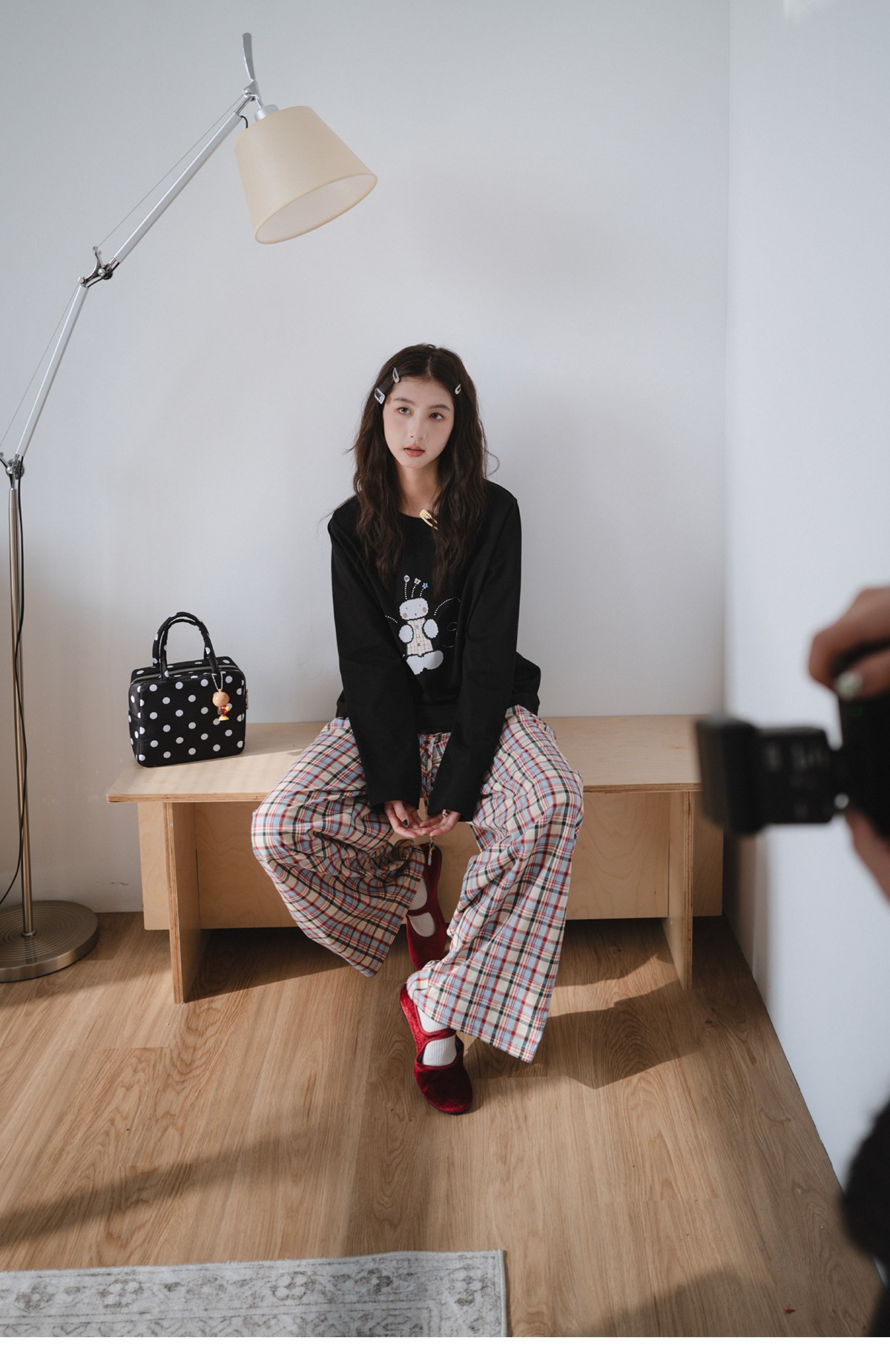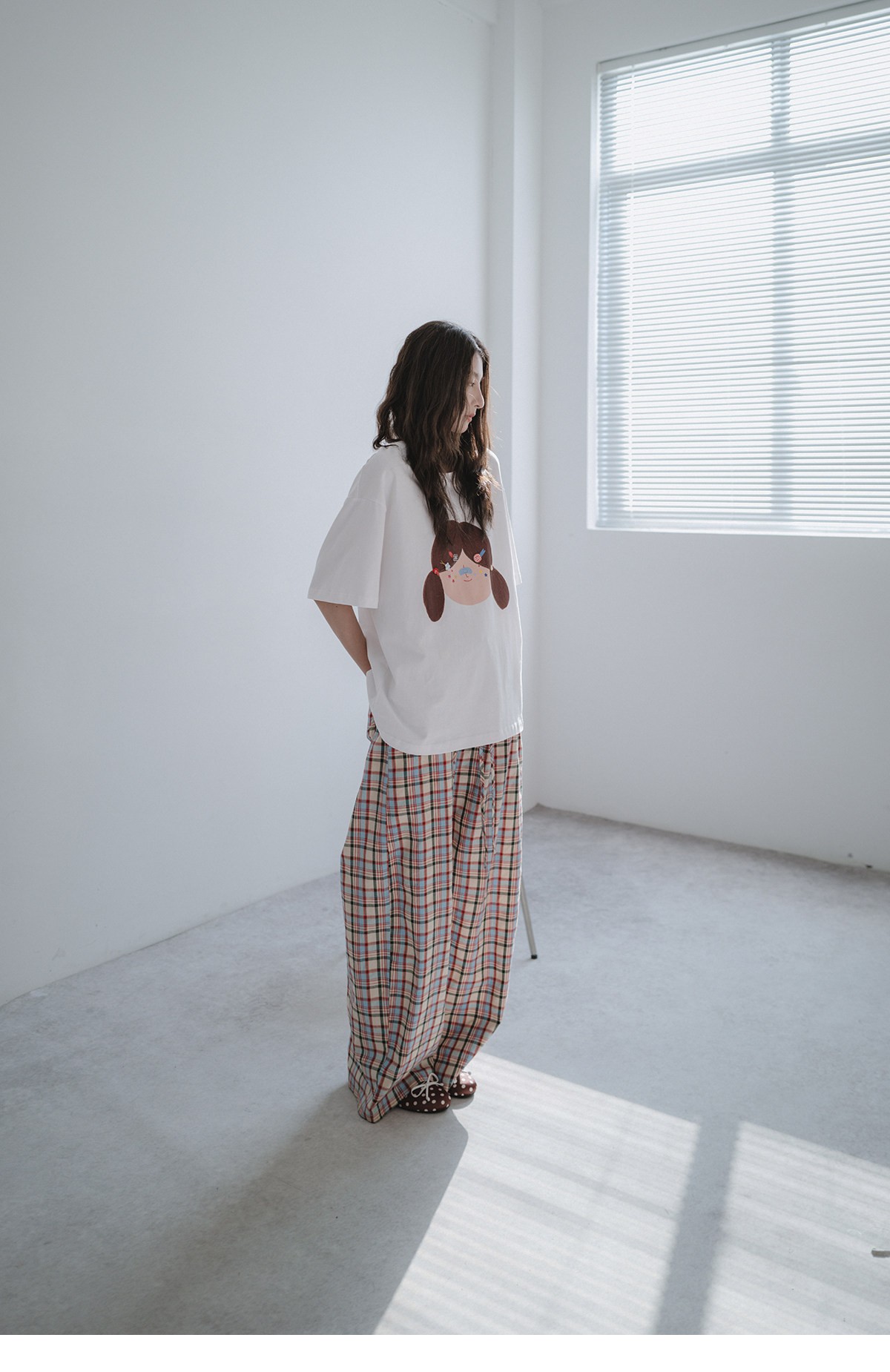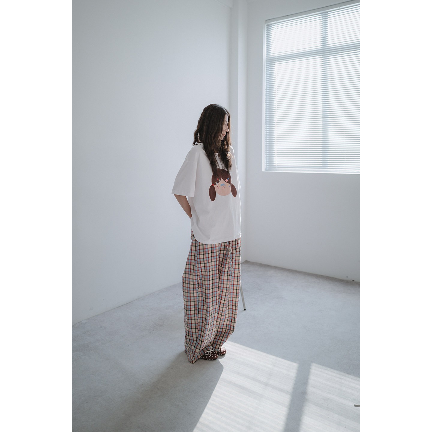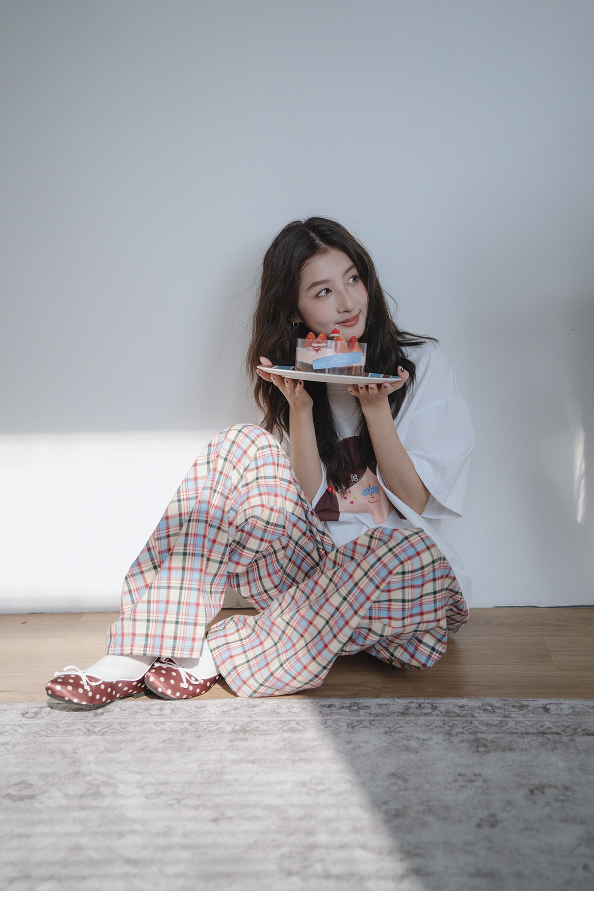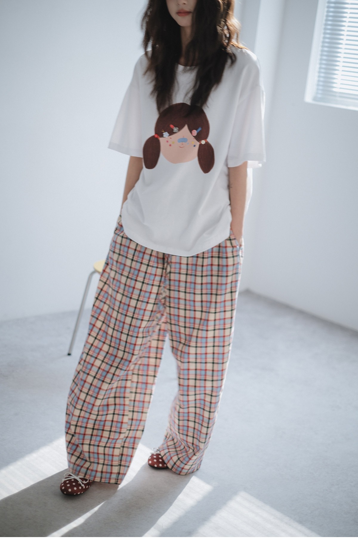 레트로 색상 그리드 하느님 바지 귀여운 단추 장식 디자인 봄 여름 루즈핏 슬림해 보이는 얇은 스타일 허리밴드 캐주얼 바지 여성