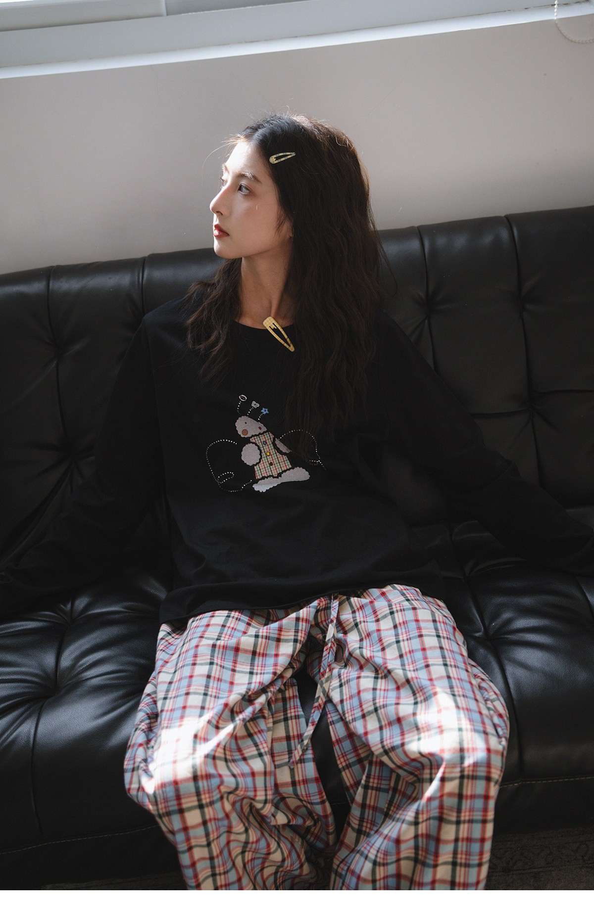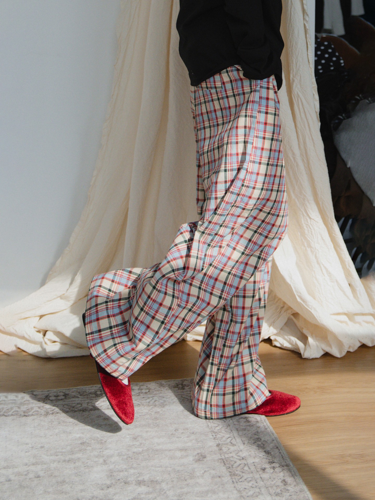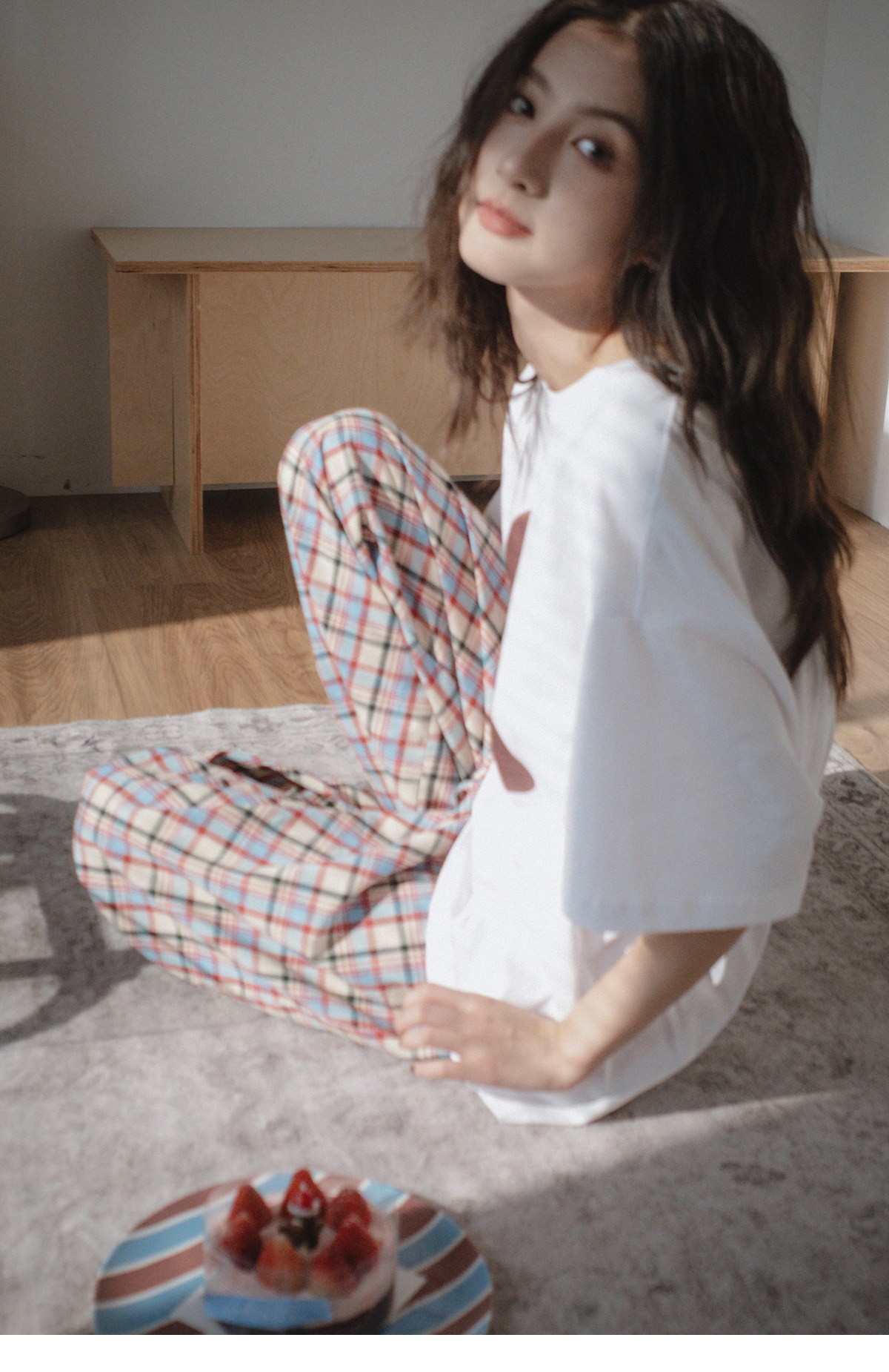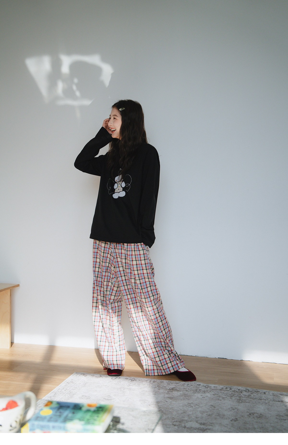 레트로 색상 그리드 하느님 바지 귀여운 단추 장식 디자인 봄 여름 루즈핏 슬림해 보이는 얇은 스타일 허리밴드 캐주얼 바지 여성
