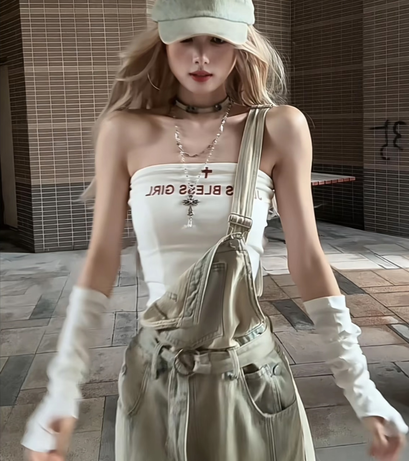 A 나이 나이 맑은 마음 작은 여름 새로운 우유 화이트 알파벳 튜브탑 맨위 레트로 데님 무용 세트 멜빵