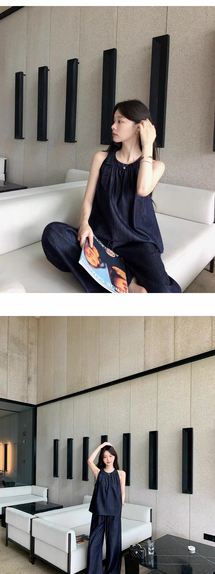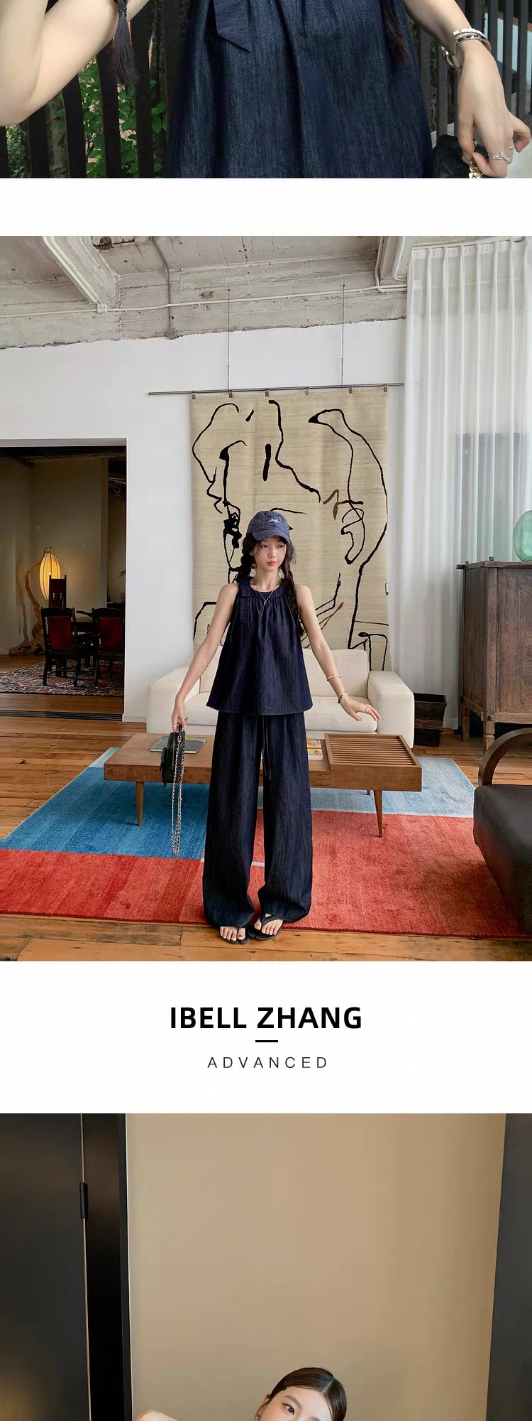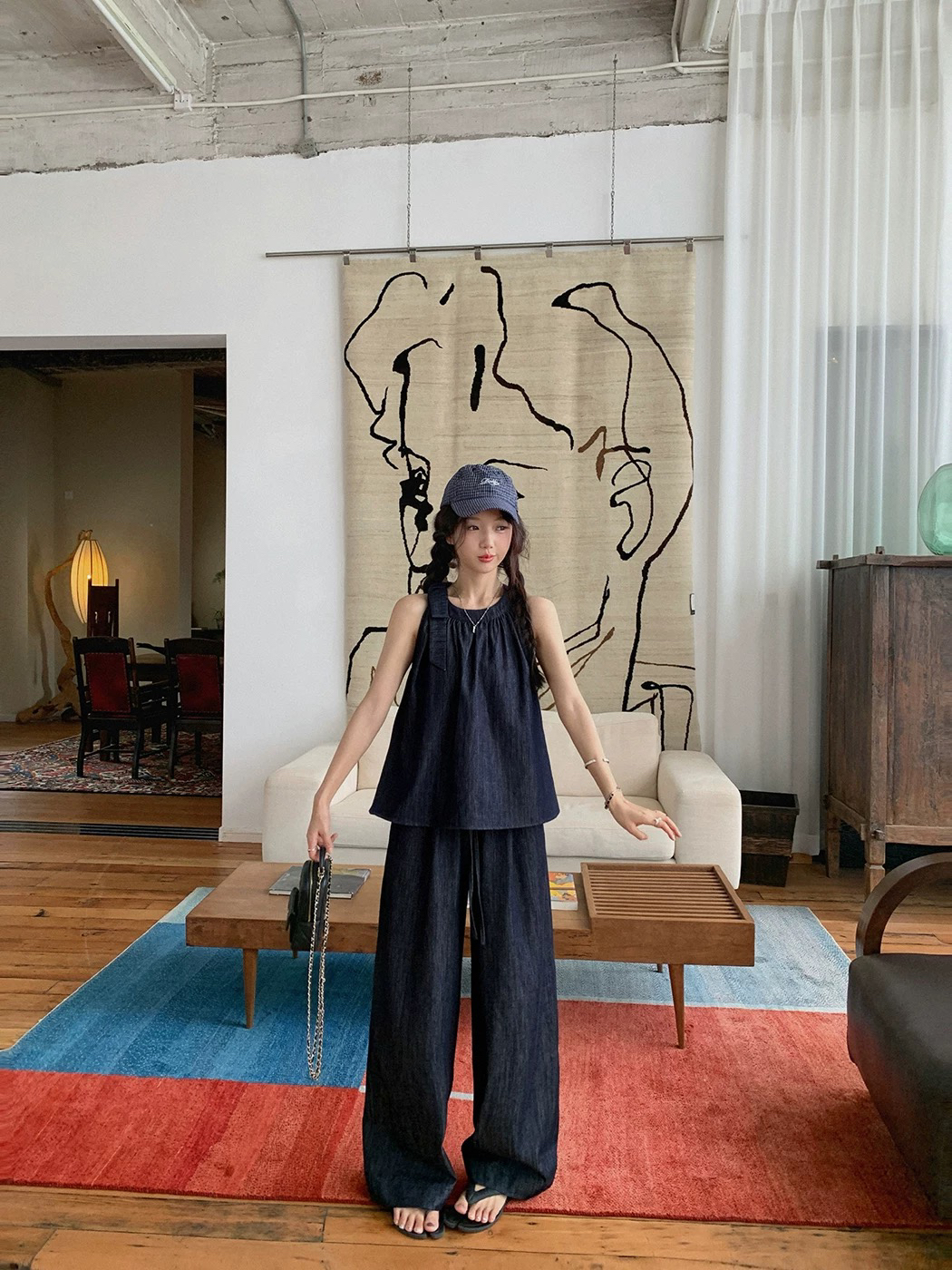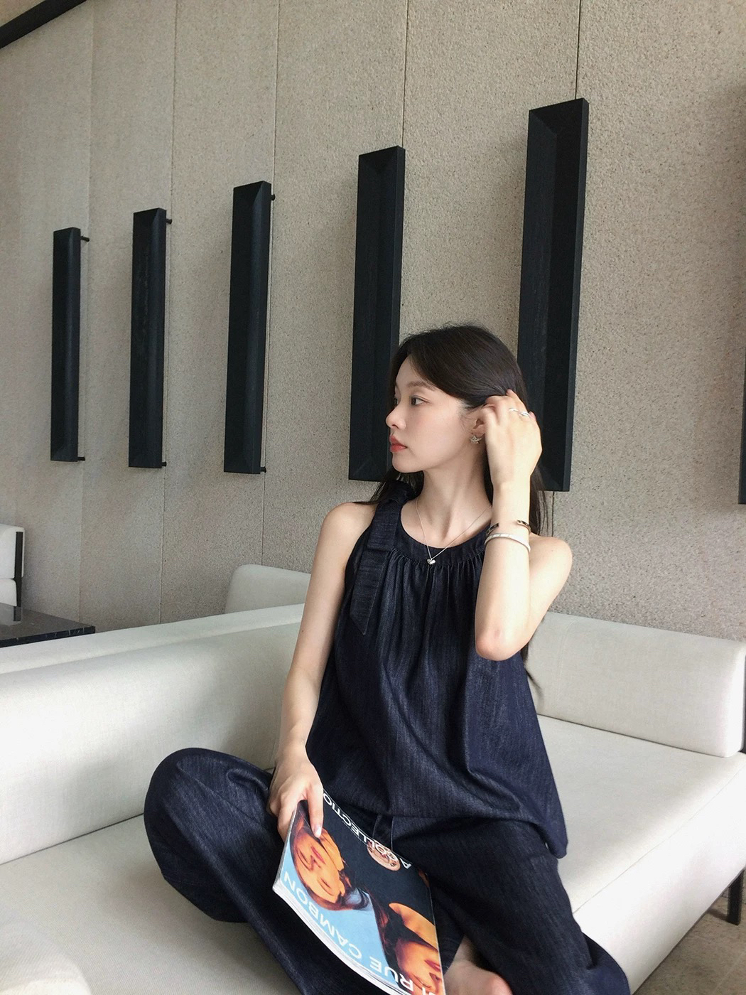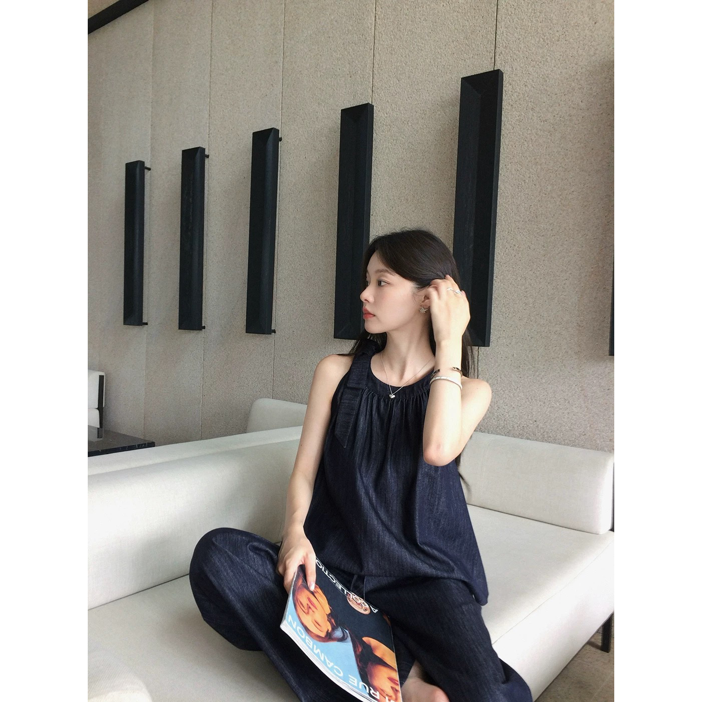 레트로 나비 매듭 행침 목 데님 조끼 캐주얼 와이드 레그 팬츠 두 조각 여성 세트 2026 여름 ootd 착용 가져 가라. 세트