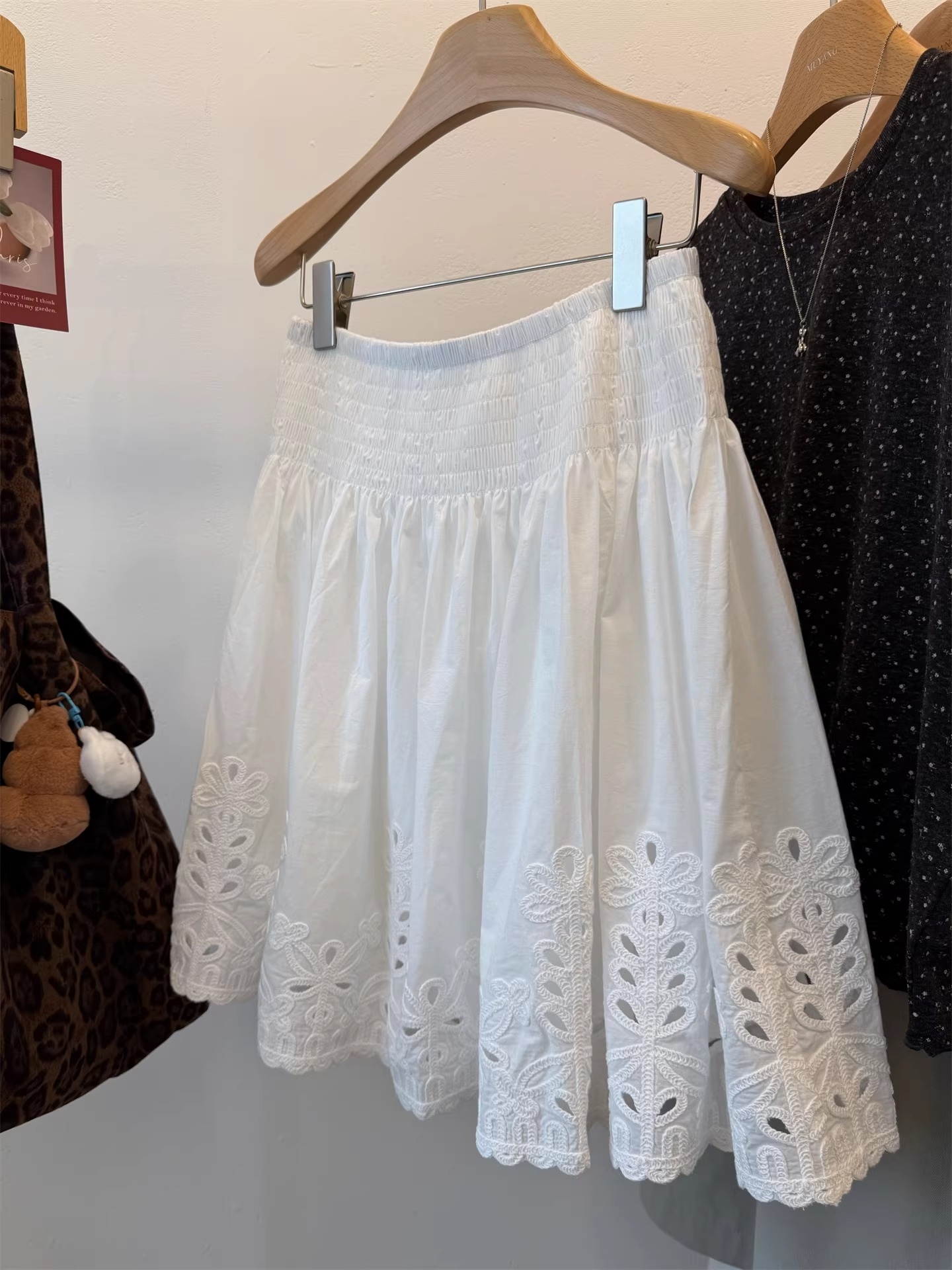 한국 명중 가져 가라. 허리밴드 디자인 3 차원 홀로우 아웃 지점 자수 반신 스커트 화이트 한 마디 우산 치마