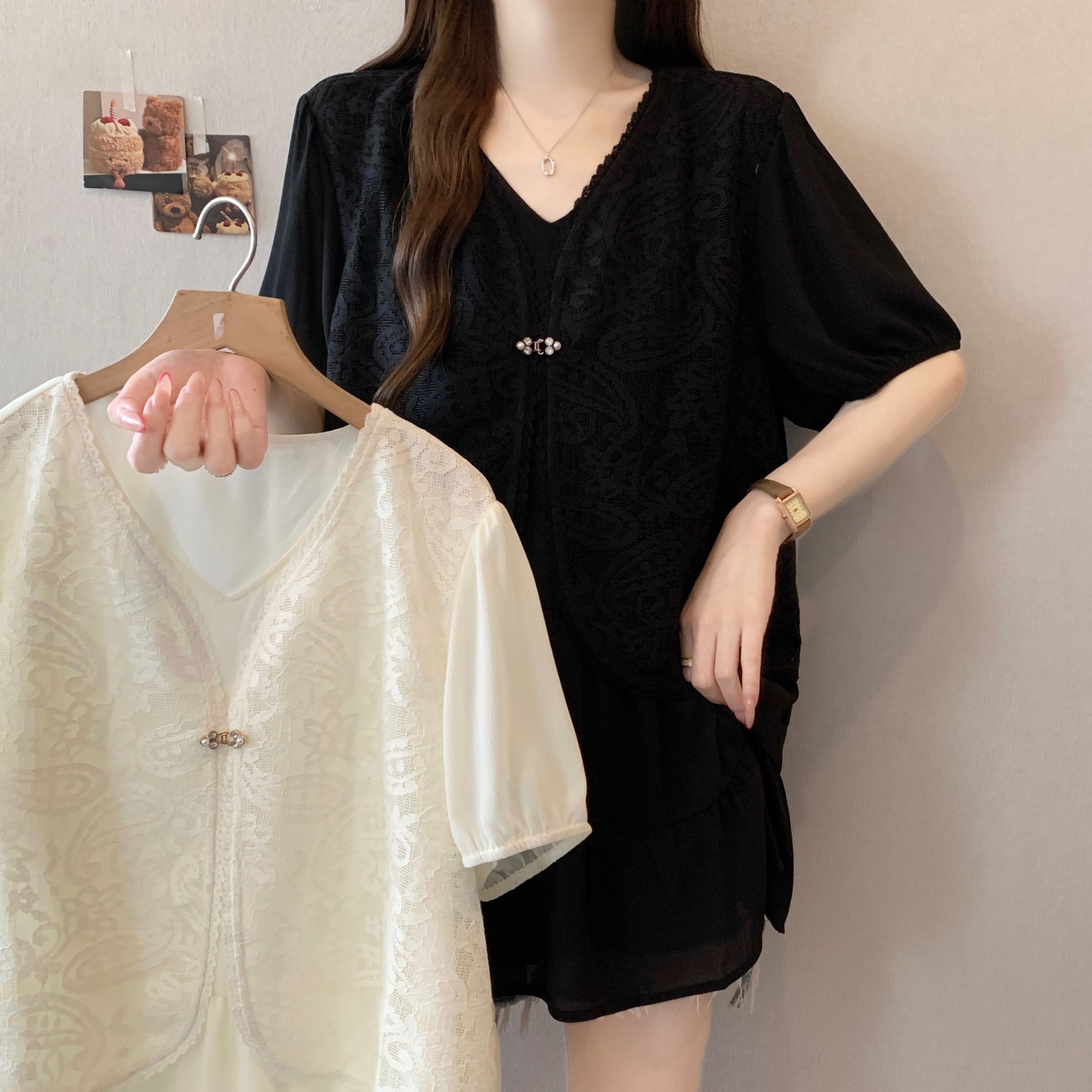 빅 사이즈 지방 mm 여름 새로운 페이크 레이어드 레이스 조각 쉬폰 블라우스 루즈핏 표지 배 슬림해 보이는 셔츠 여성