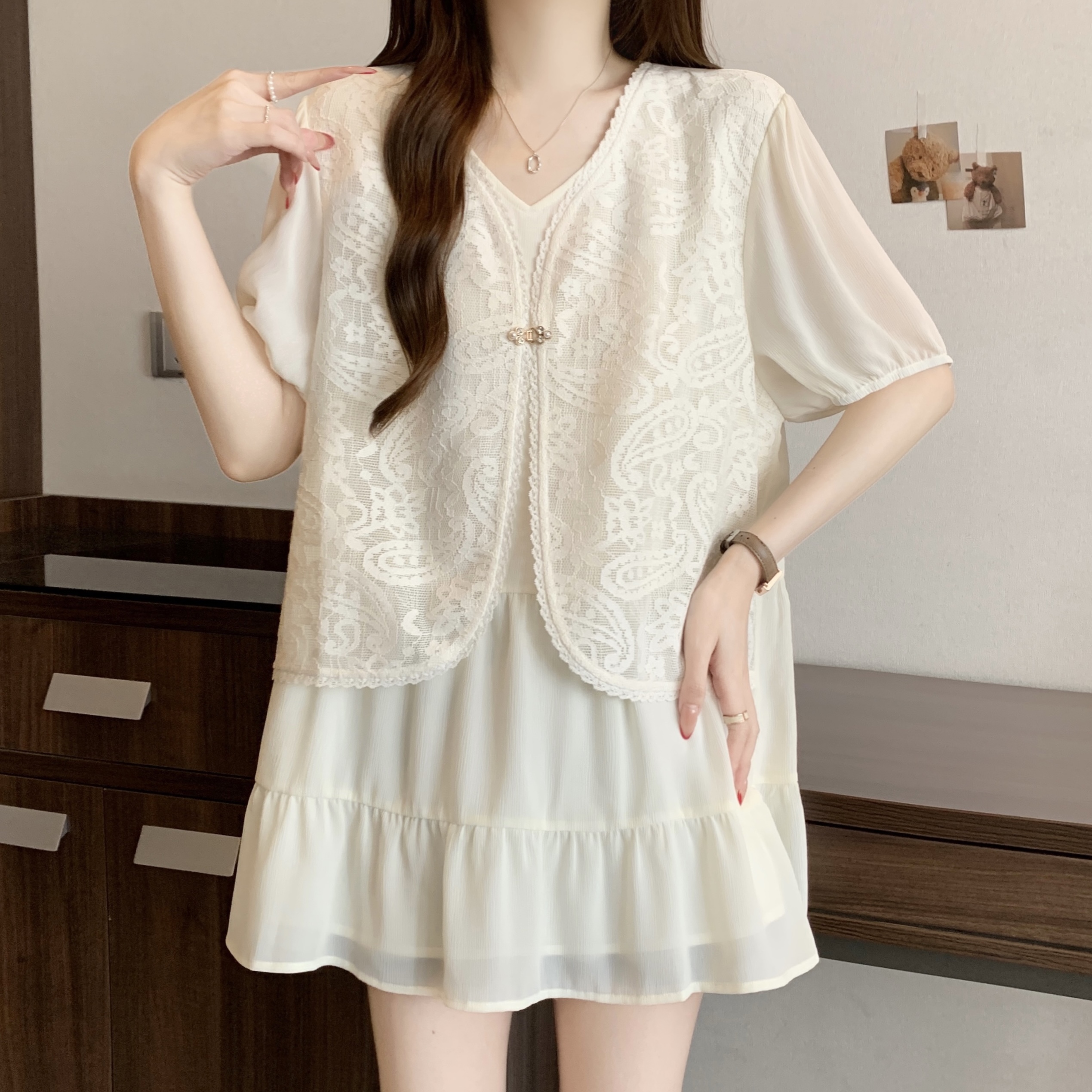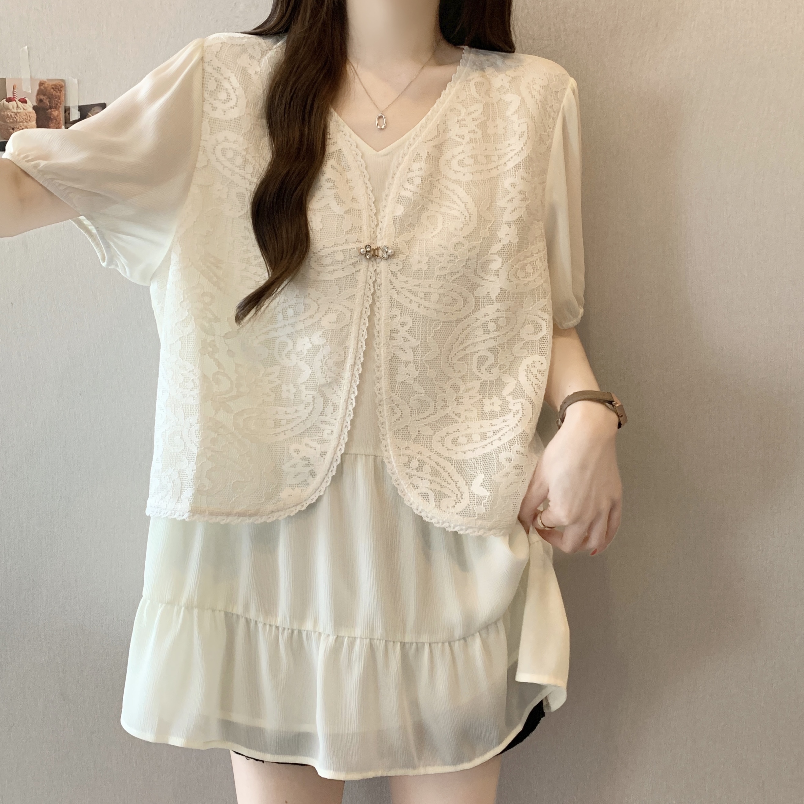 빅 사이즈 지방 mm 여름 새로운 페이크 레이어드 레이스 조각 쉬폰 블라우스 루즈핏 표지 배 슬림해 보이는 셔츠 여성