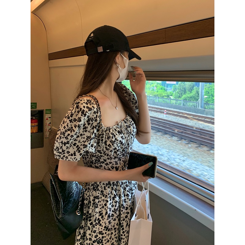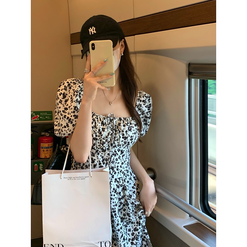 실사 정가 한국 스타일 흑인과 백인 꽃무늬 부드러운 부서 착용 가져 가라. 디자인 거품 소매 트임 롱 스커트